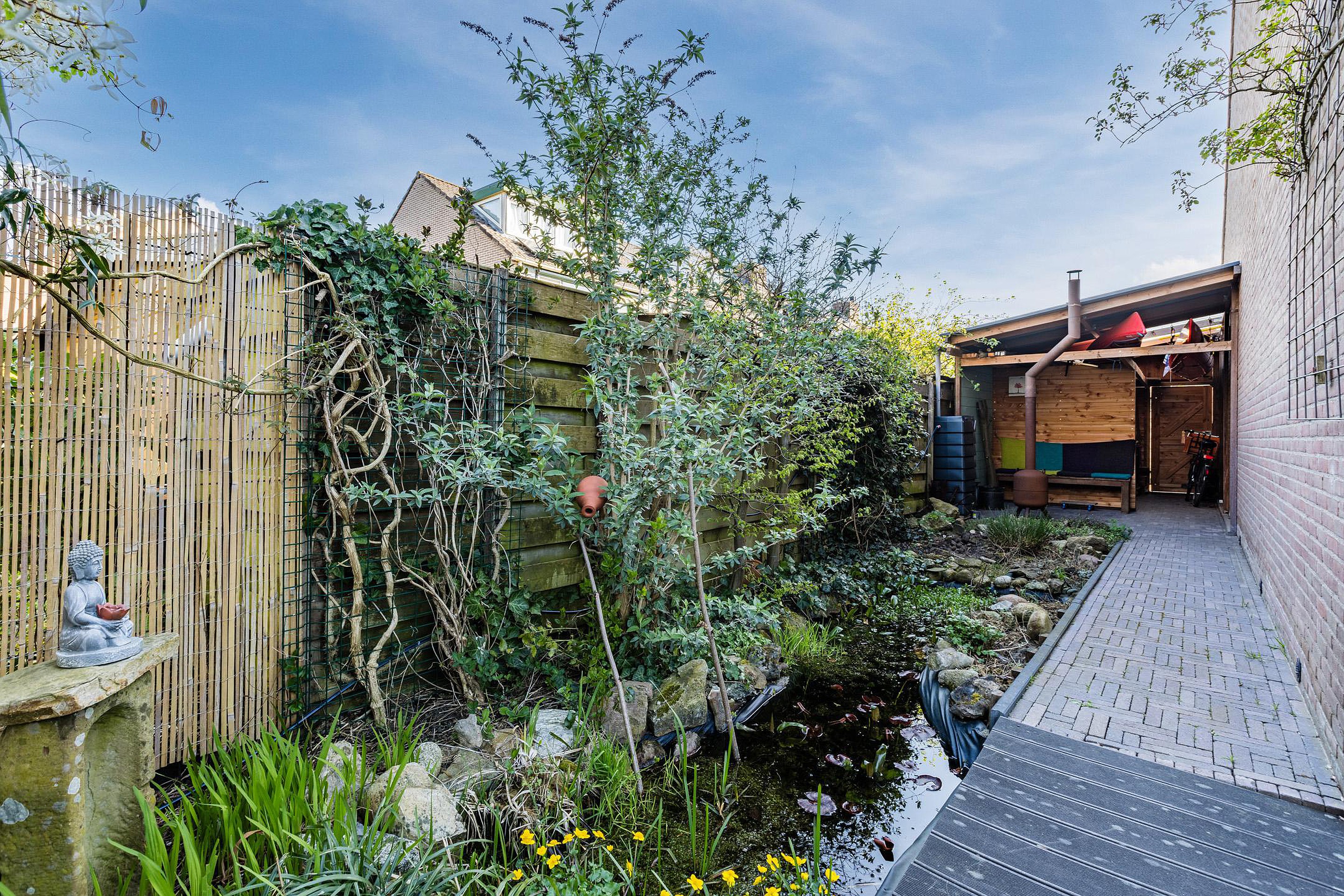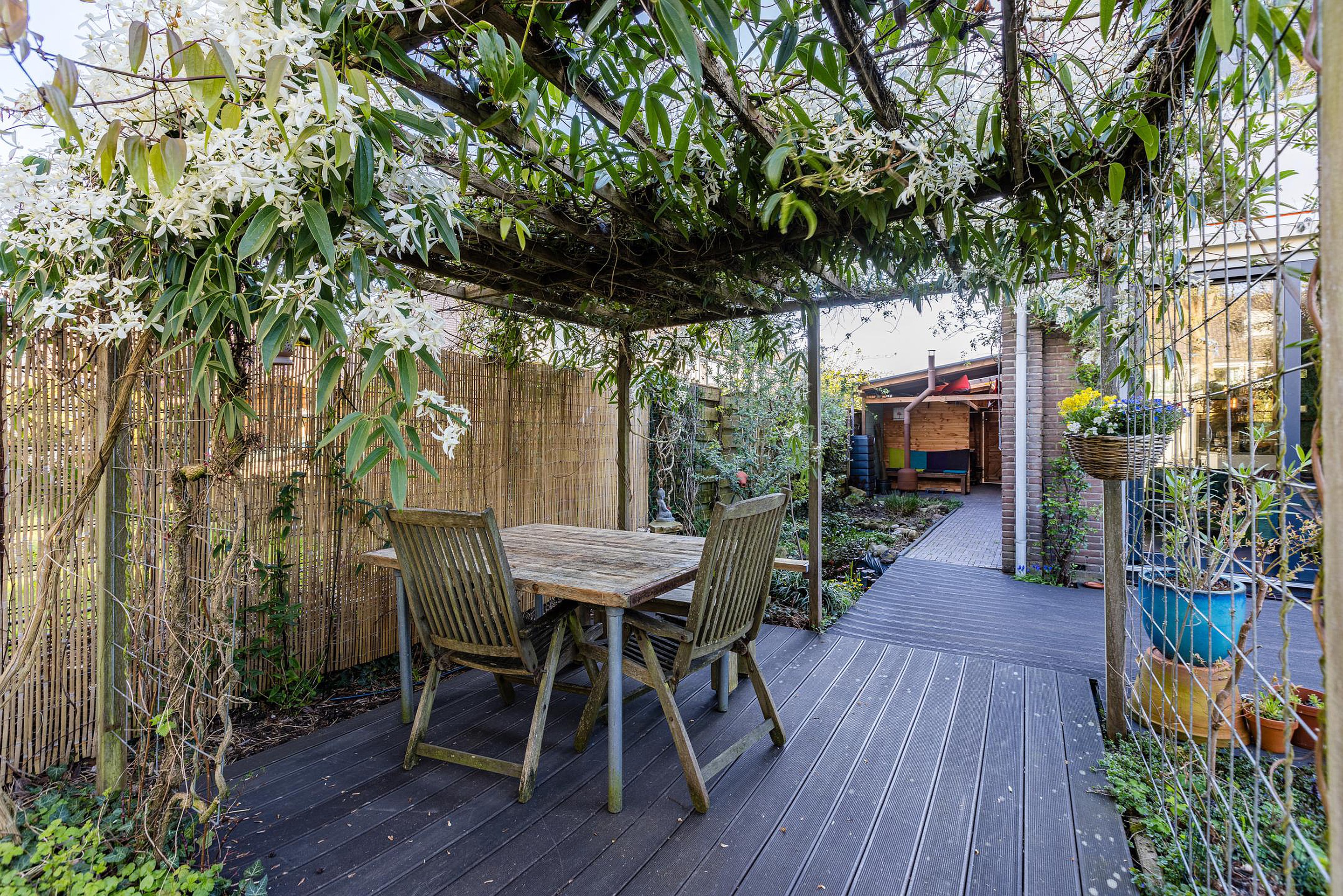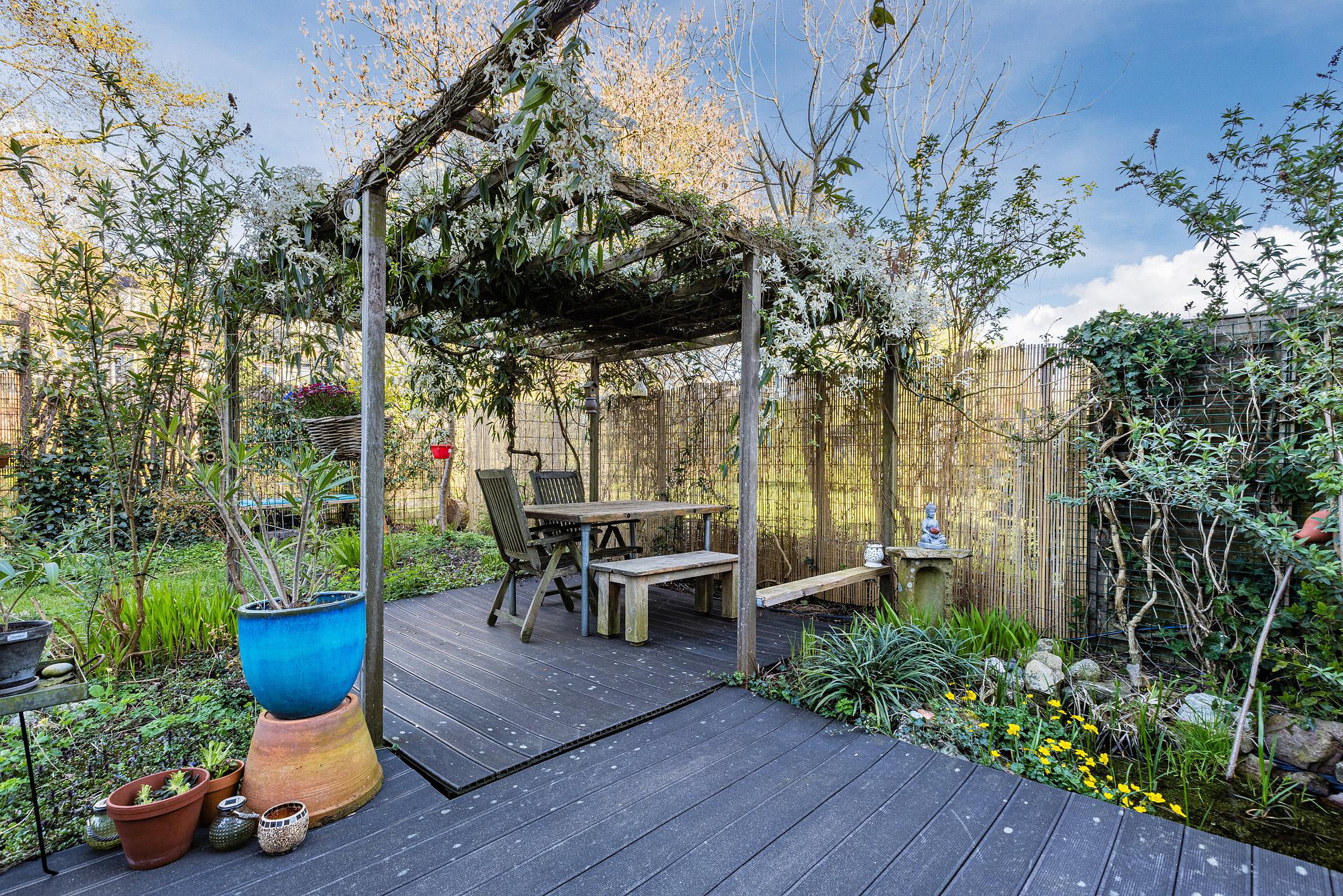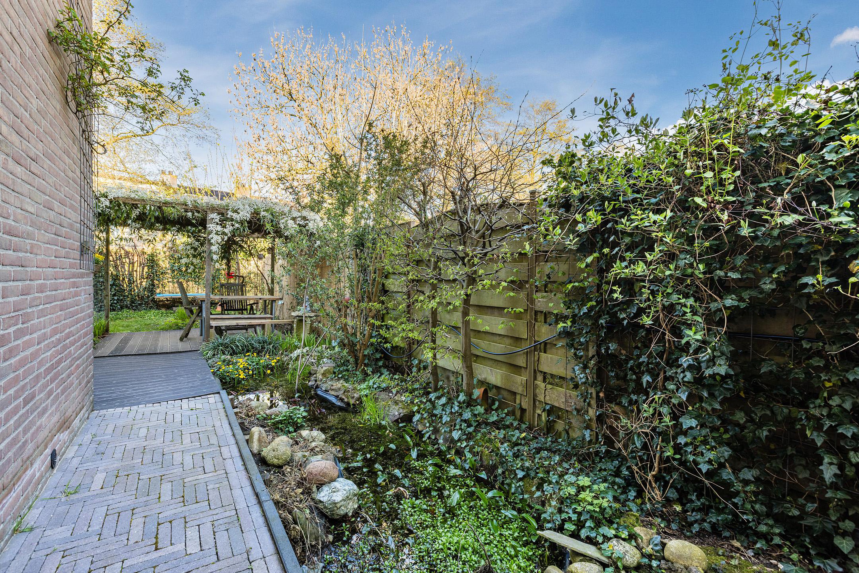 De riante zonnige achtertuin ligt op het westen en heeft veel privacy, een vijver en een prachtig begroeide pergola.