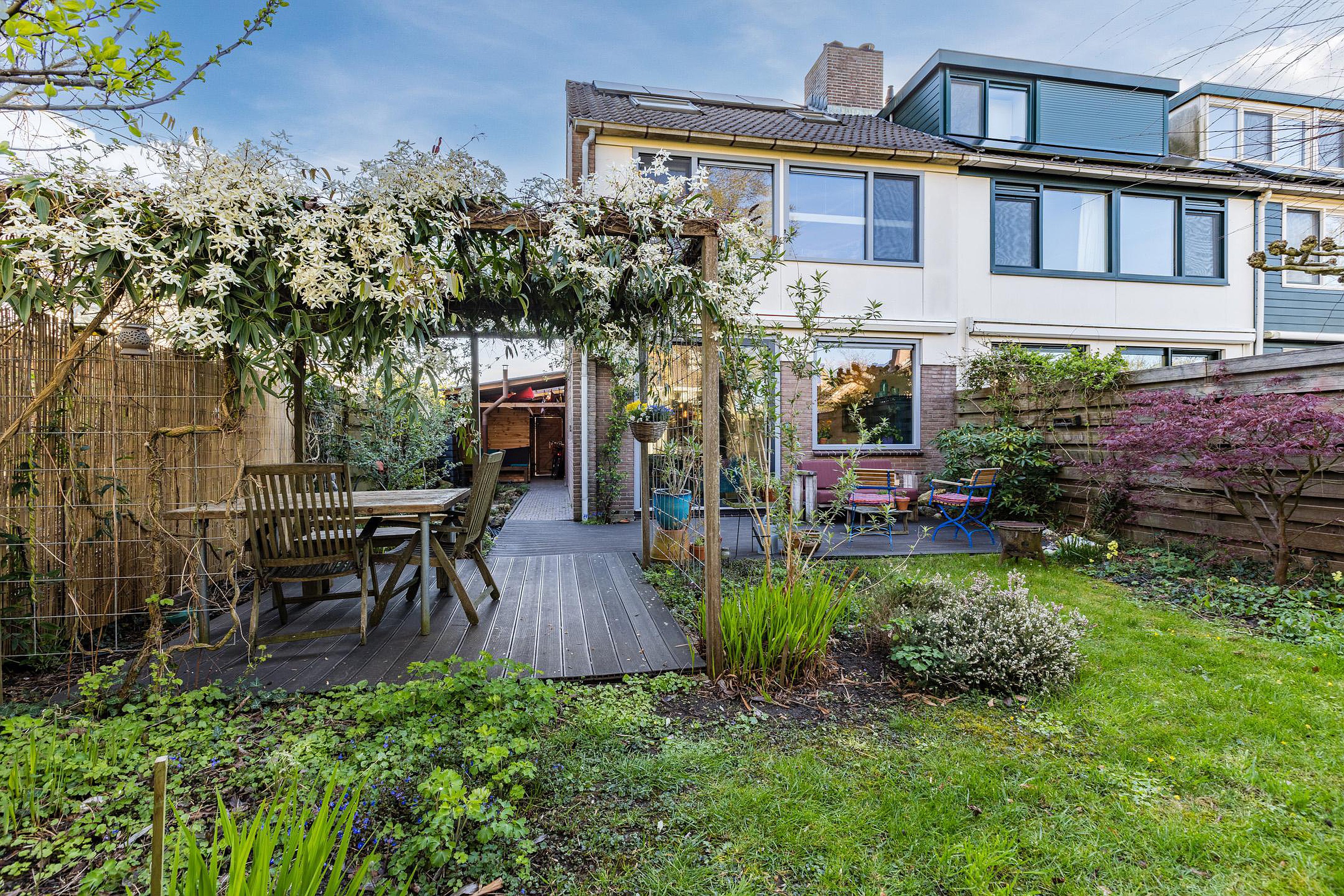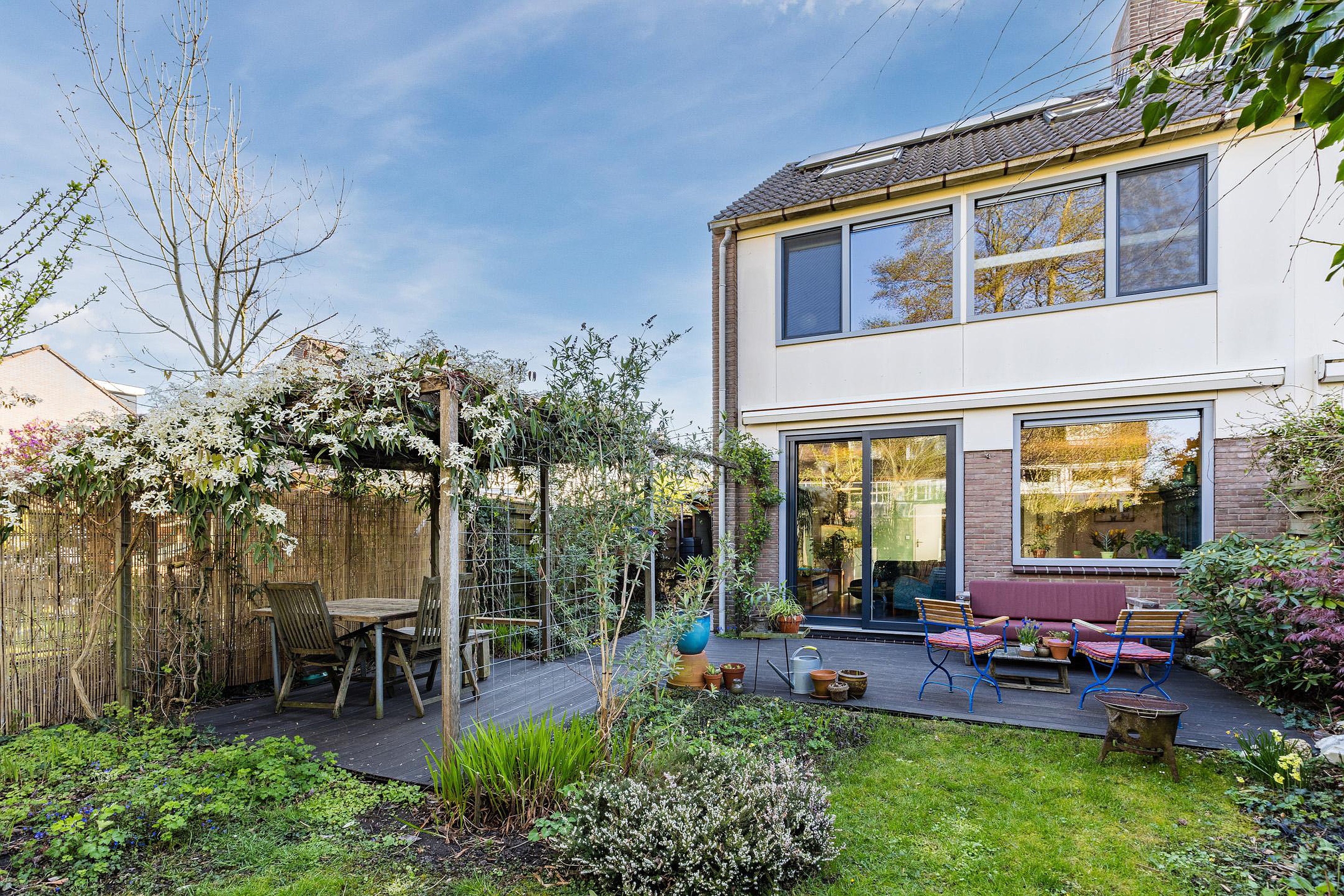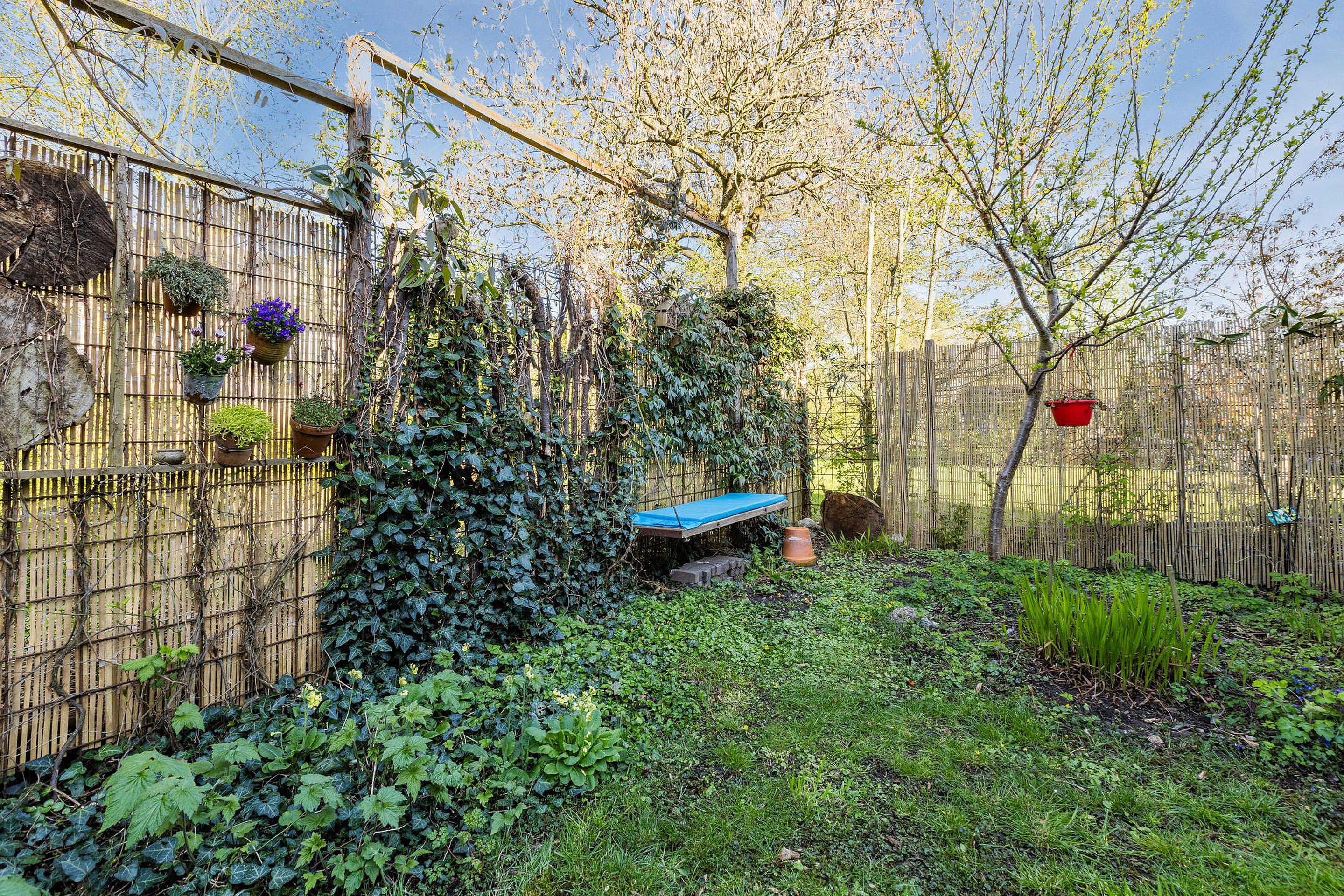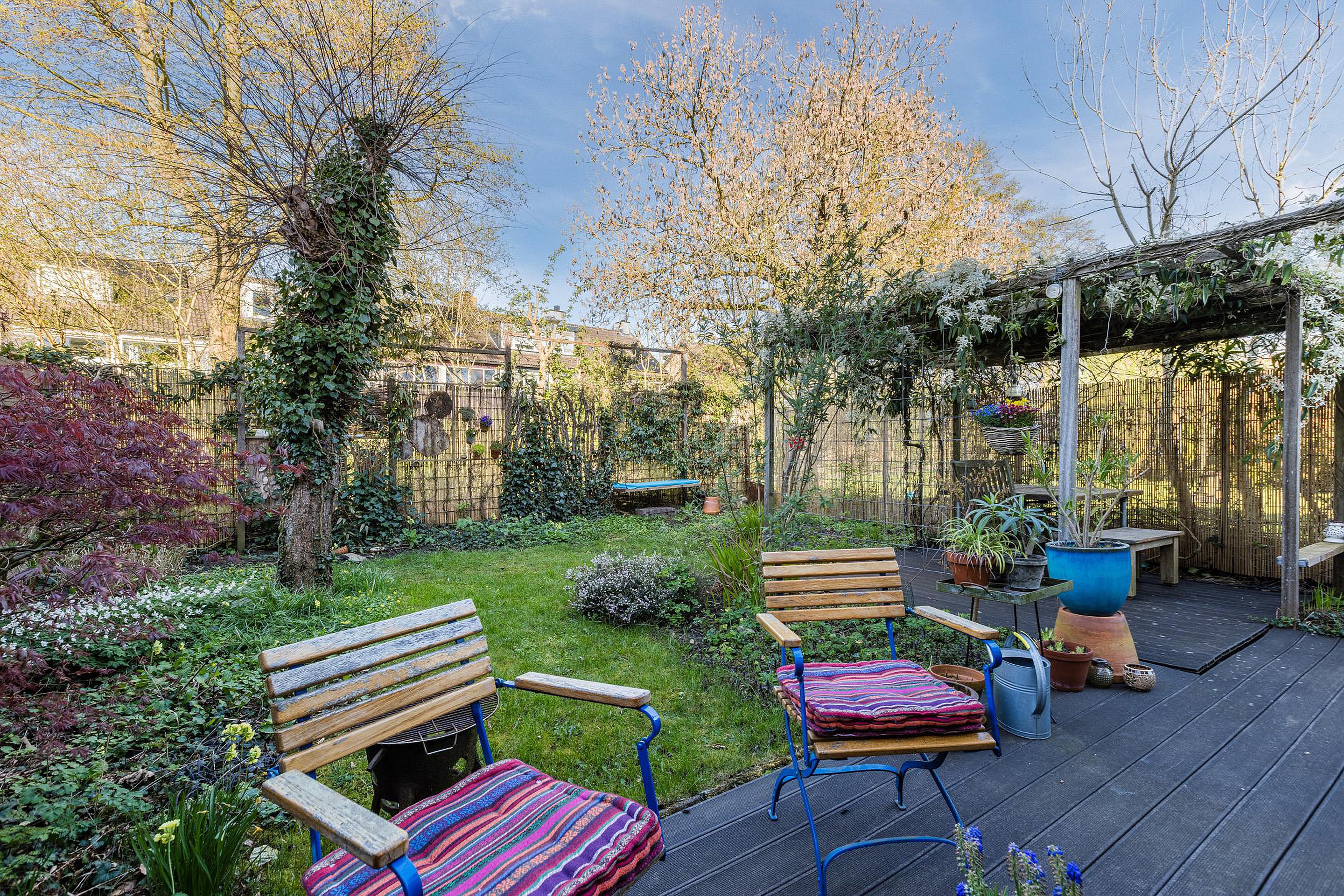 De riante zonnige achtertuin ligt op het westen en heeft veel privacy, een vijver en een prachtig begroeide pergola.