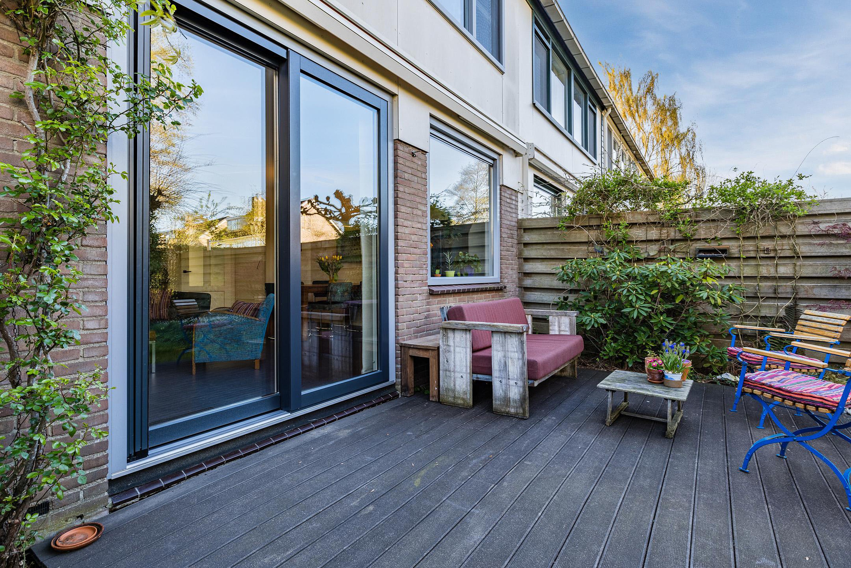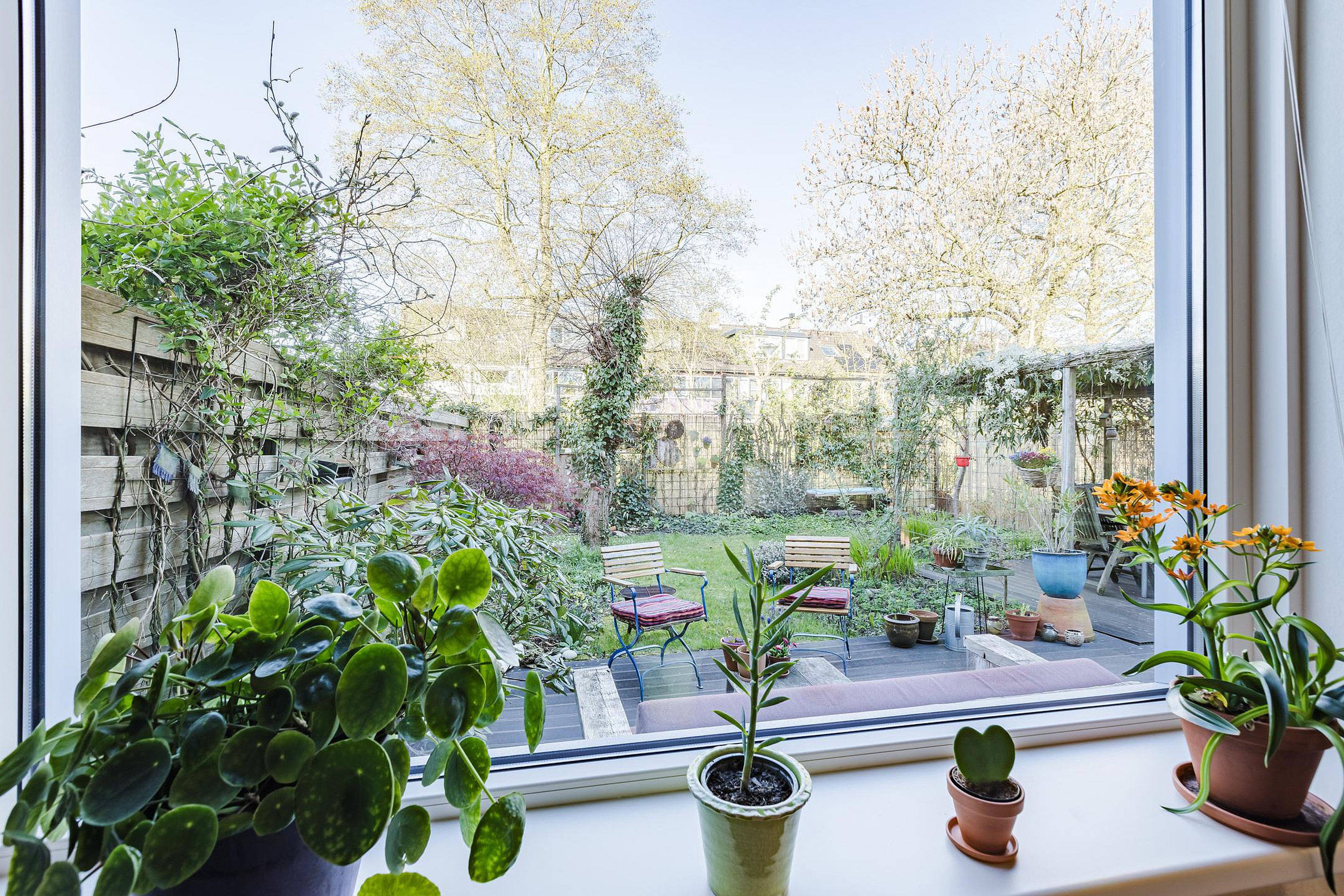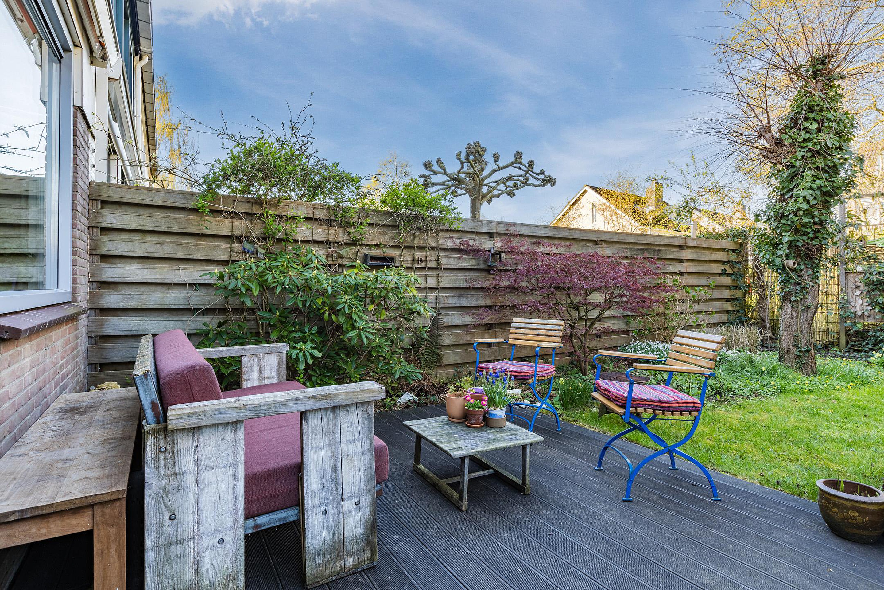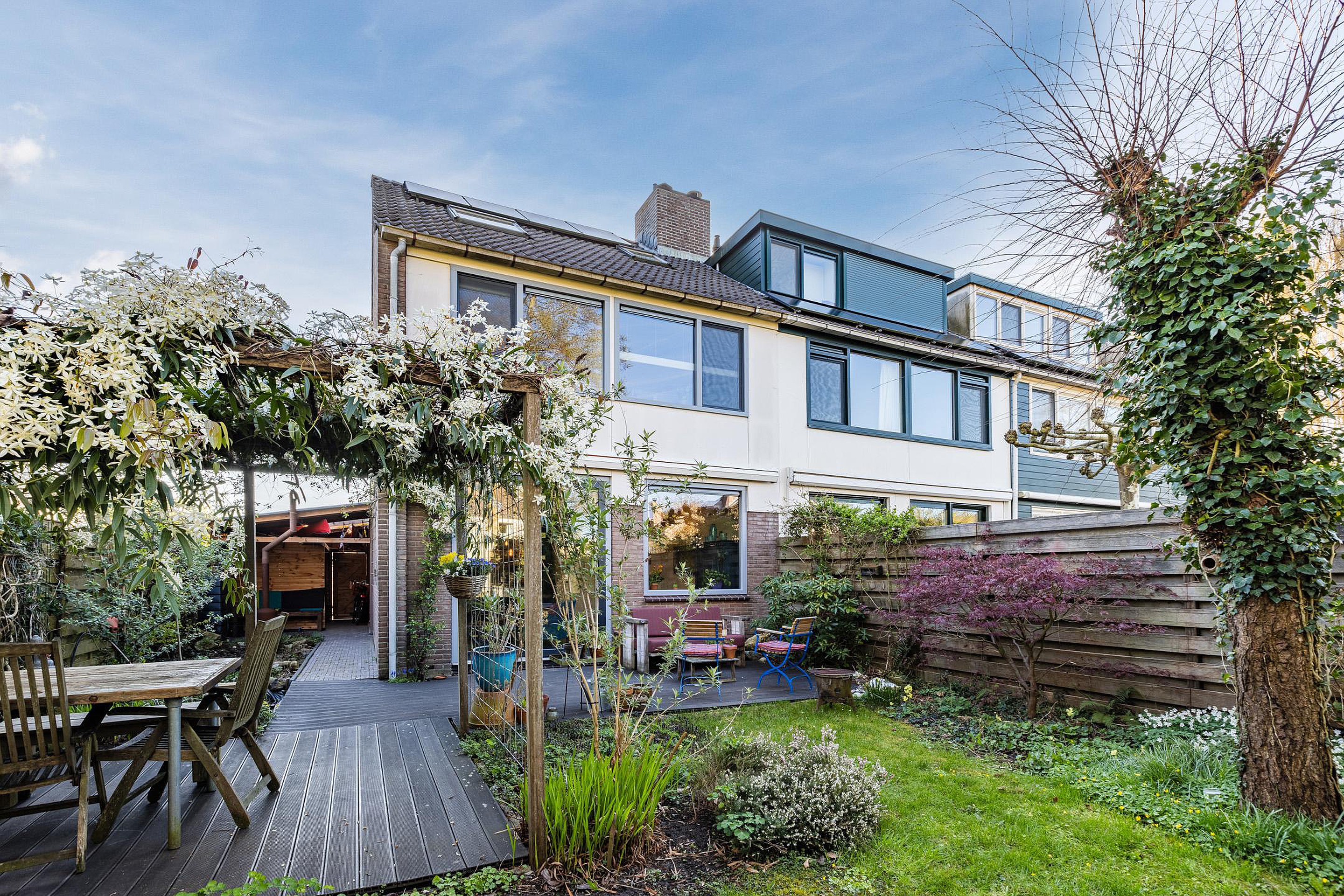De riante zonnige achtertuin ligt op het westen en heeft veel privacy, een vijver en een prachtig begroeide pergola.