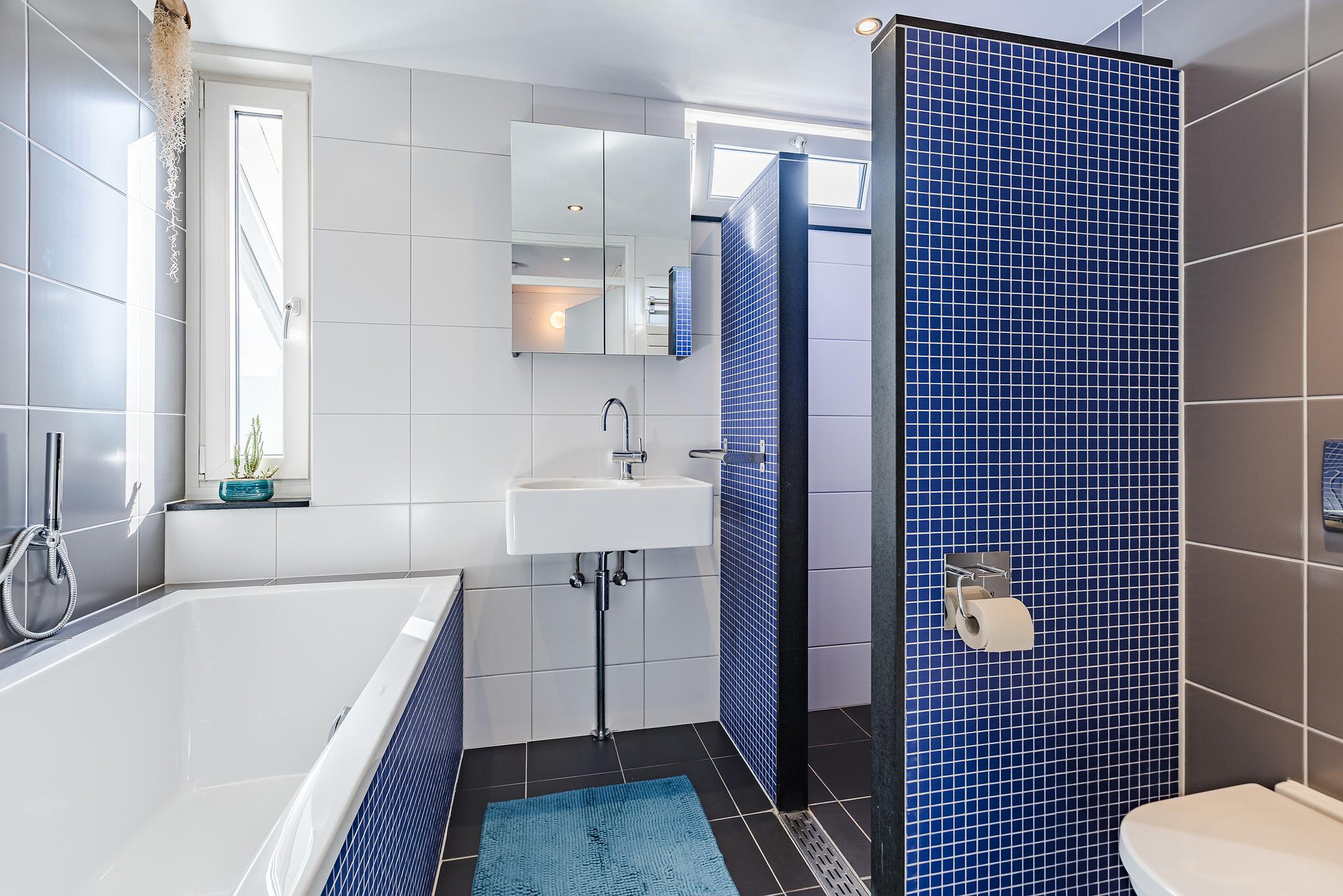 Een moderne badkamer met bad, inloopdouche, een vaste wastafel en vrijdragend (2e) toilet.