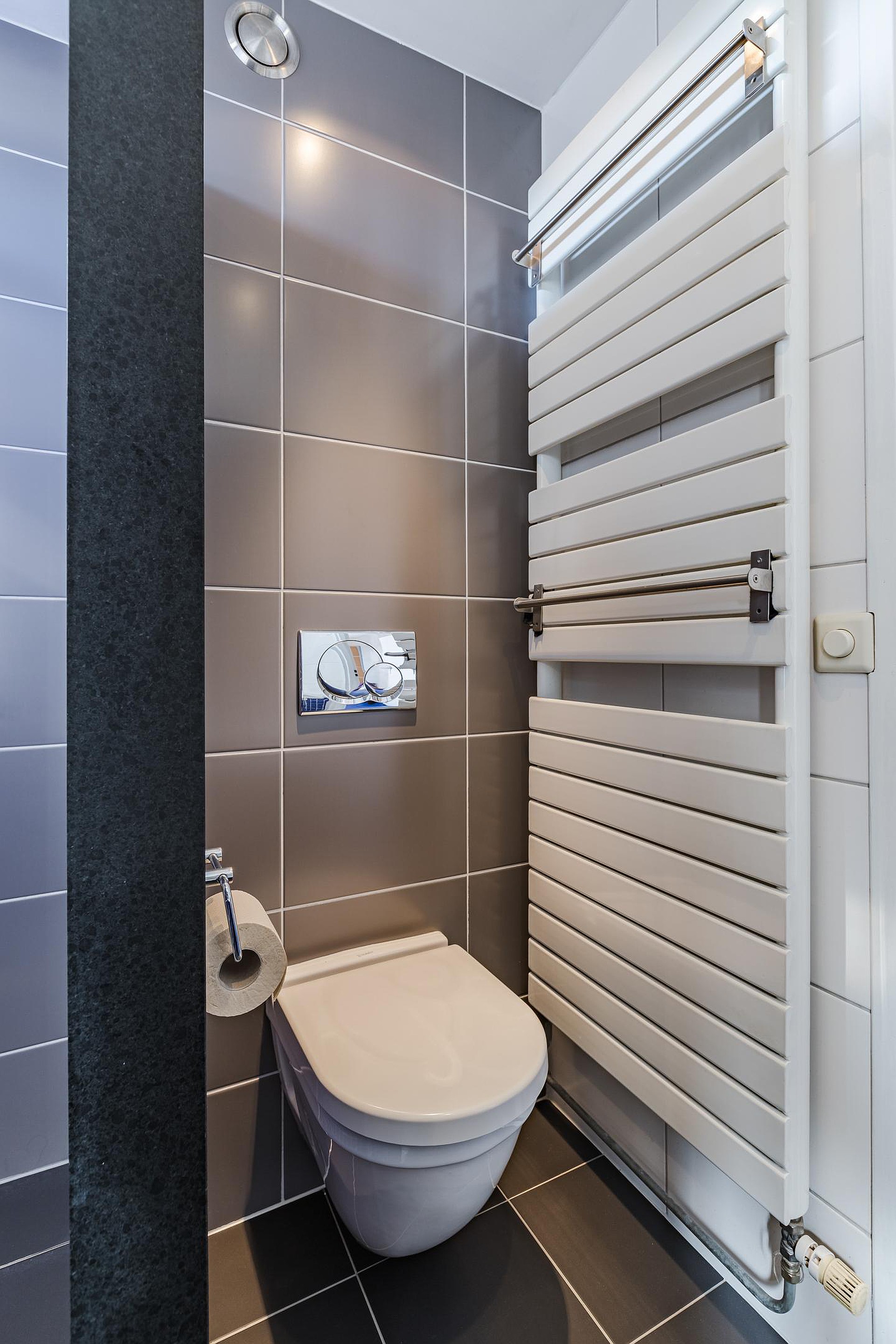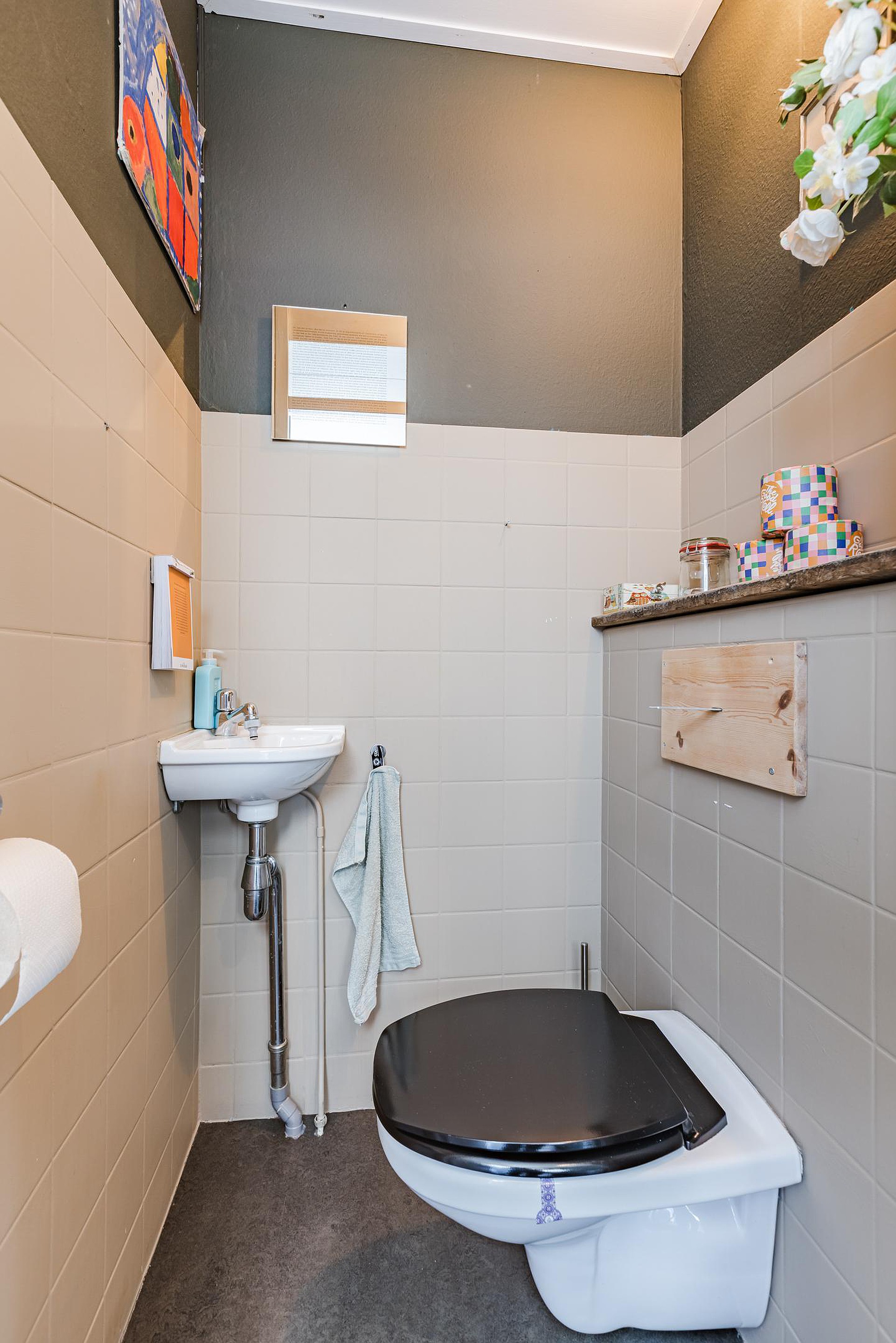 Toiletruimte met vrijdragend toilet en fonteintje.