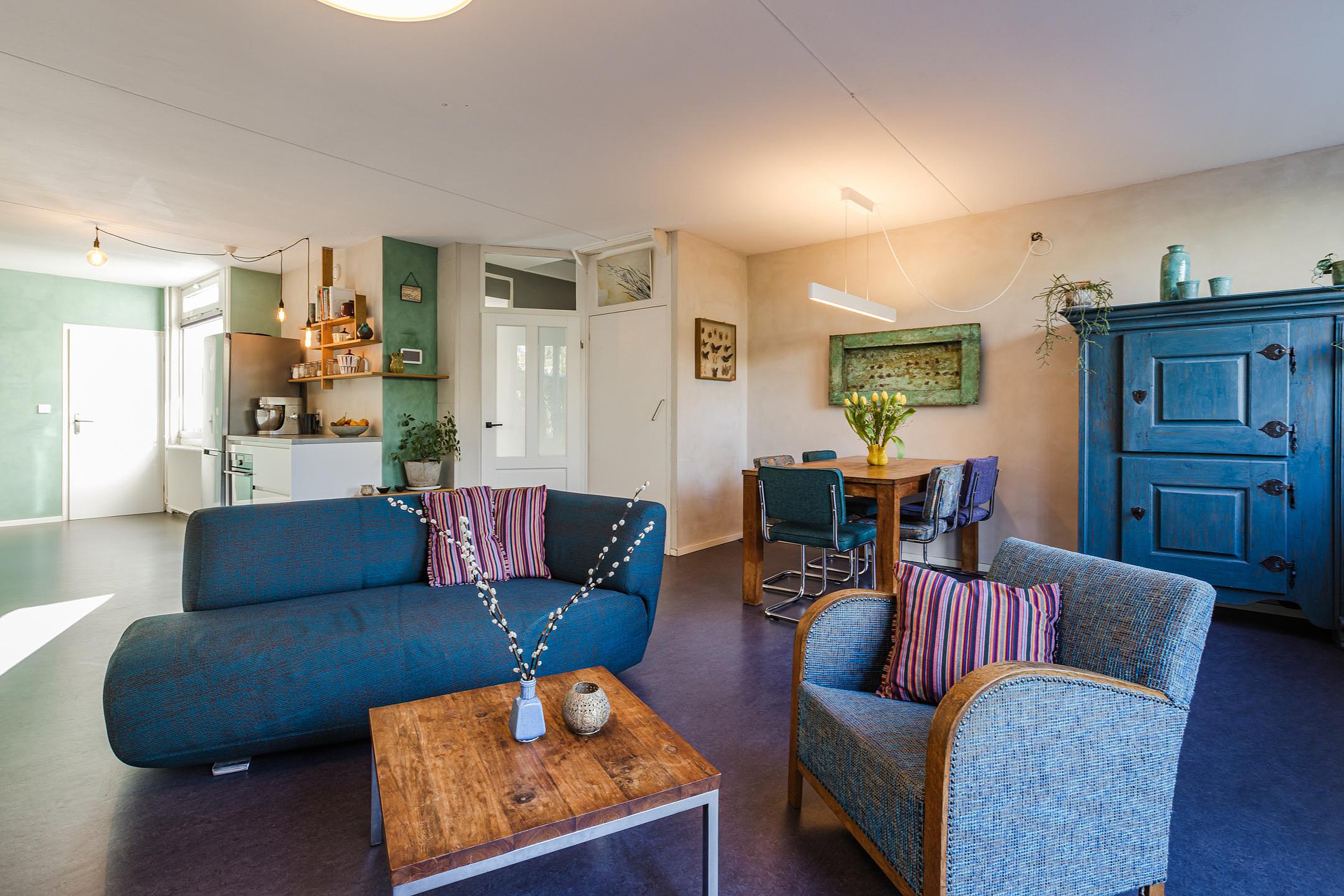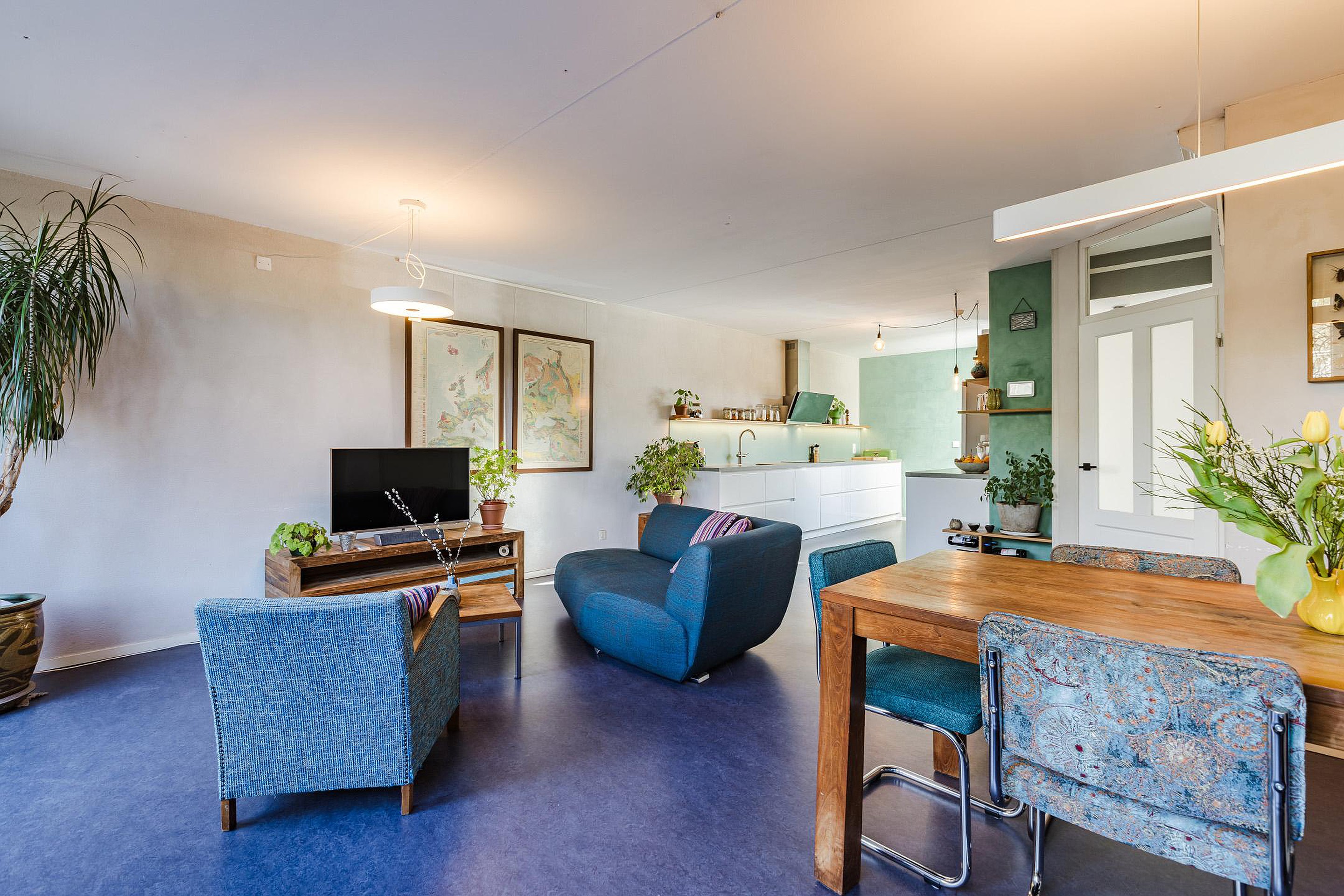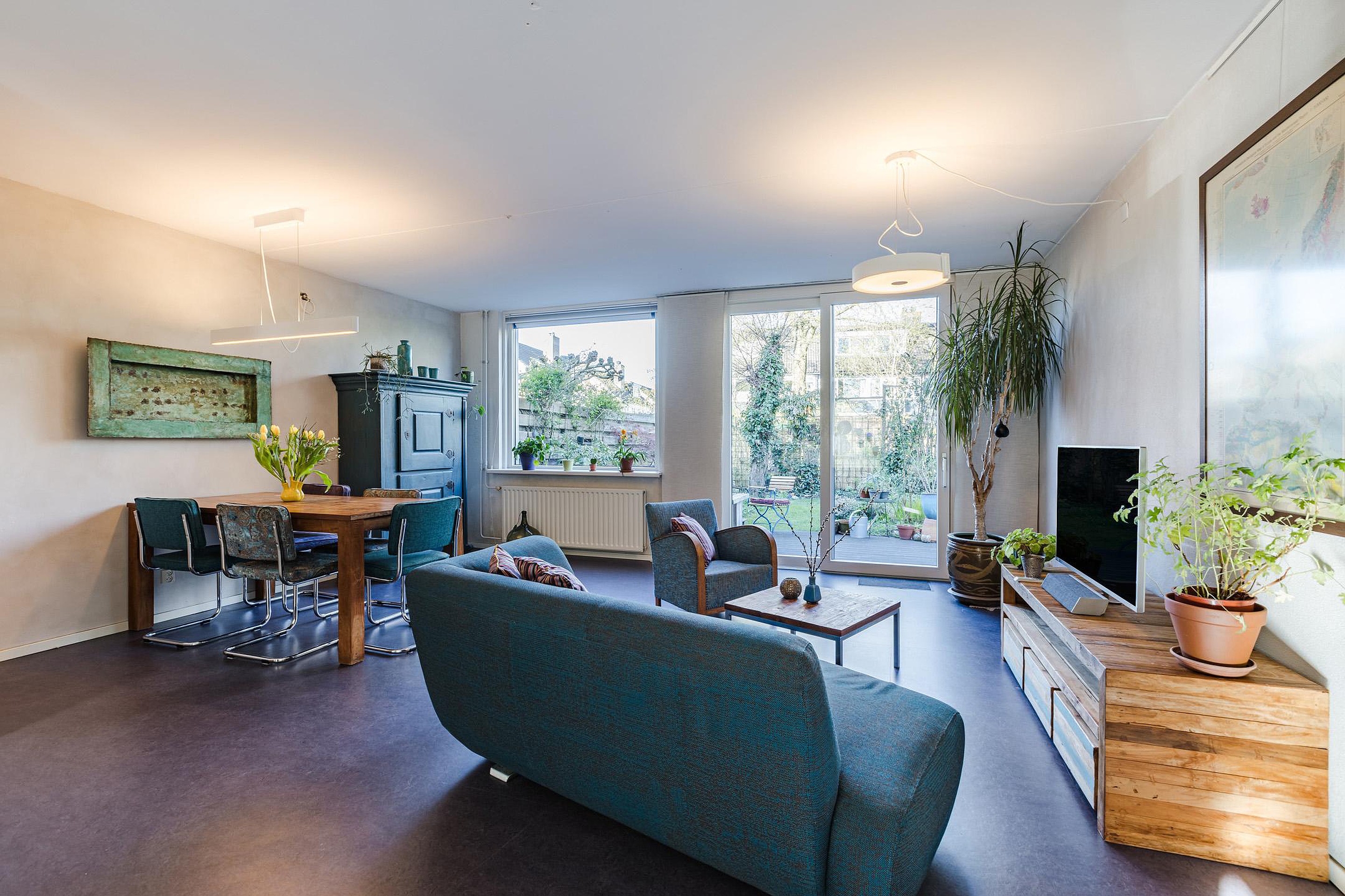 Ruime lichte woonkamer met vloerverwarming, trapkast en schuifpui naar de zonnige tuin.