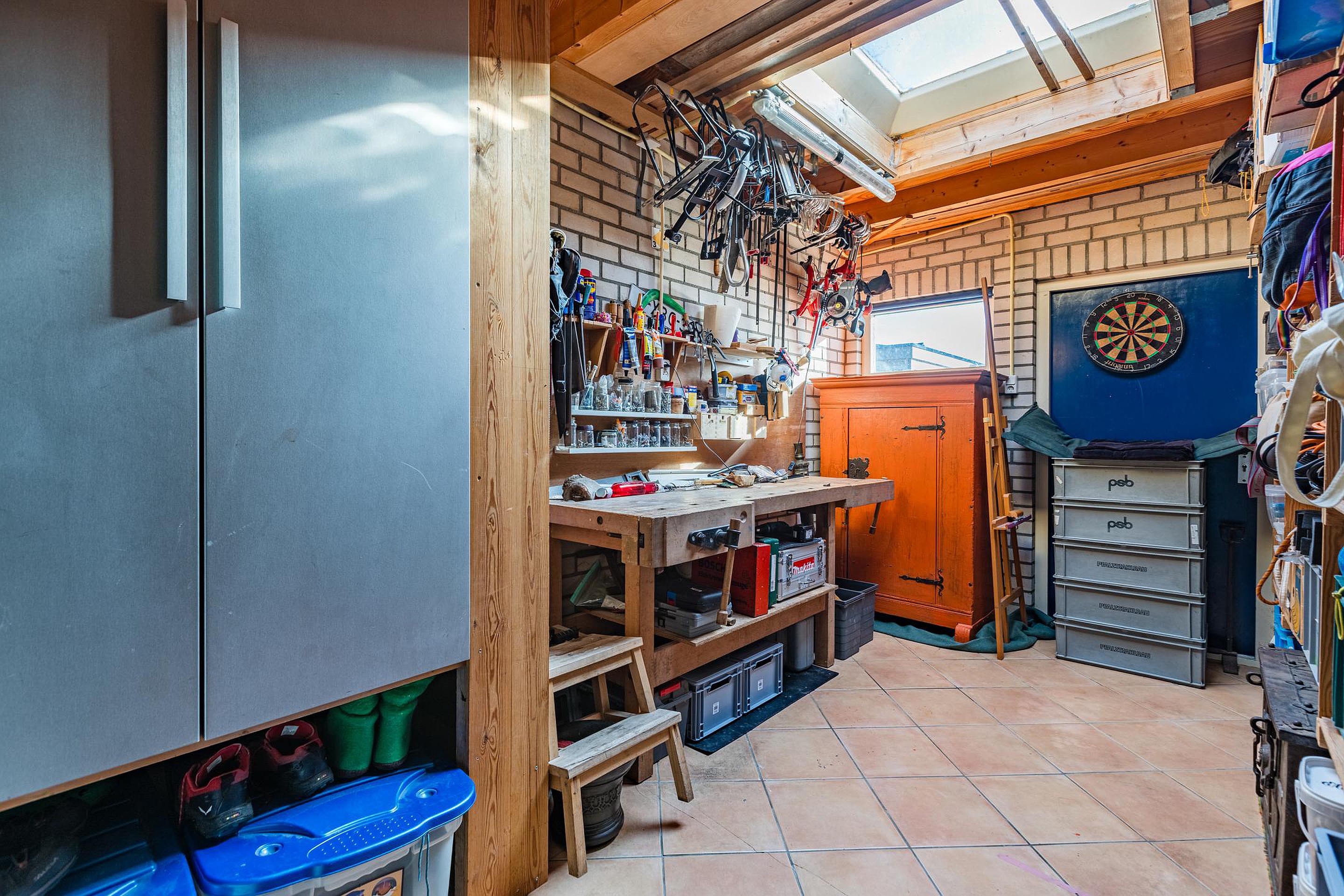 Lichte bijkeuken/berging met lichtkoepel en opbergzolder.
