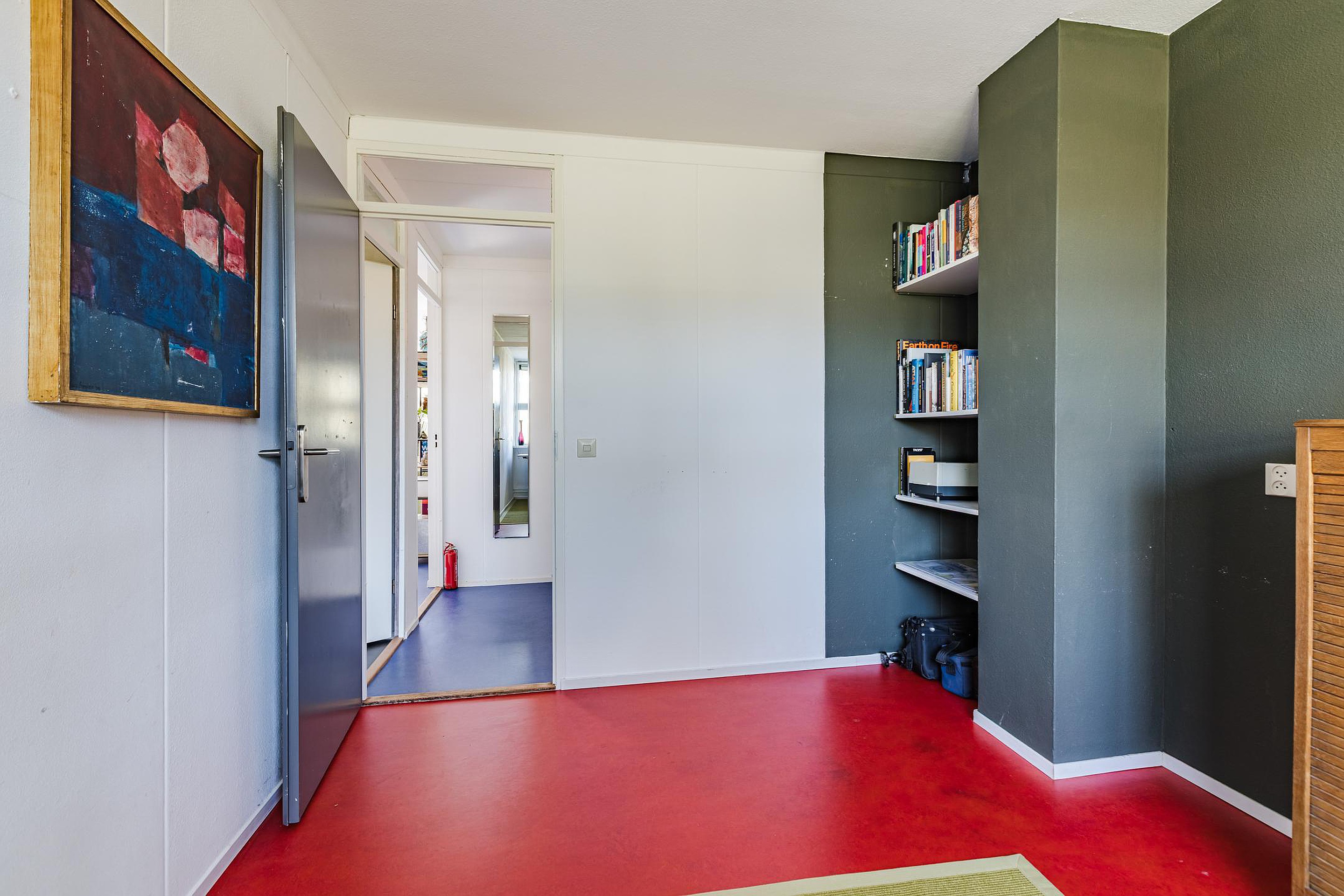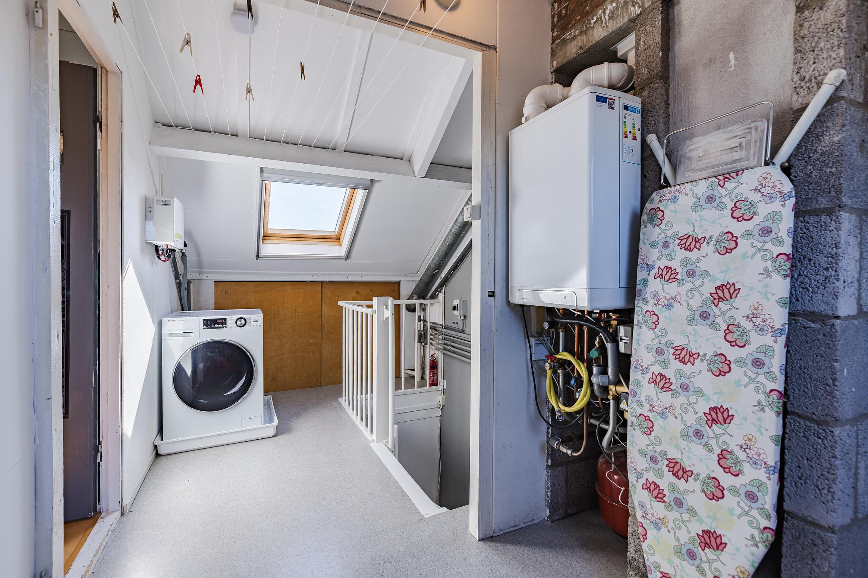 Tweede verdieping Overloop met opstelplaats voor de cv combiketel Intergas 2022, elektrische boiler op zonnestroom, wasmachine- en drogeraansluiting, m.v. box en omvormer zonnepanelen.