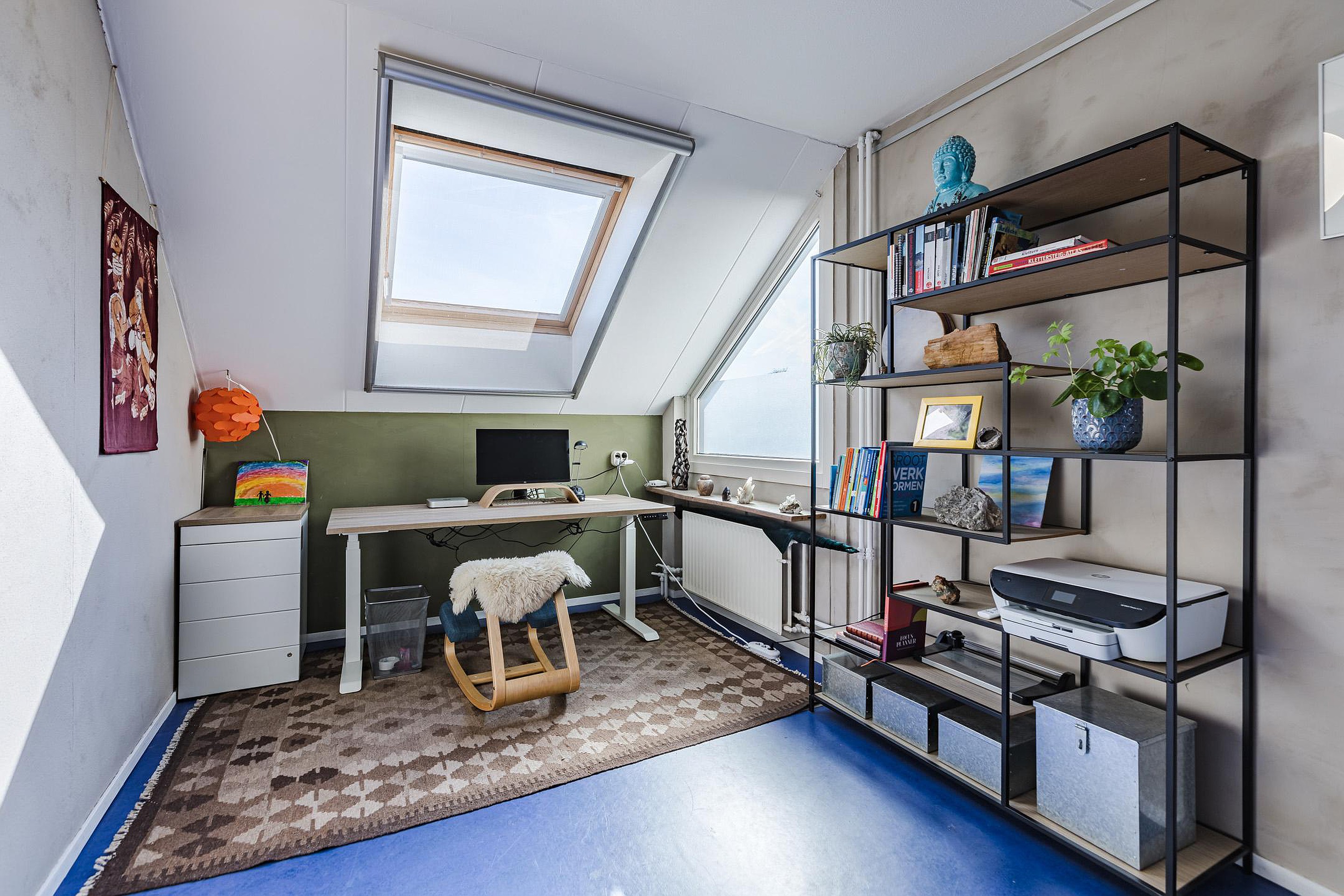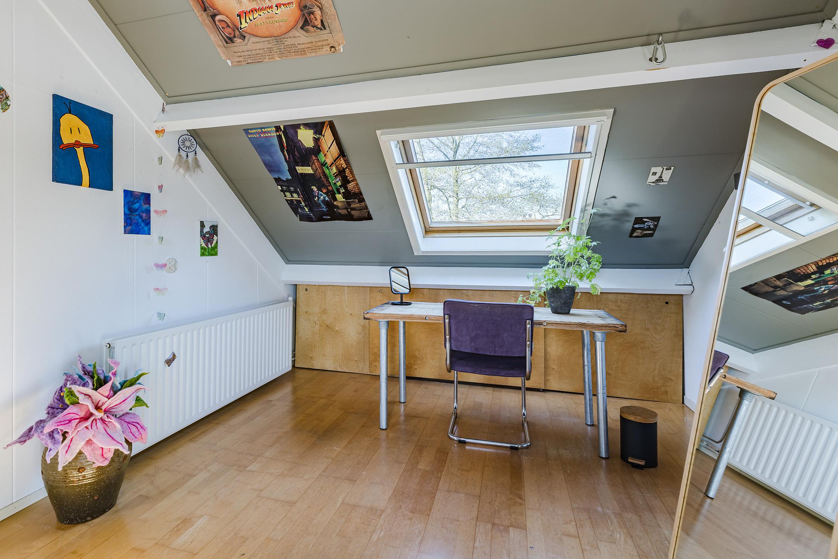 Op de 1e verdieping tref je de overloop, 3 slaapkamers en een badkamer aan. Aan de achterzijde zijn 2 ruime slaapkamers gelegen, waarvan 1 kamer een vaste kast heeft. De andere ruime slaapkamer ligt aan de voorzijde van de woning. De moderne badkamer heeft een fijn ligbad, een inloopdouche, vaste wastafel en vrijdragend 2e toilet. Via een vaste trap kom je op de 2e verdieping. Hier vind je de overloop met opstelplaats voor de cv combiketel Intergas (2022), de wasmachine- en drogeraansluiting, m.v. box en omvormer zonnepanelen. De overloop heeft veel lichtinval door de dakramen aan beide zijden. Daarnaast is er een ruime lichte slaapkamer met 2 grote Velux dakramen. Op deze verdieping is ook veel bergruimte.