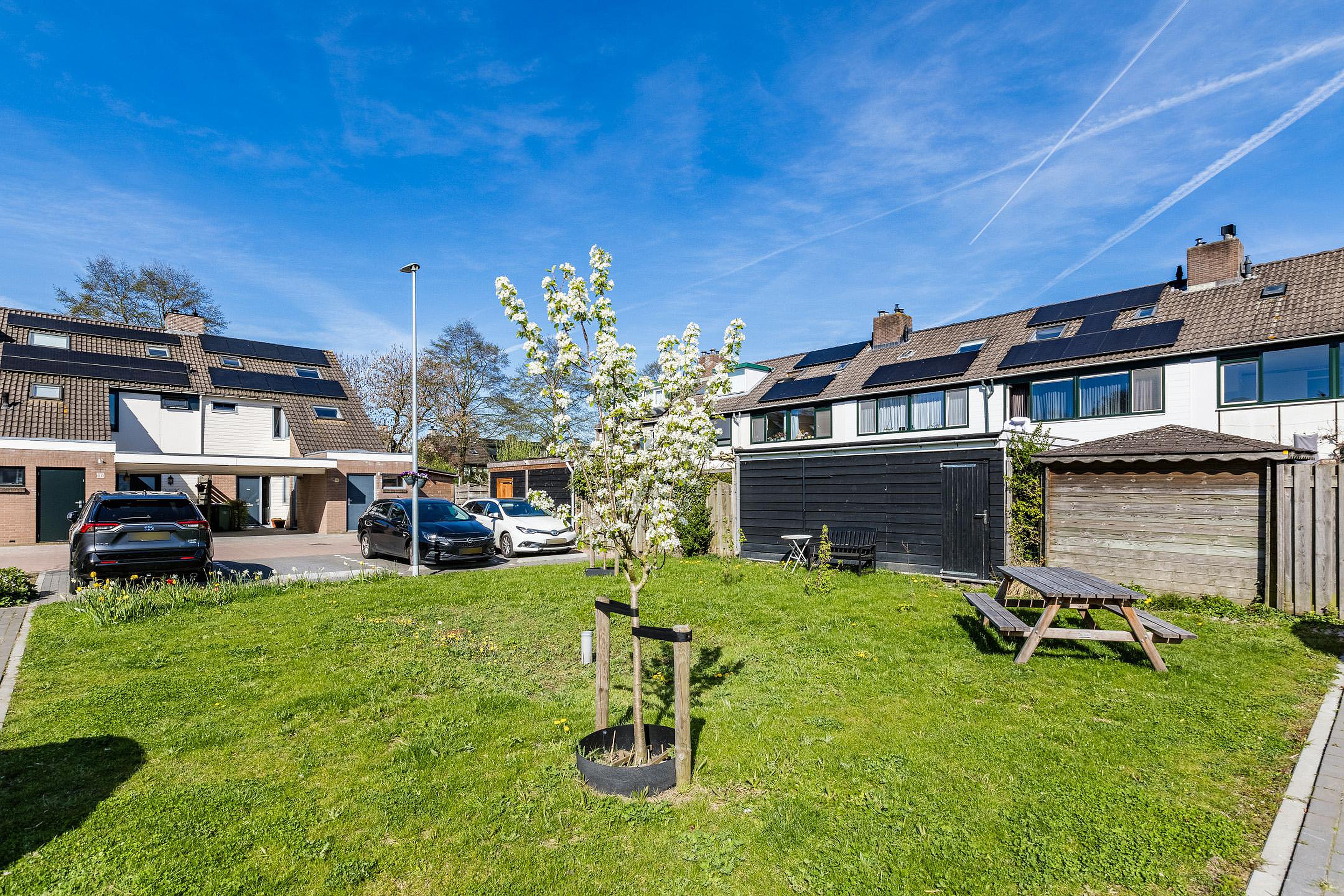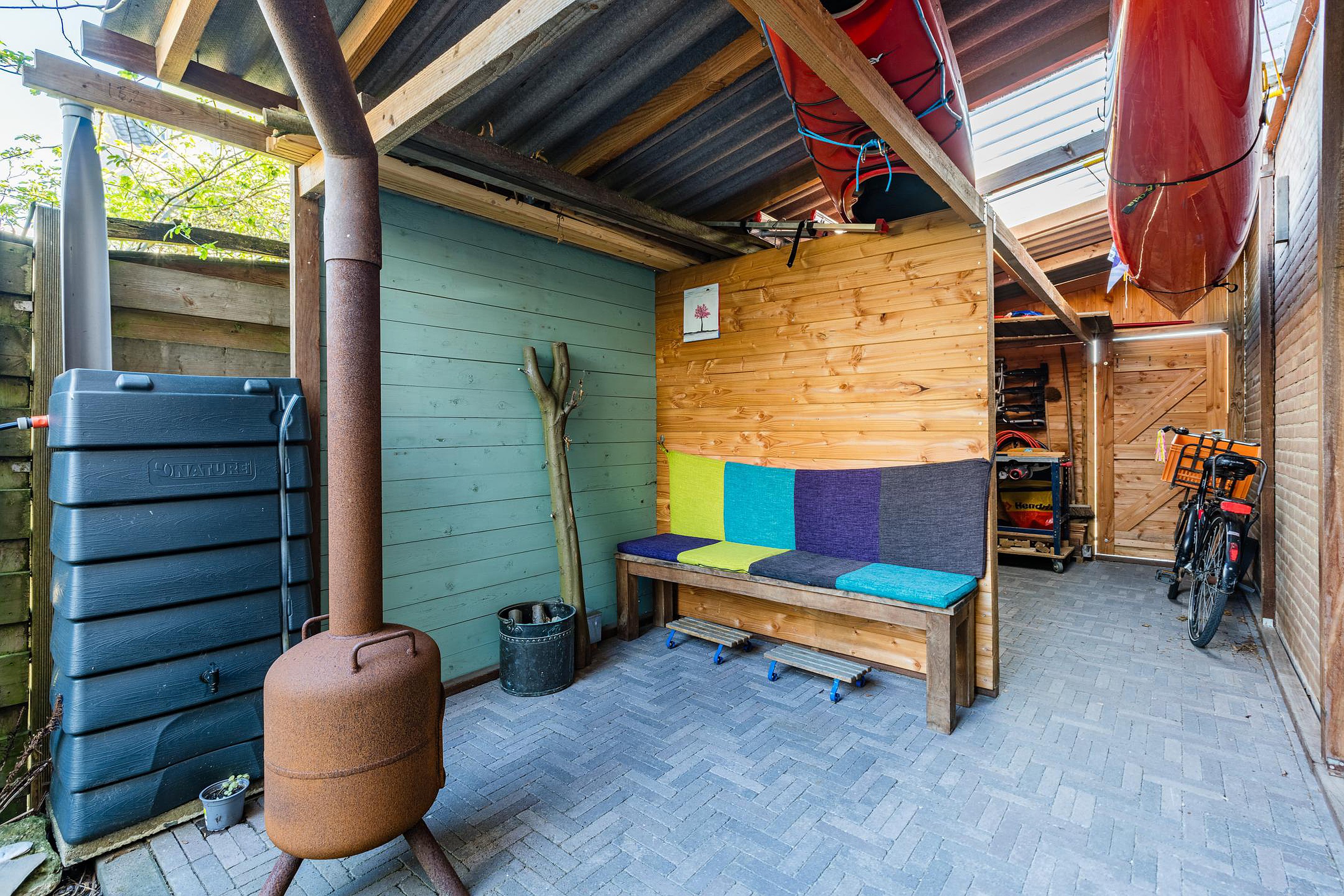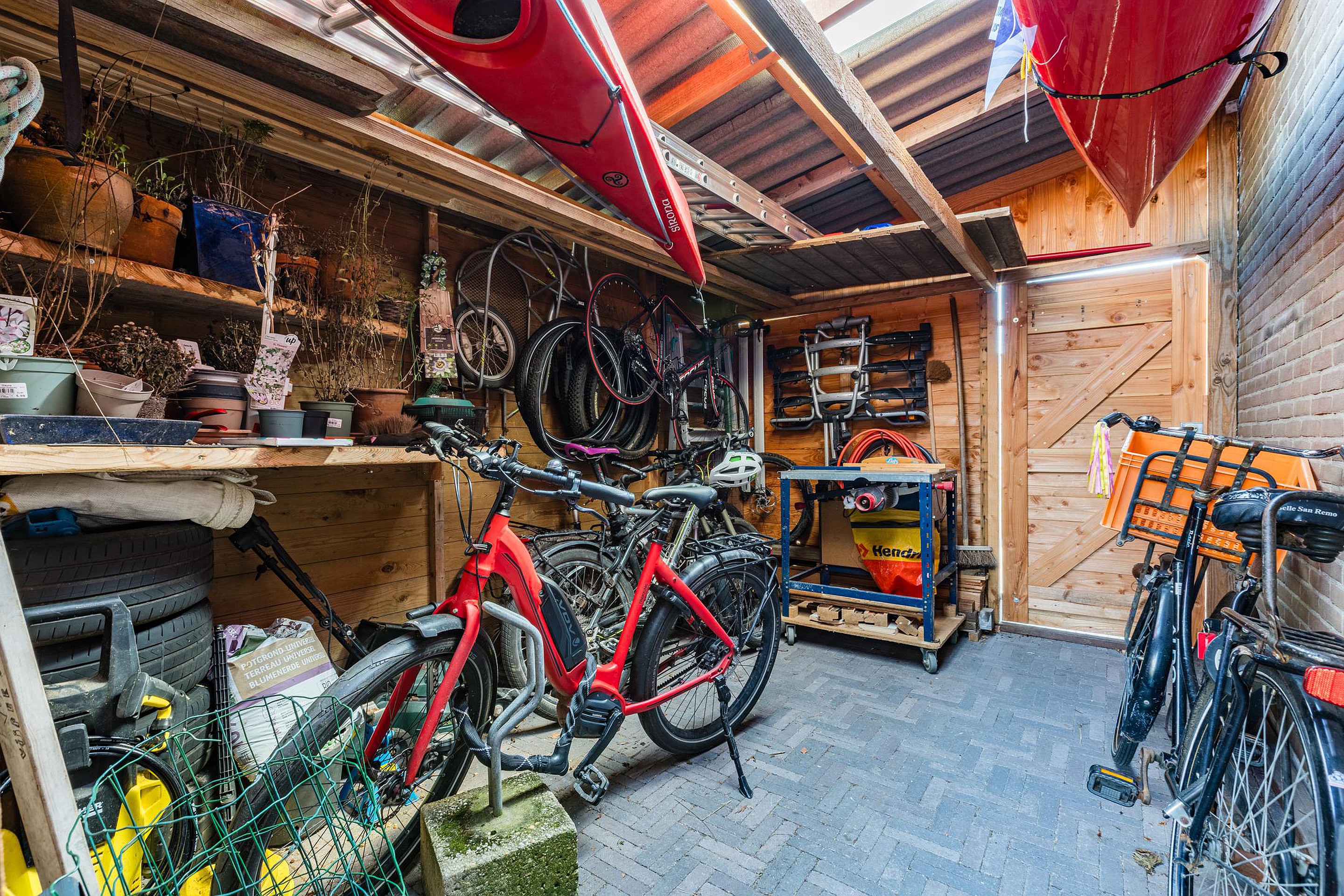 Via de zij-tuin kun je achterom en hier staat een handige berging met overkapping.