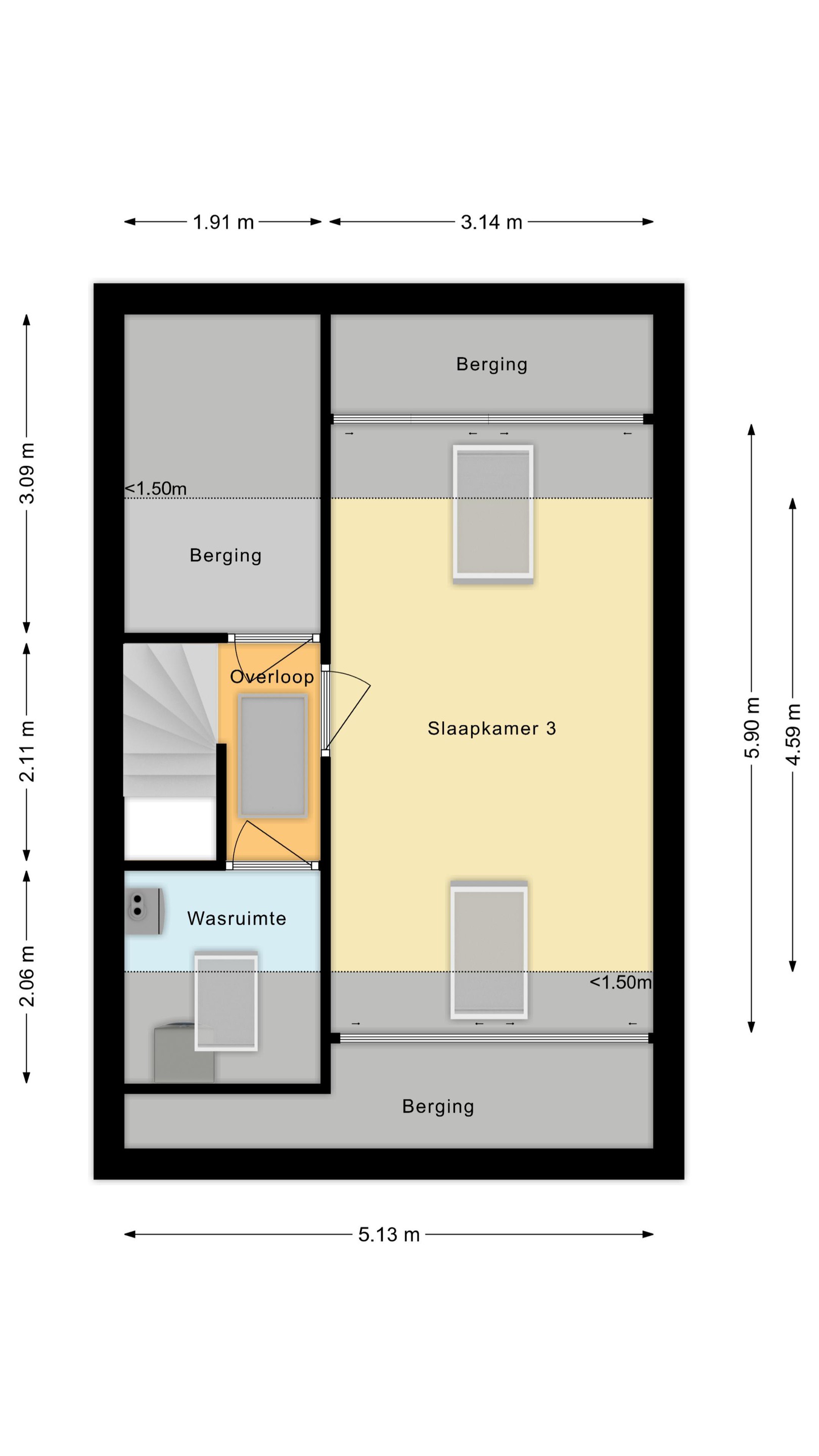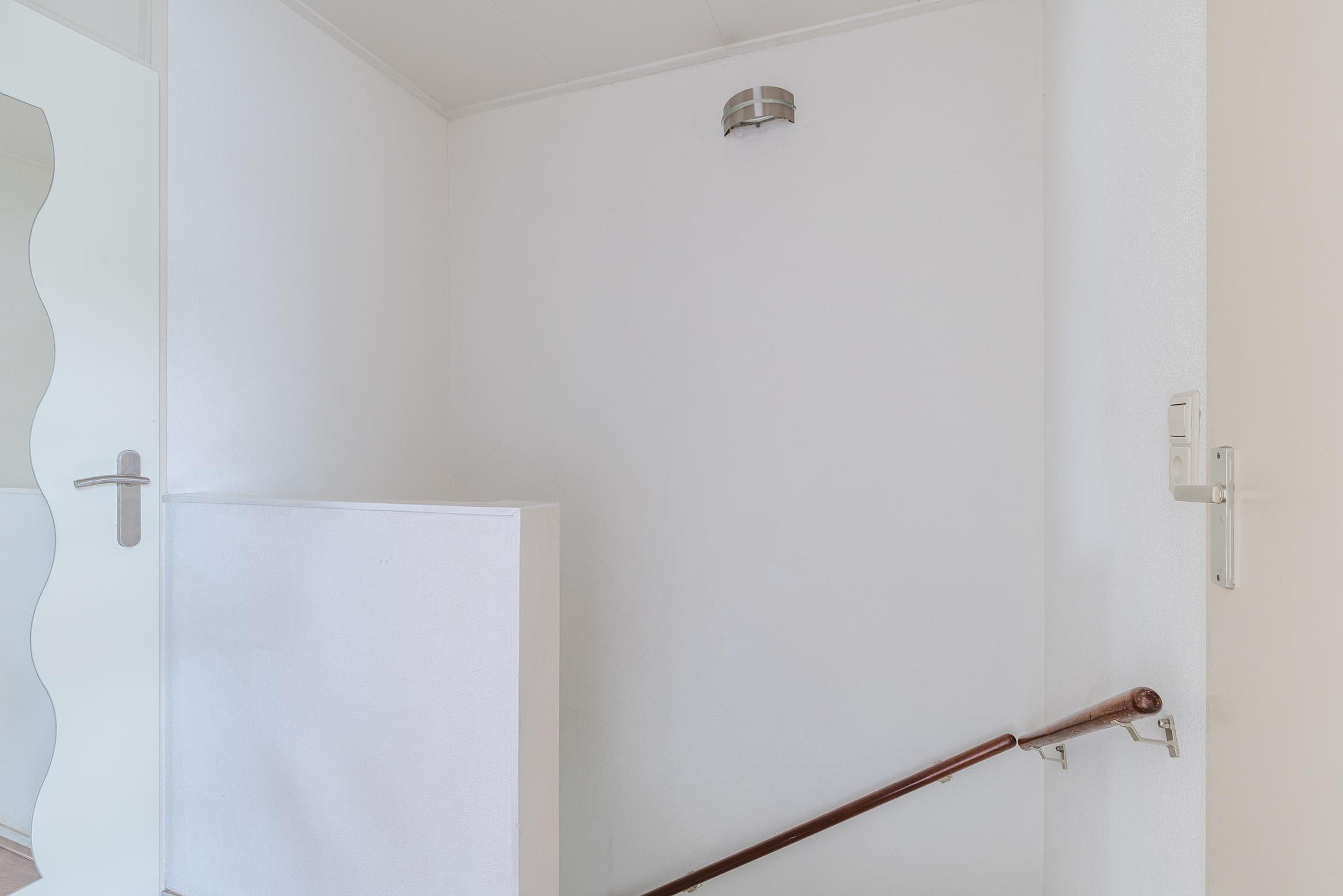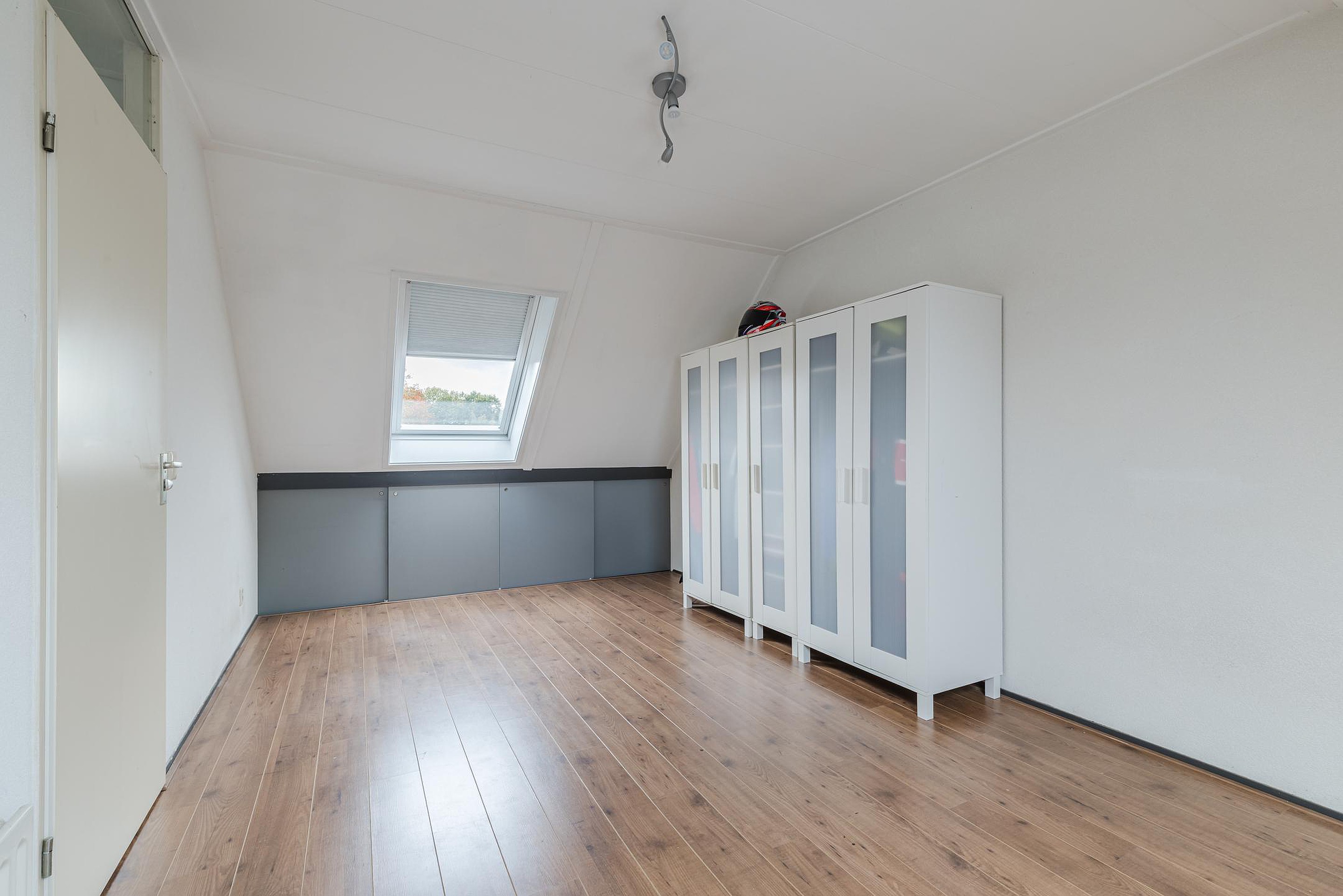 Er is een vaste trap naar de 2e verdieping. Daar bevindt zich een overloop met een vlizotrap naar de vliering waar je fijn dingen op kunt bergen. Op deze verdieping is een wasruimte met wasmachine- en drogeraansluiting, cv ketel Remeha en m.v. box. Door middel van een deur kom je in een ruime slaapkamer met mooie lichtinval door de dakramen. Deze slaapkamer is voorzien van knieschotten die extra bergruimte geven. Op de 2e verdieping kun je door het plaatsen van dakkapellen 2 slaapkamers creëren.