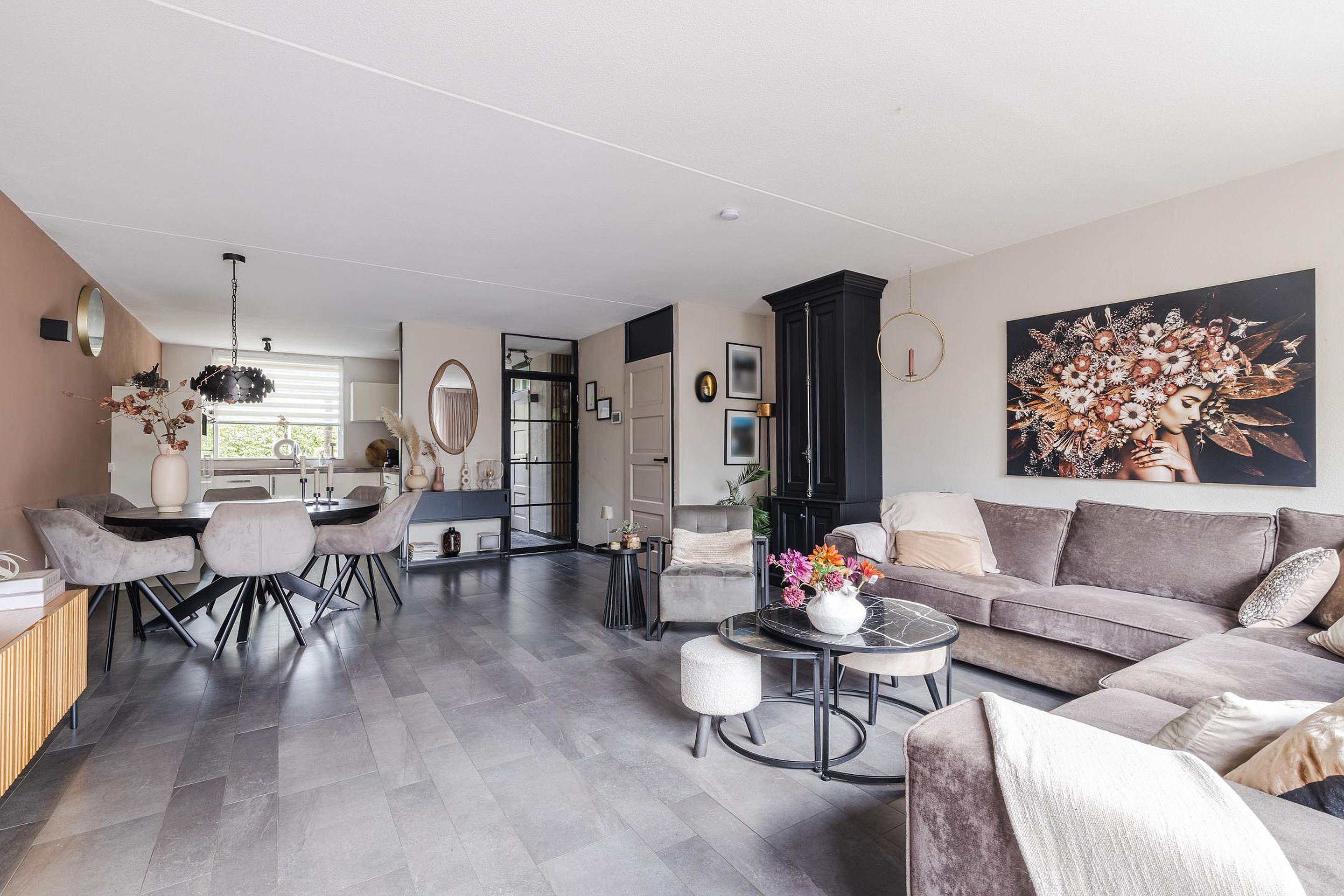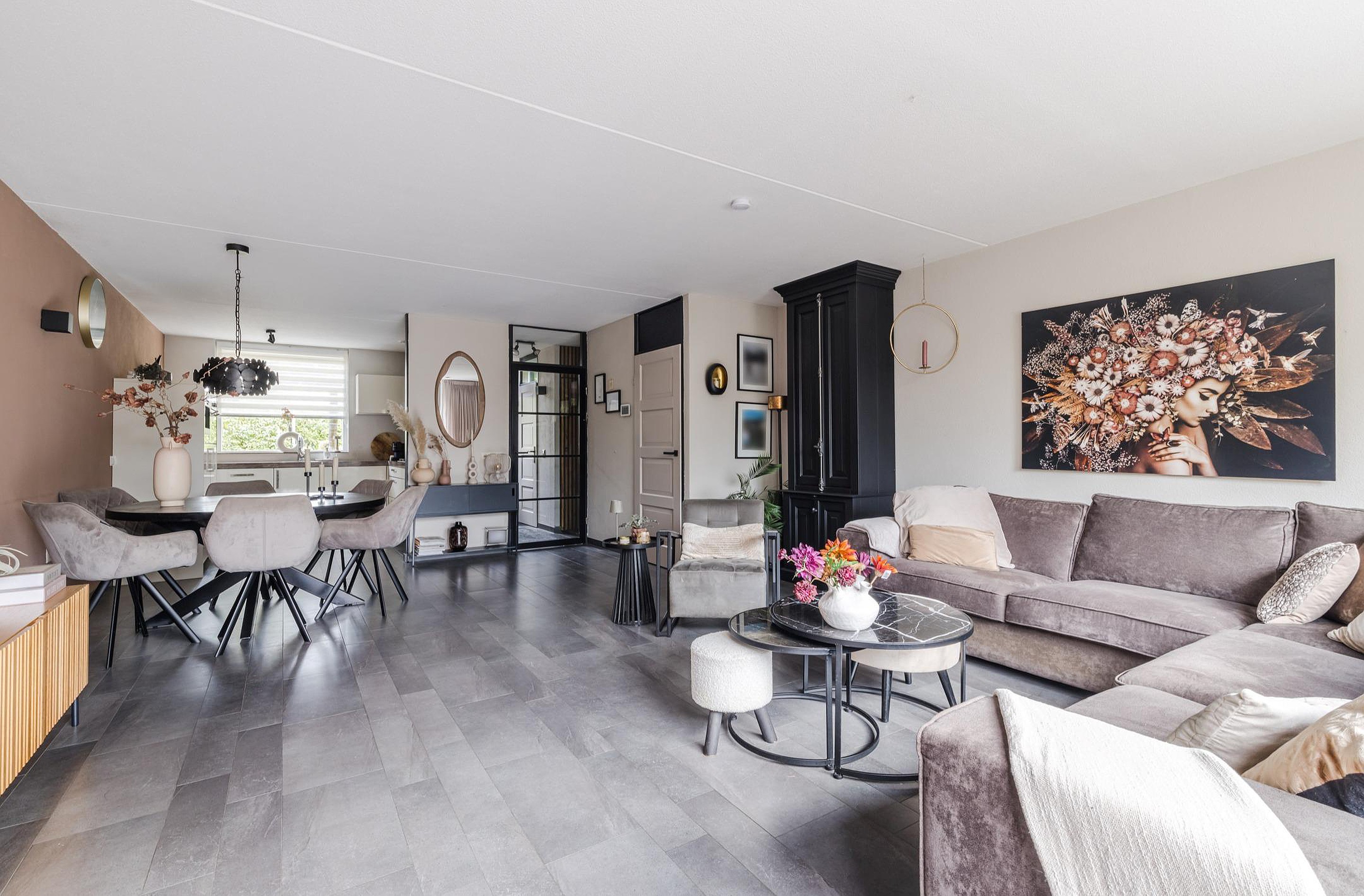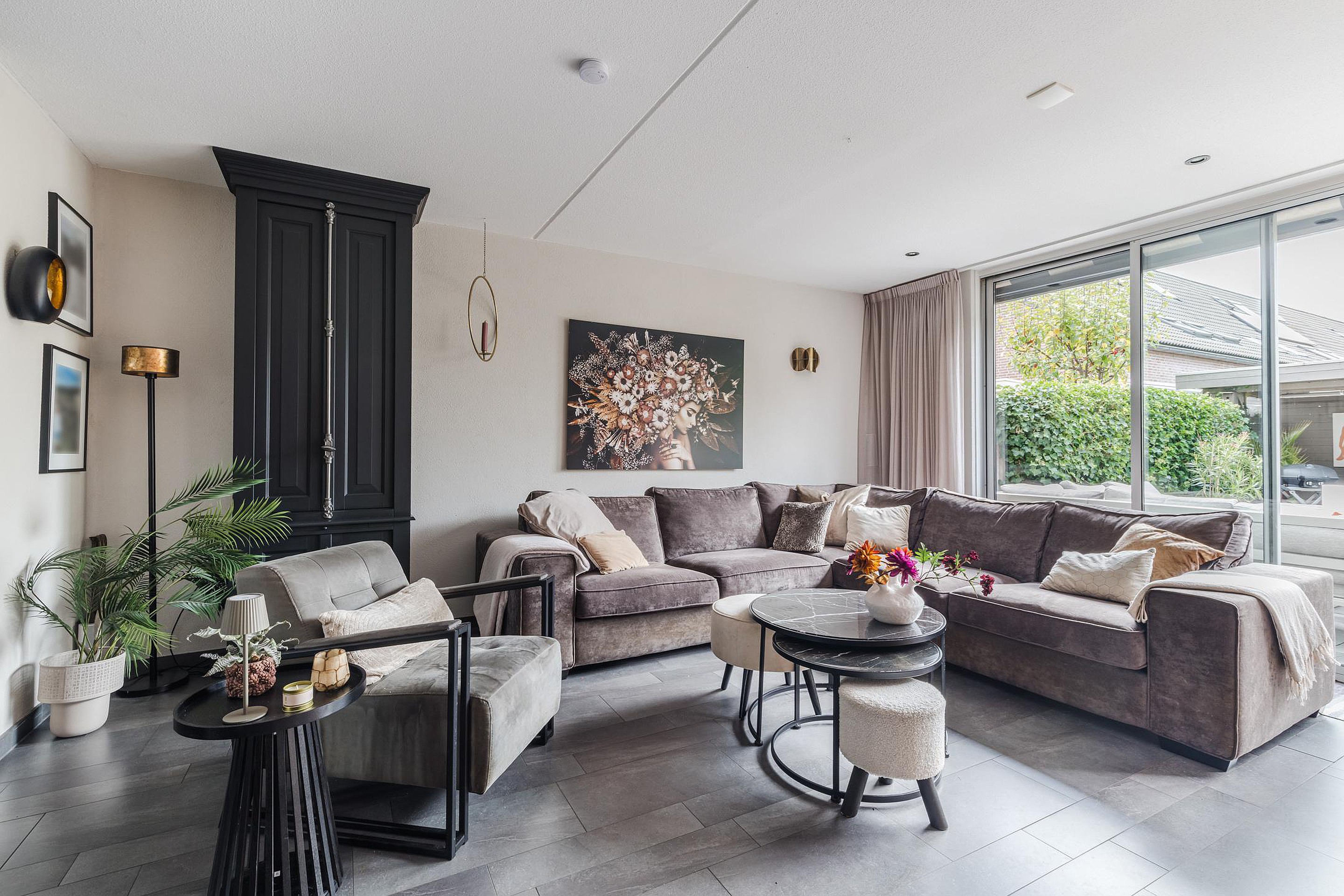 Ruime woonkamer met trapkast en toegang tot de zonnige tuin doormiddel van een schuifpui.