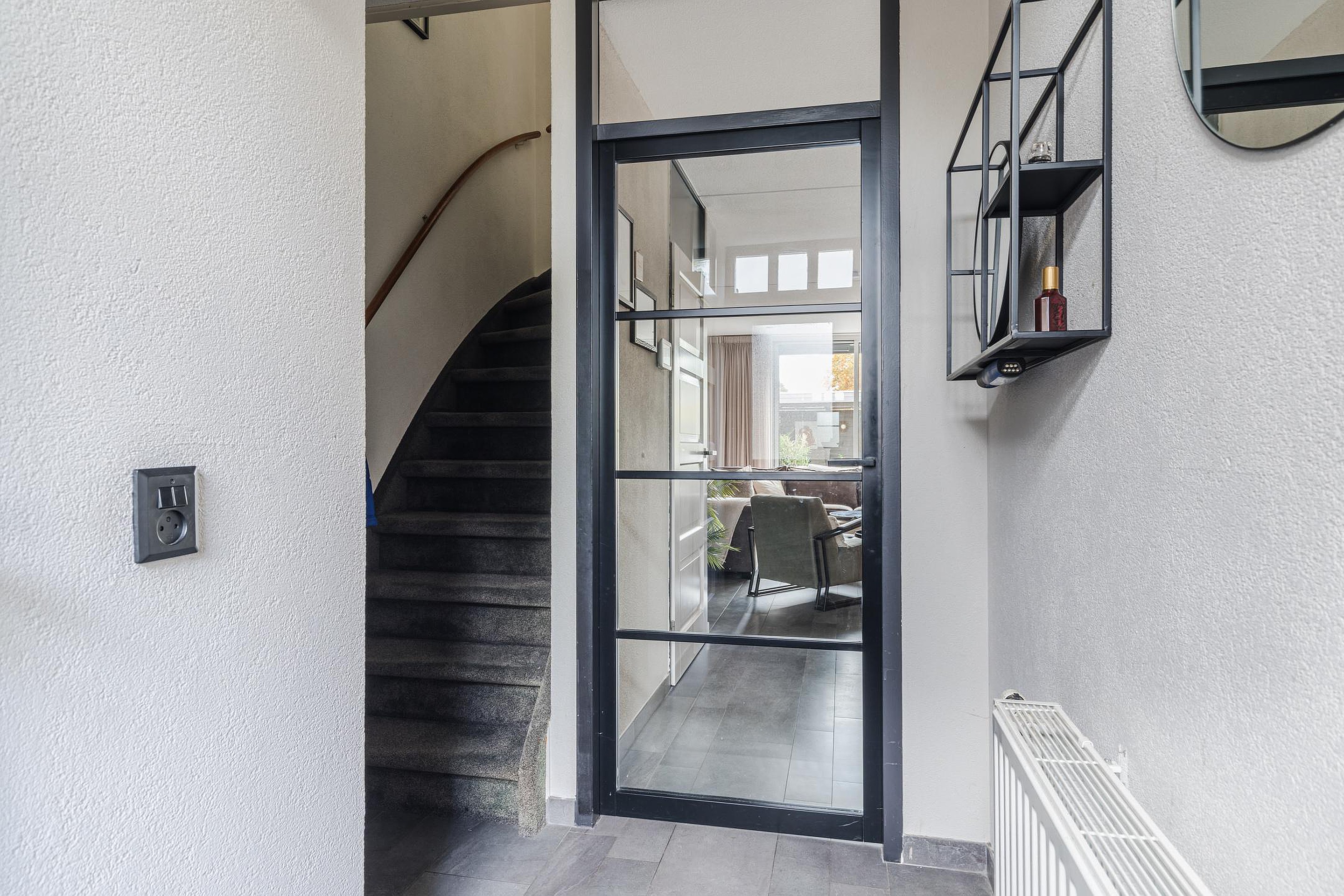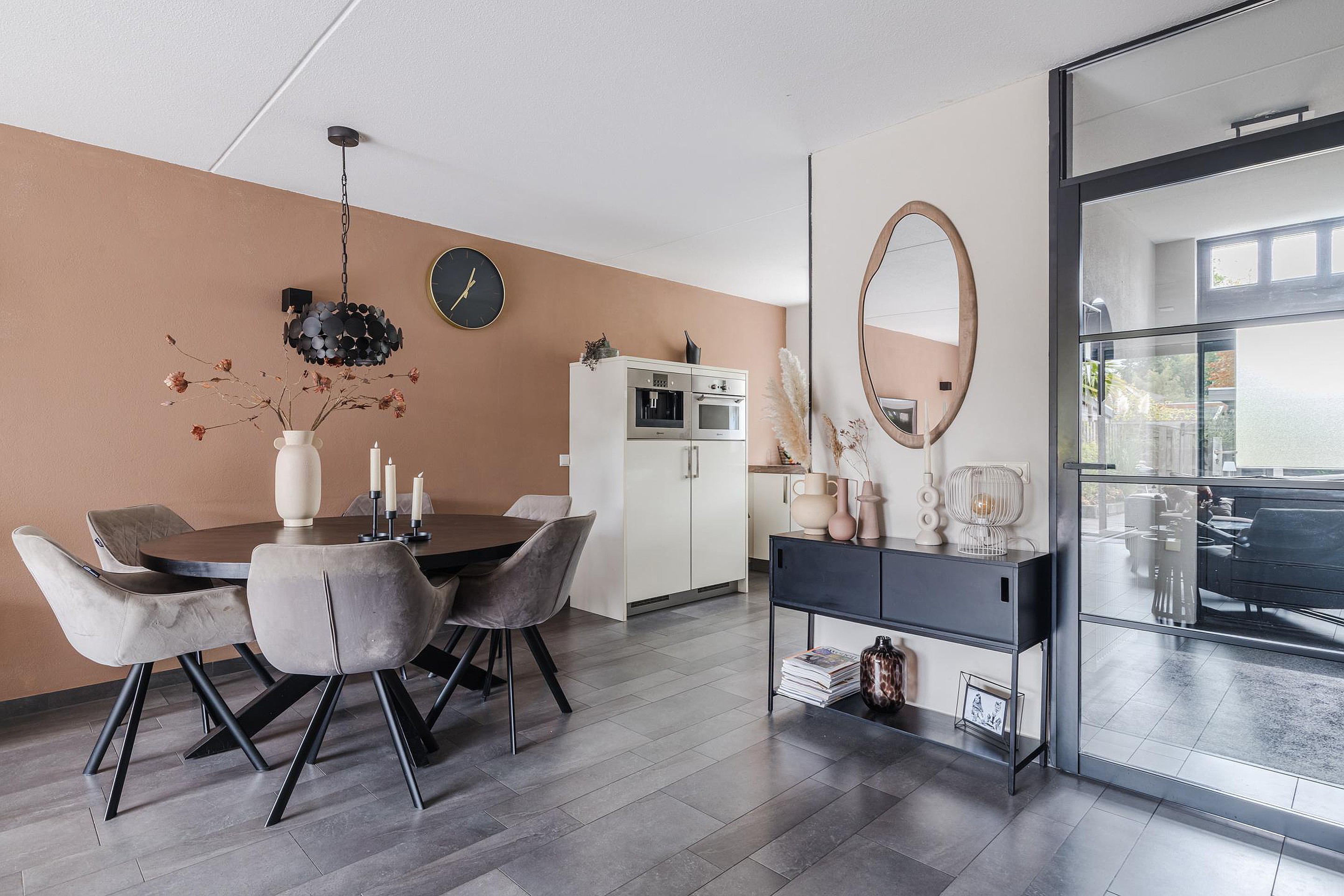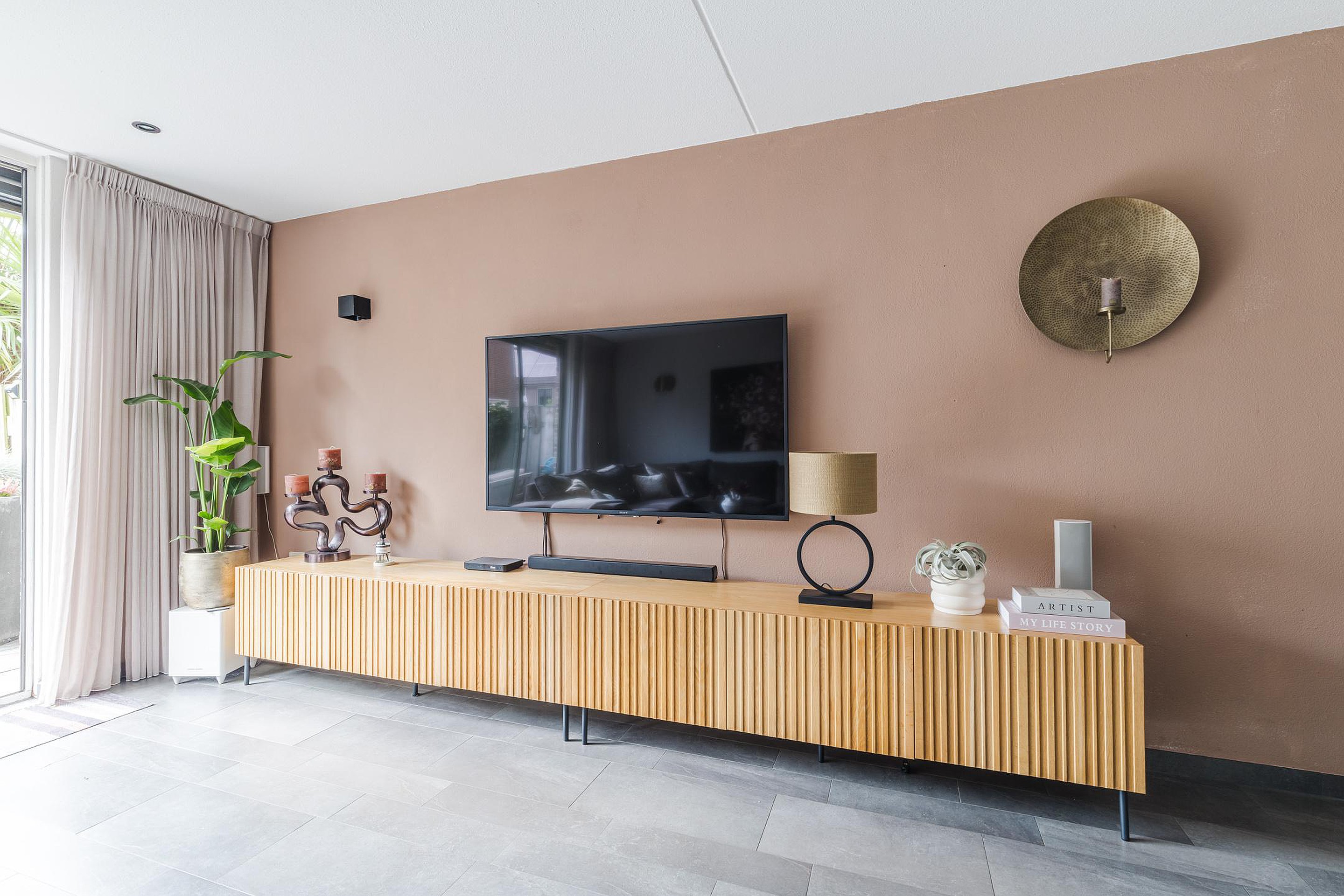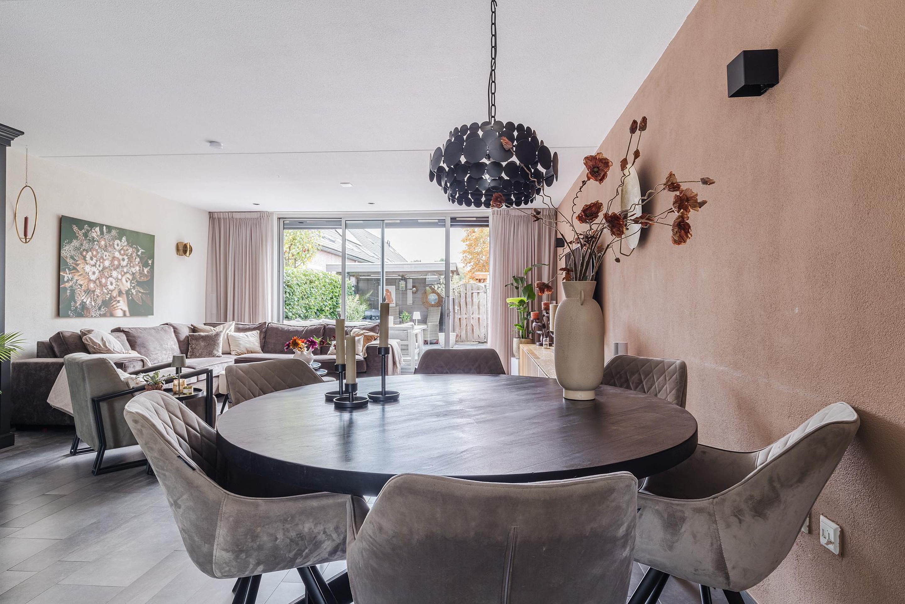 Ruime woonkamer met trapkast en toegang tot de zonnige tuin doormiddel van een schuifpui.