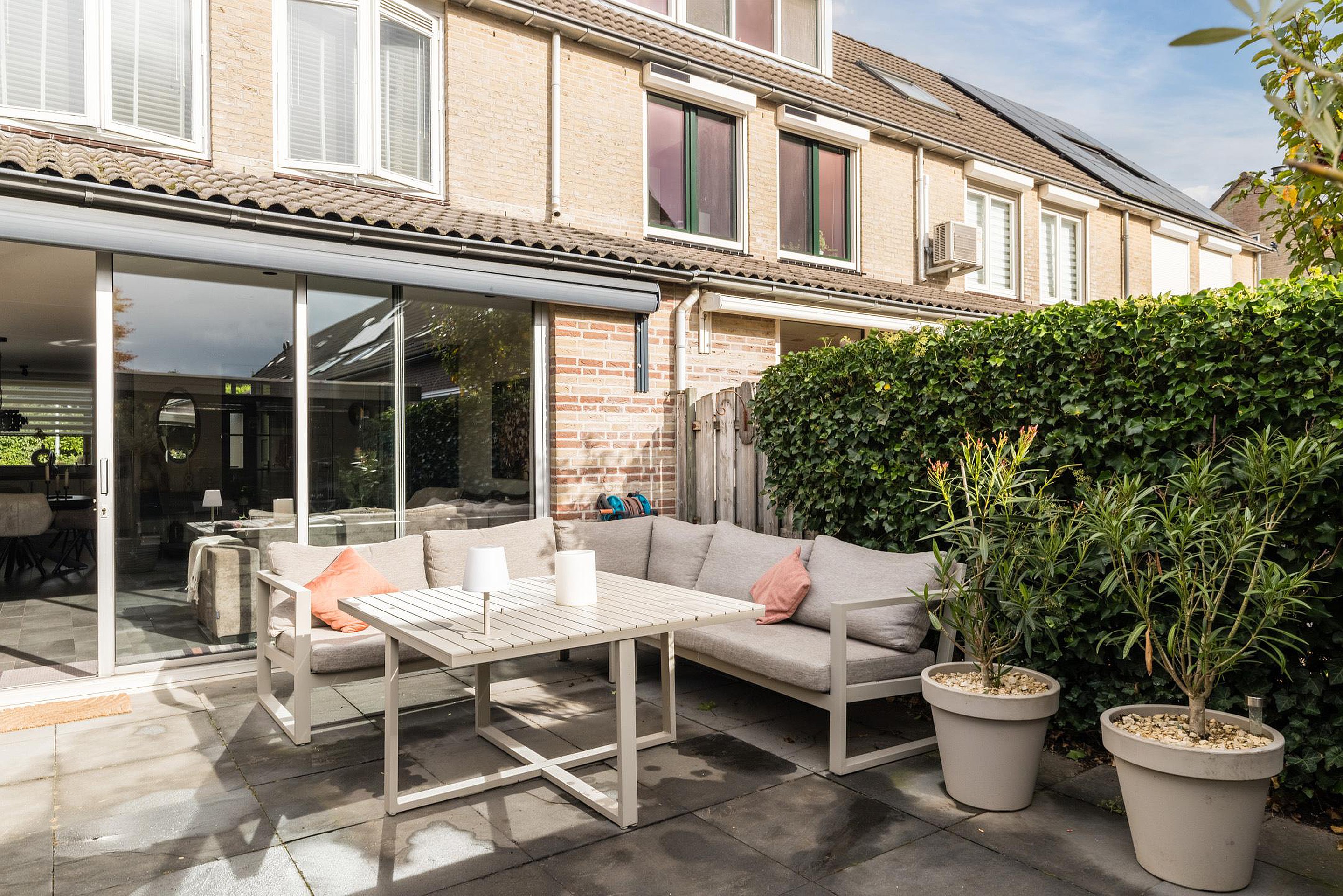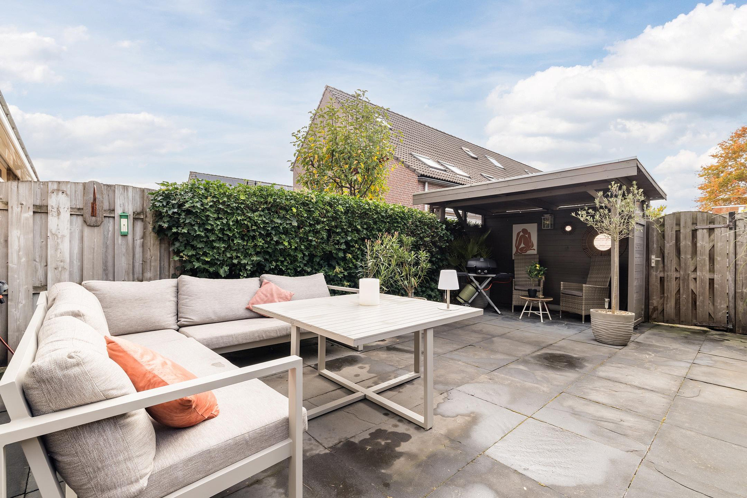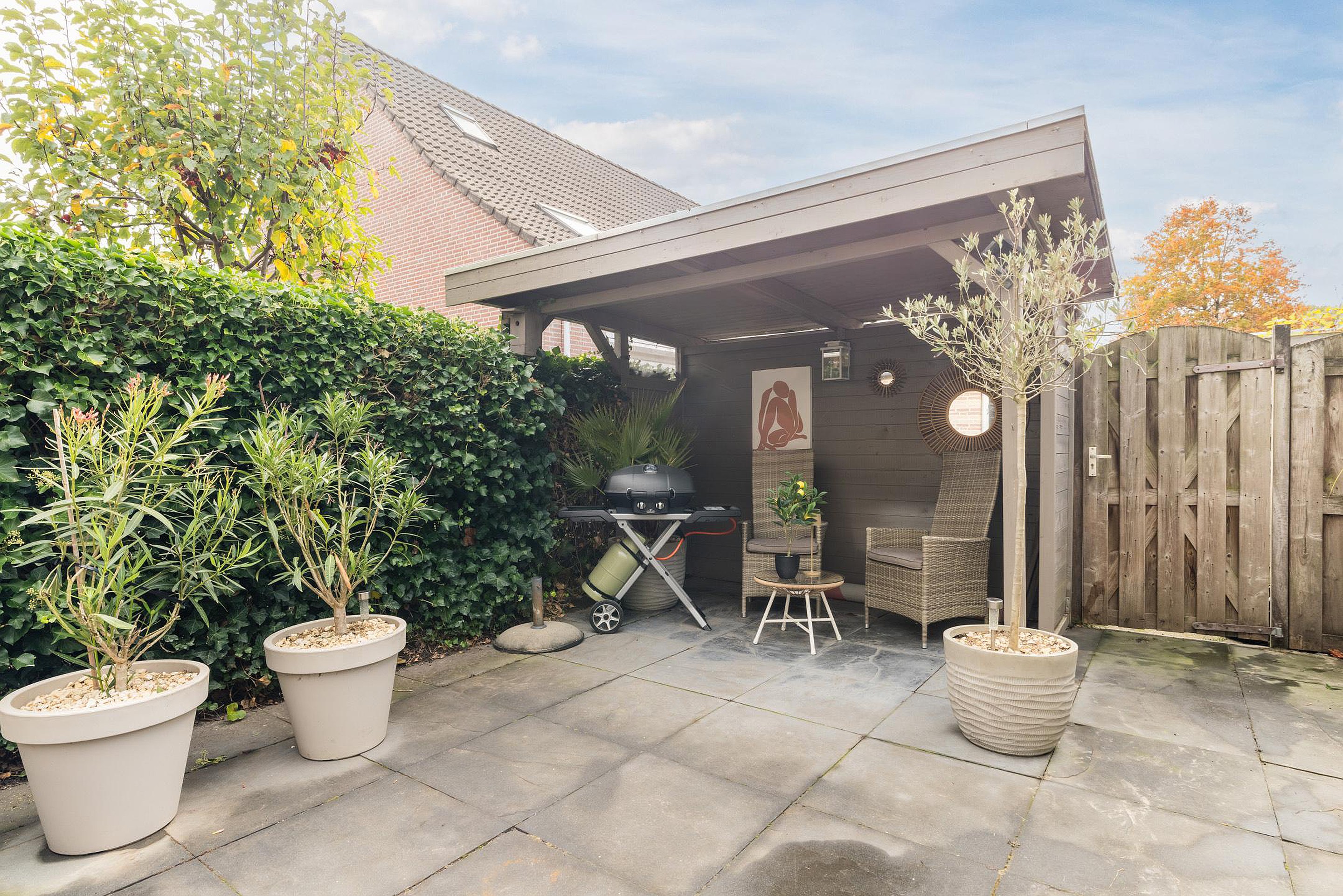 De voortuin is ca 40 m2 groot en mooi bestraat. Je kunt hier gemakkelijk een auto parkeren op eigen terrein. Er is ook een ruime stenen berging van ca. 8m2 met een toegangsdeur aan de zijkant. De riante zonnige achtertuin is op het zuiden gelegen. Een heerlijke plek om van de zon te genieten op de grote terrasruimte met aan de zijkanten borders die mooi beplant zijn. Liever in de schaduw of wat beschutter? Dan kun je fijn zitten onder de fraaie overkapping achterin de tuin. Er is ook een achterom.