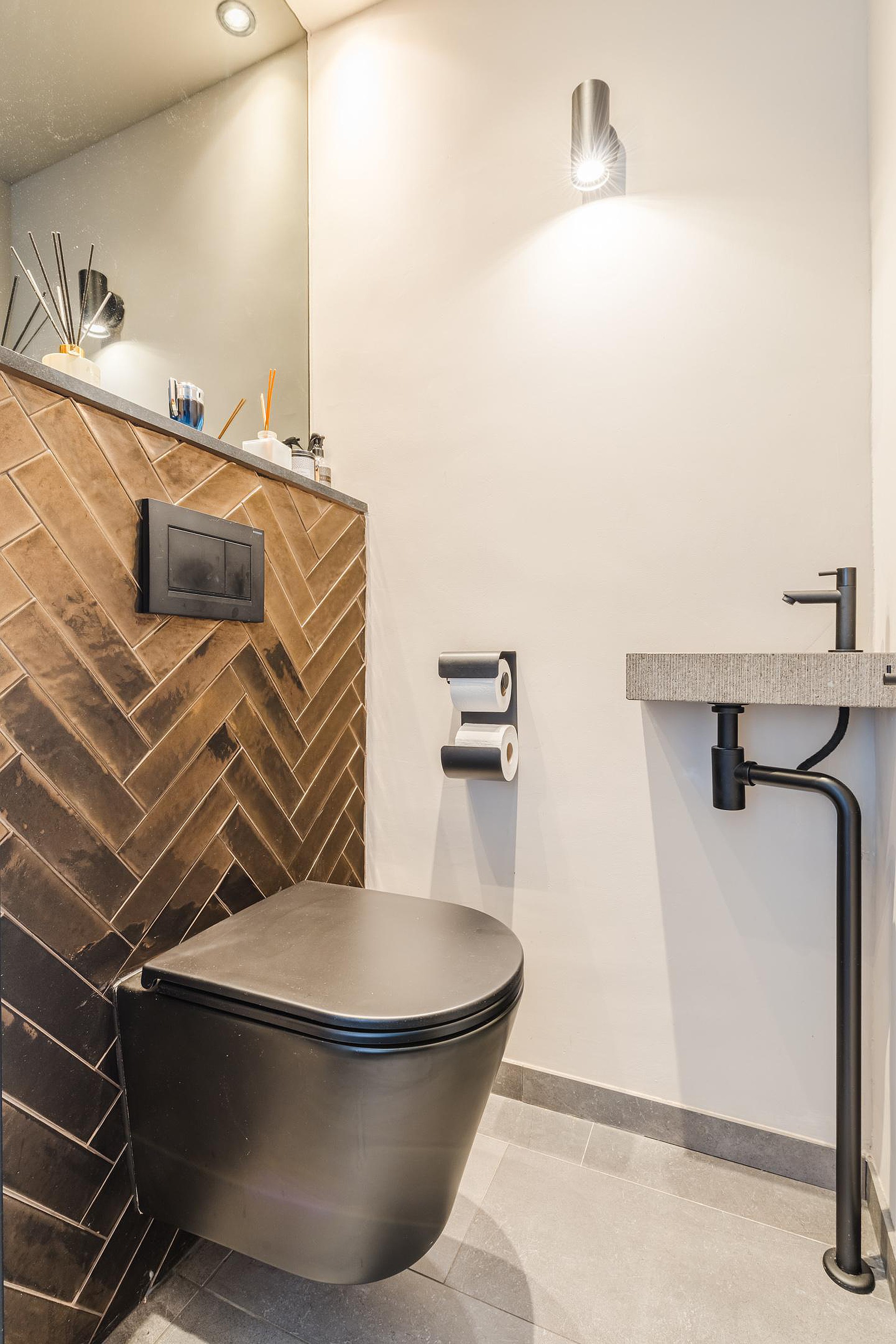 Een modern toilet (2020) met vrijdragend toilet en fonteintje.