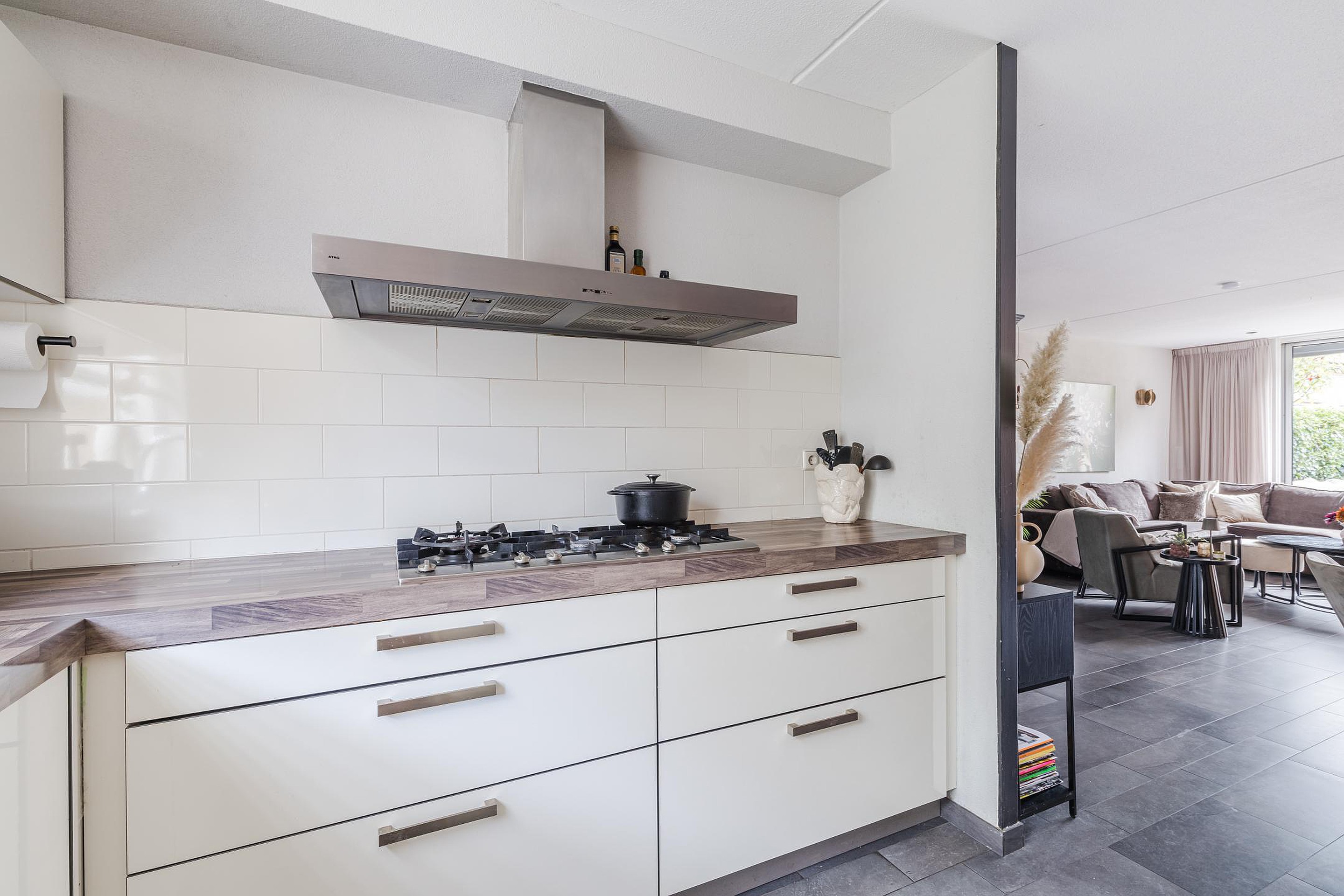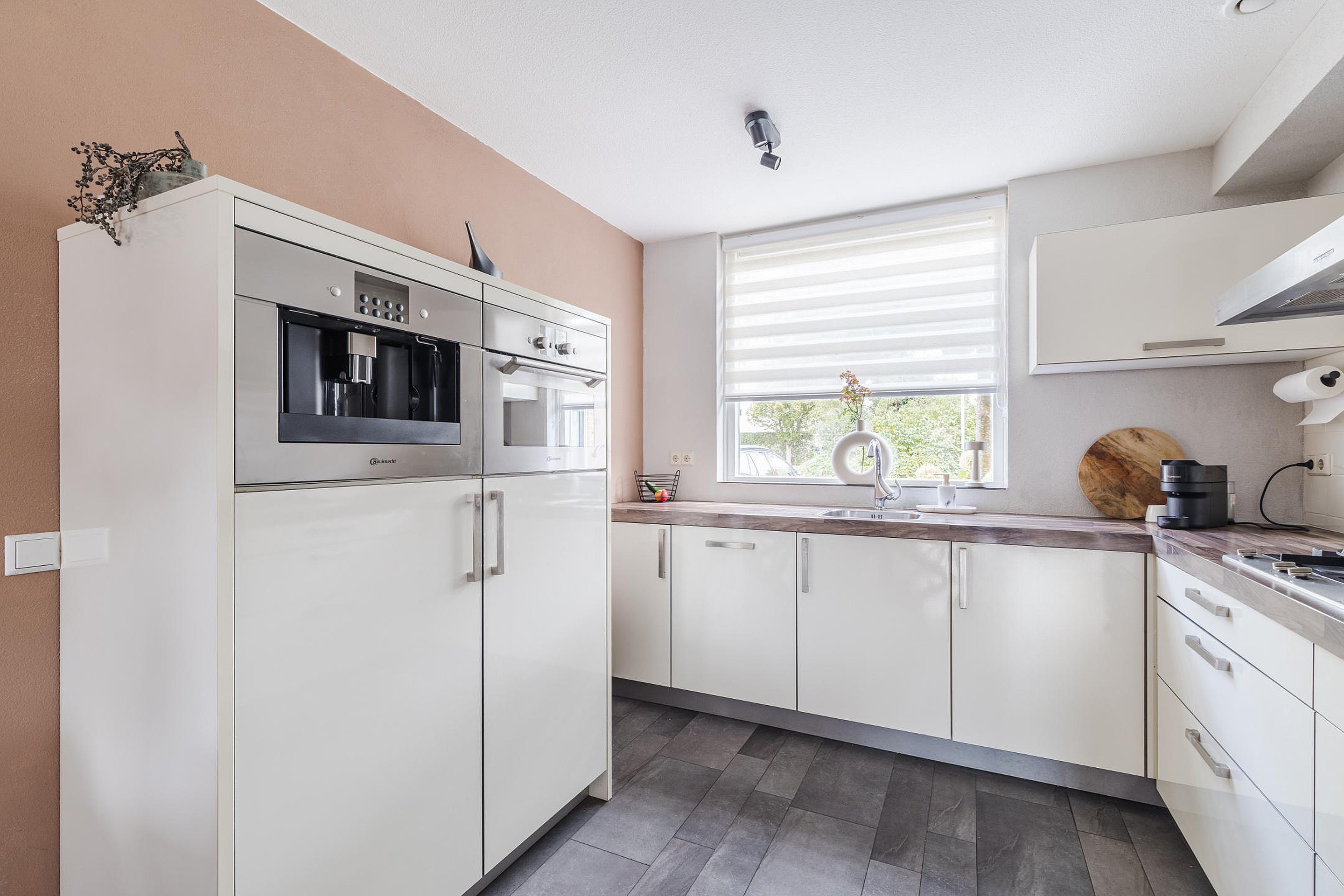 Moderne open keuken voorzien van 5 pits gasfornuis, afzuigkap, combimagnetron, koffiezetapparaat, vaatwasser en koelkast.