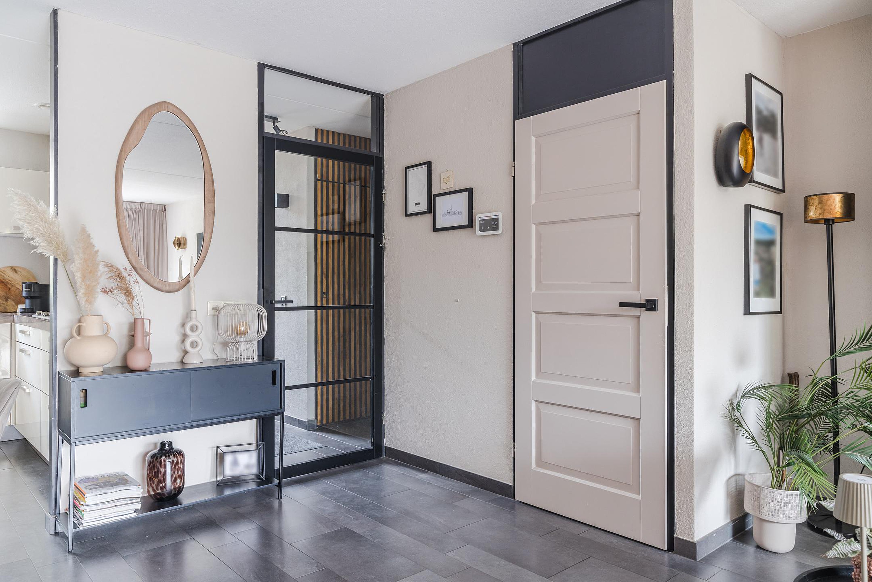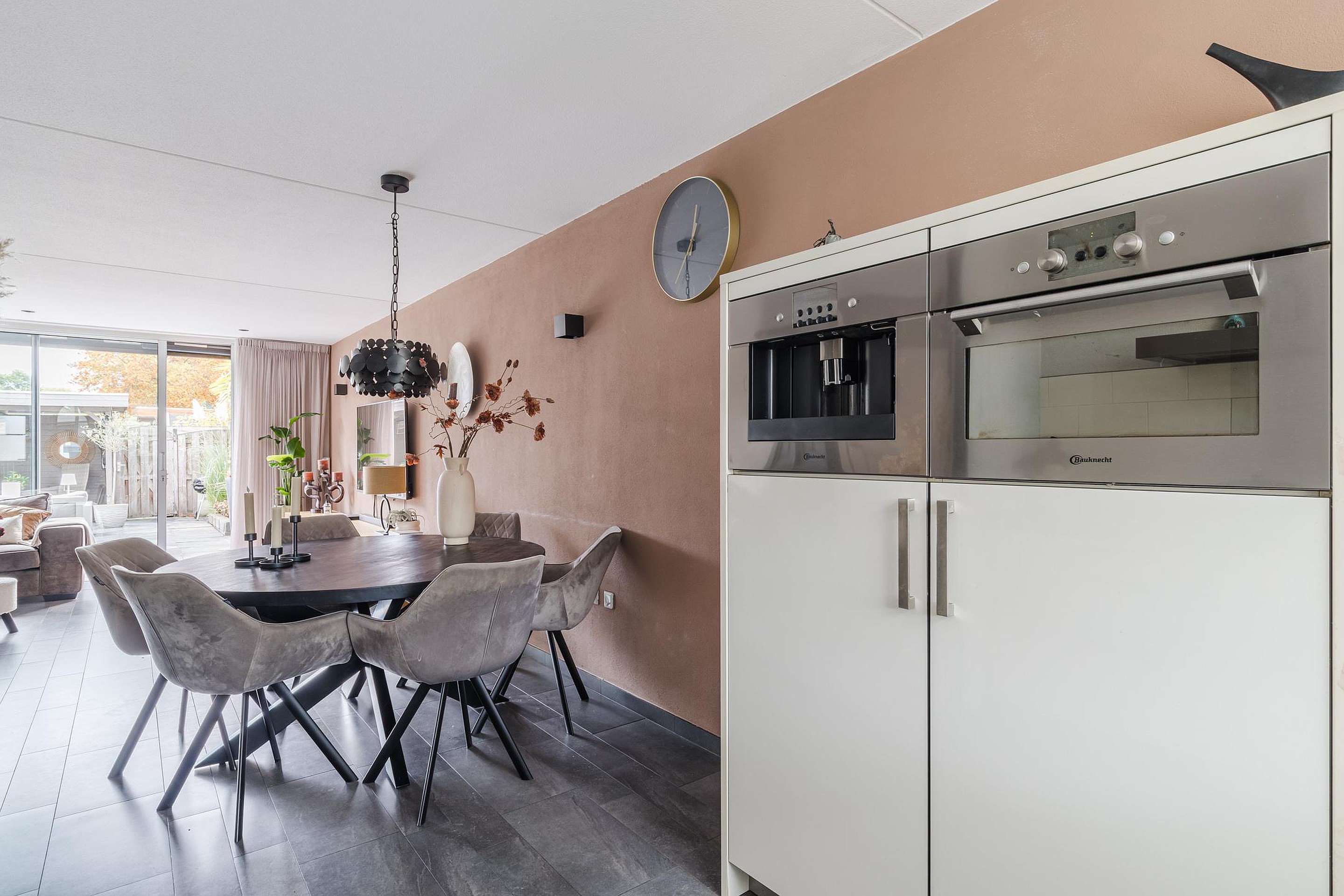 Via de entree kom je in de hal met garderobe, meterkast, modern luxe toilet en vaste trap naar de 1e verdieping. De hal geeft toegang via een mooie industriële deur tot de ruime woonkamer met trapkast. De gehele begane grond is voorzien van vloerverwarming. Via de grote glazen schuifdeuren kom je in de zonnige achtertuin. Door het elektrische zonnescherm kun je de hoeveelheid binnenkomende zon regelen. De moderne keuken ligt aan de voorzijde van het huis en heeft een open verbinding met de woonkamer. De keuken is voorzien van een 5 pits gasfornuis, afzuigkap, combimagnetron, koffiezetapparaat, vaatwasser en koelkast.