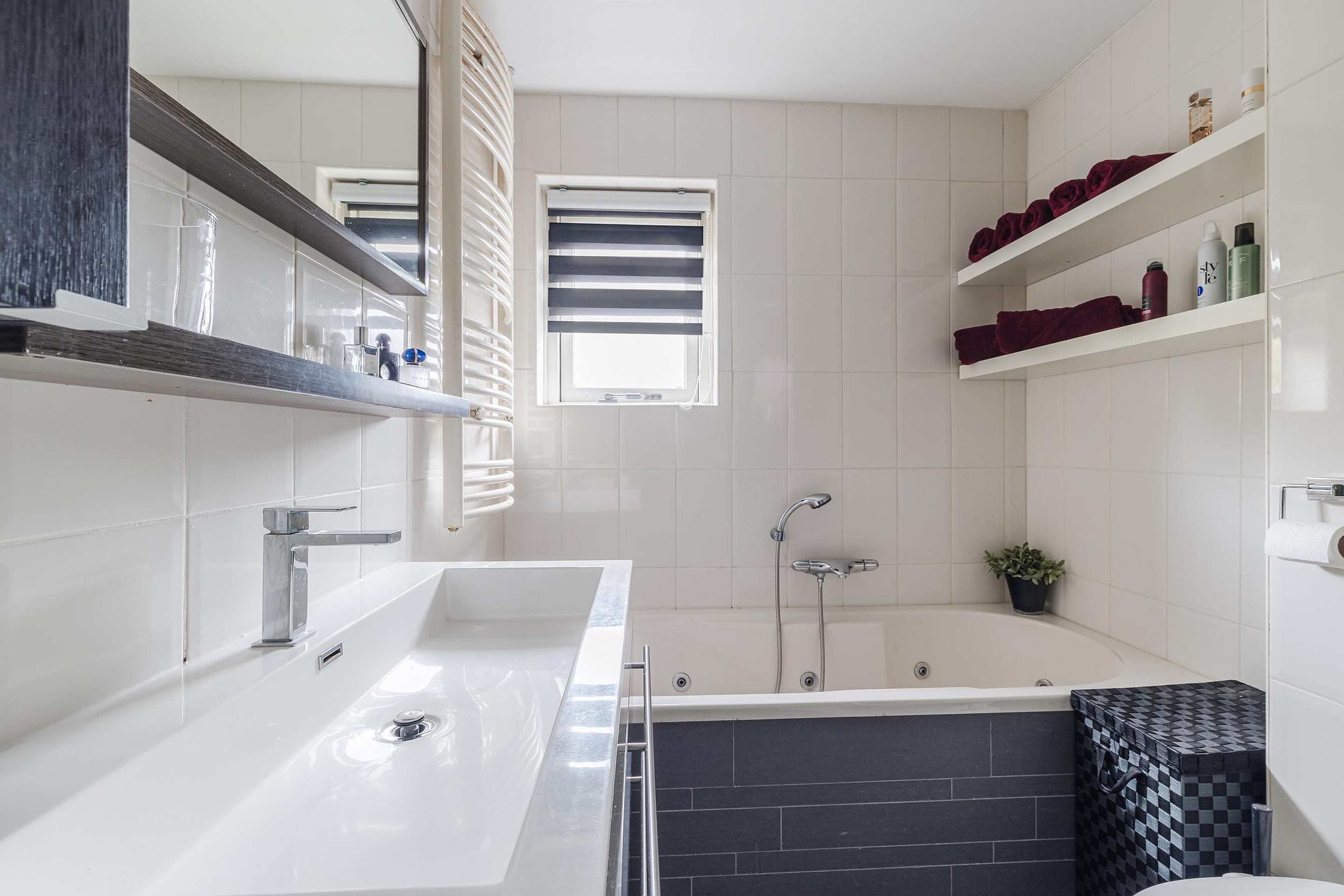 De moderne luxe badkamer is voorzien van een whirlpool, een douchecabine, een wastafelmeubel en een vrijdragend (2e) toilet.
