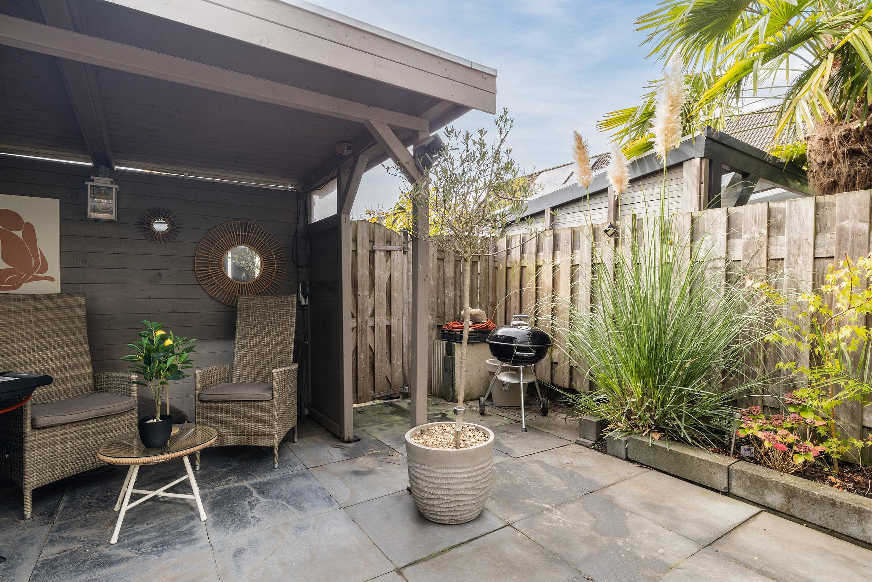 Riante zonnige achtertuin van ca. 45 m2 op het zuiden gelegen, met een fraaie overkapping en een achterom.