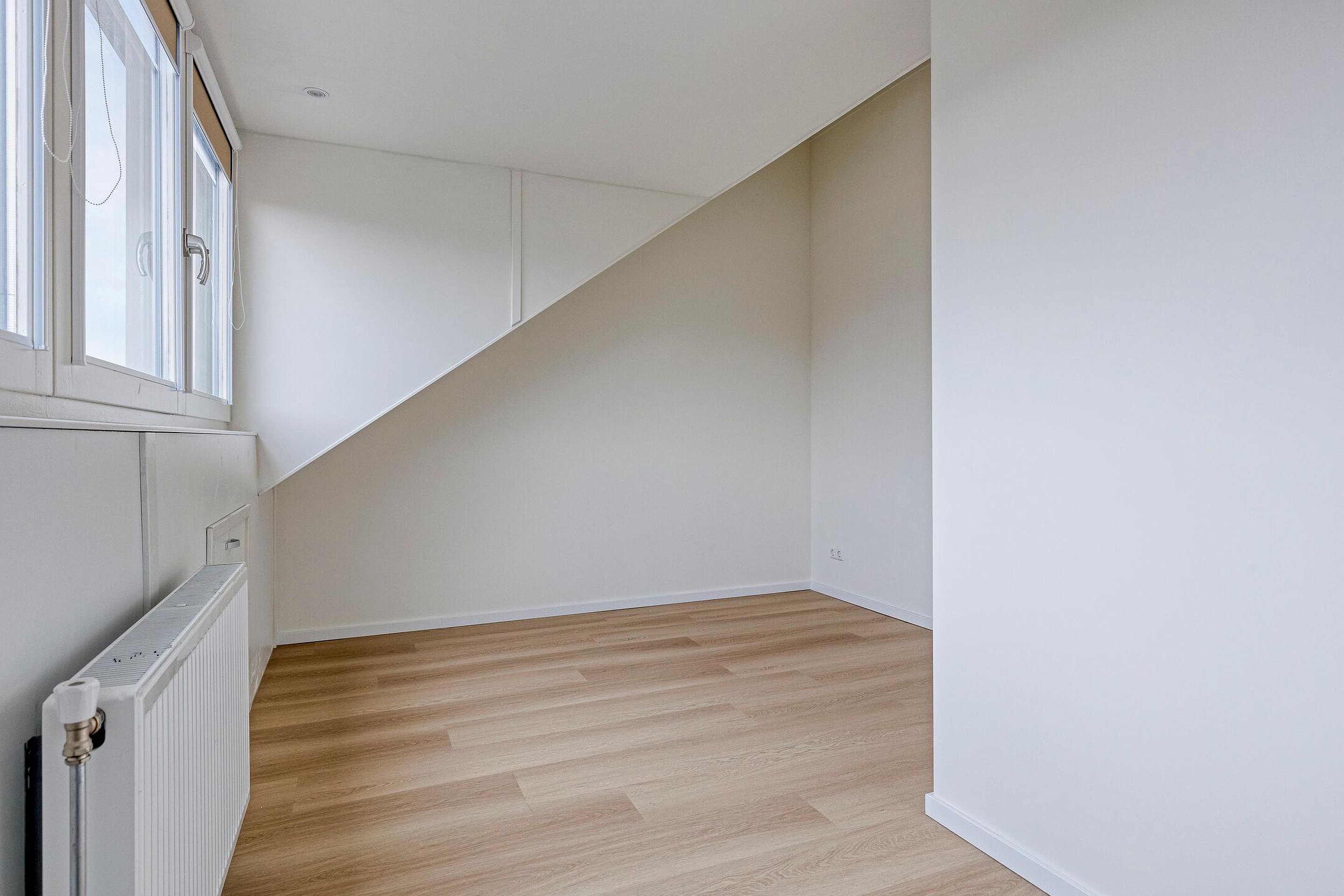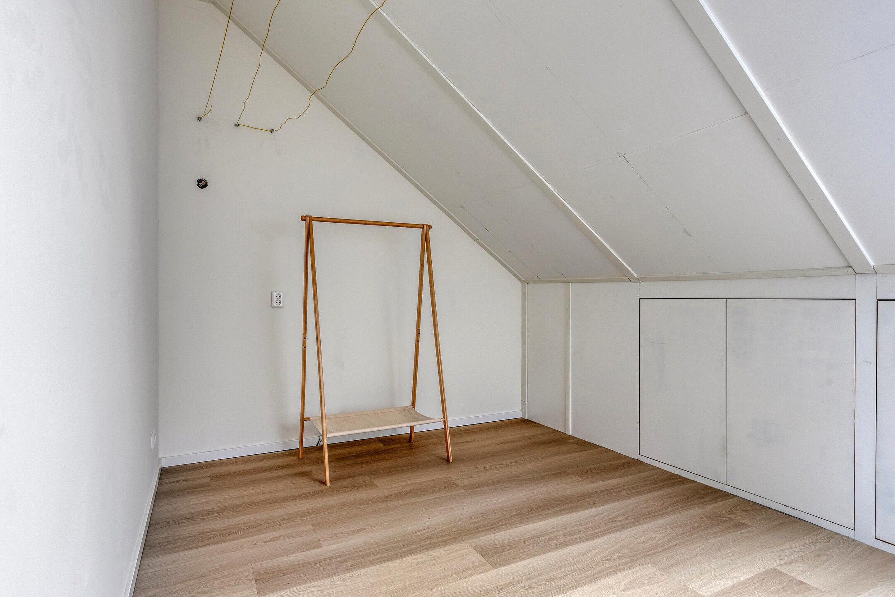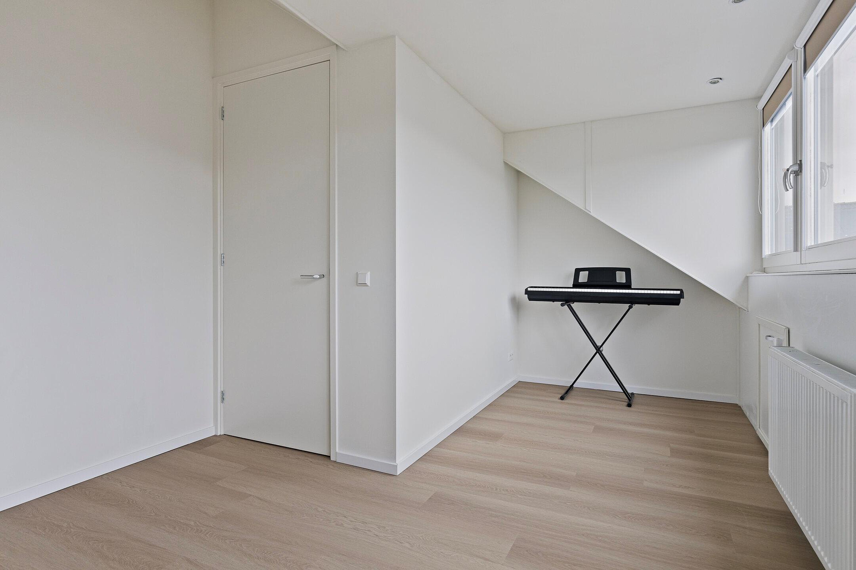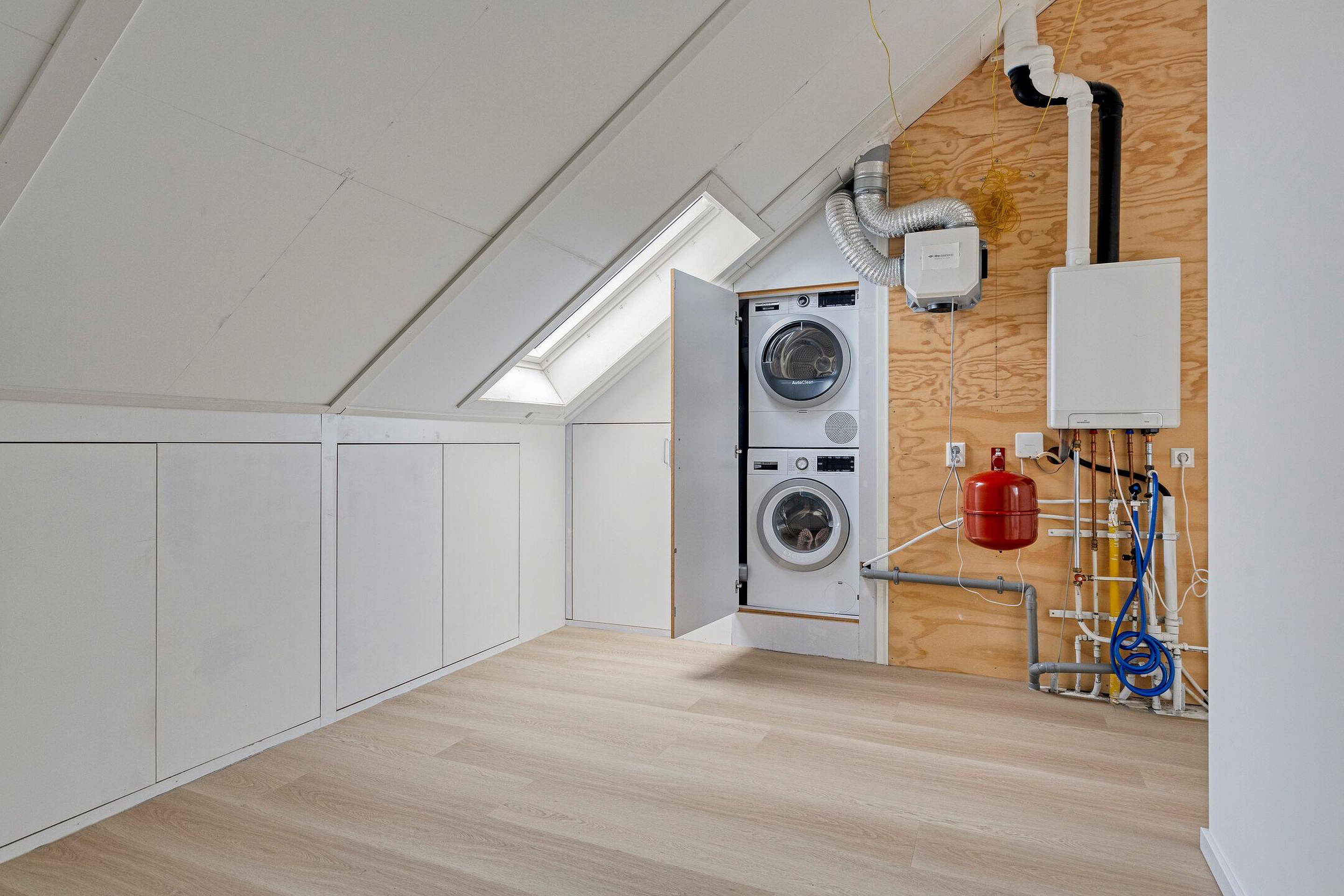 Tweede verdieping Door middel van de vaste trap bereik je de tweede verdieping. Voorzolder met velux dakraam, CV-ketelopstelling en mechanische ventilatie-unit, bergruimte met de witgoedaansluiting. Vierde slaapkamer met knieschotten en dakkapel aan de achterzijde van de woning.