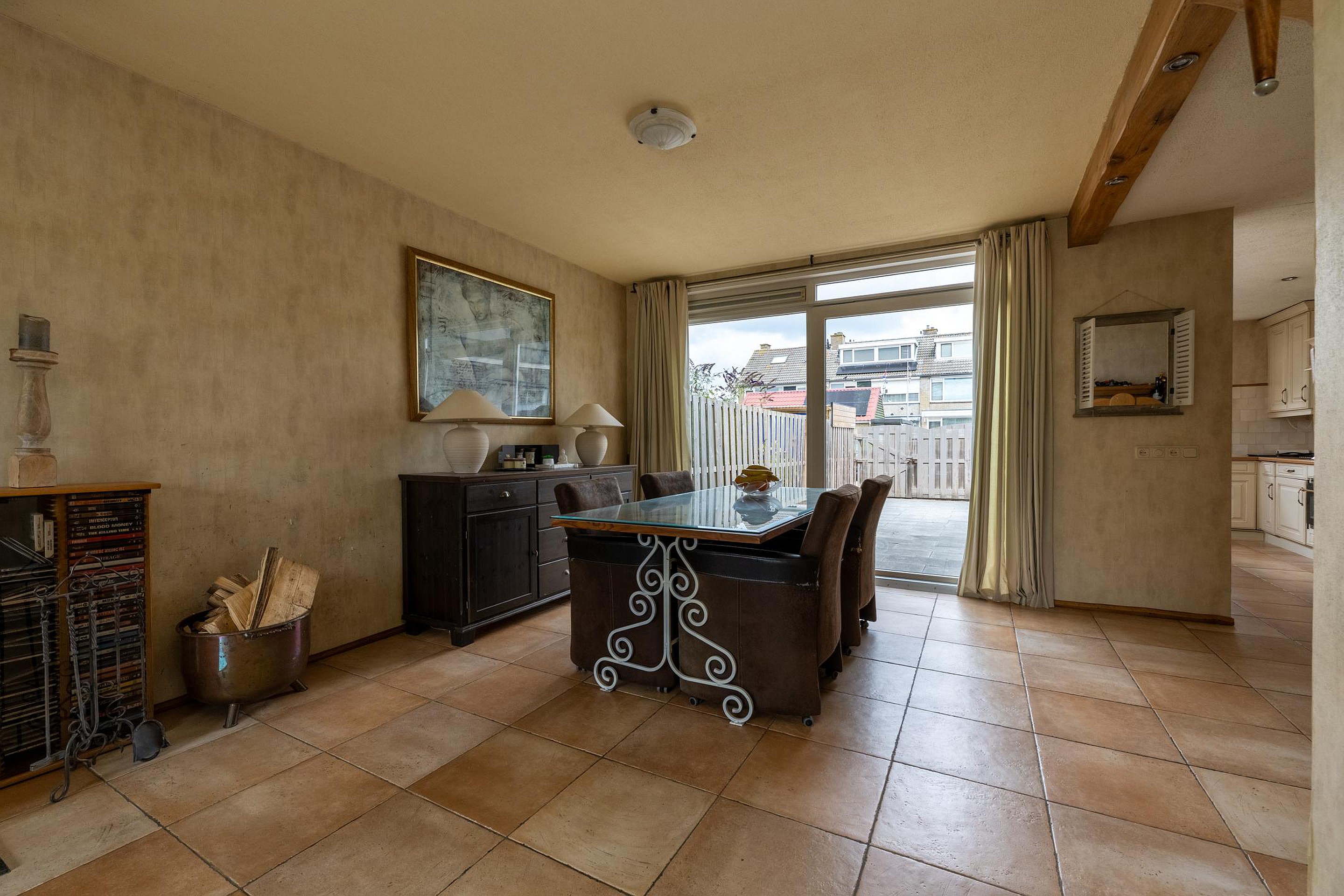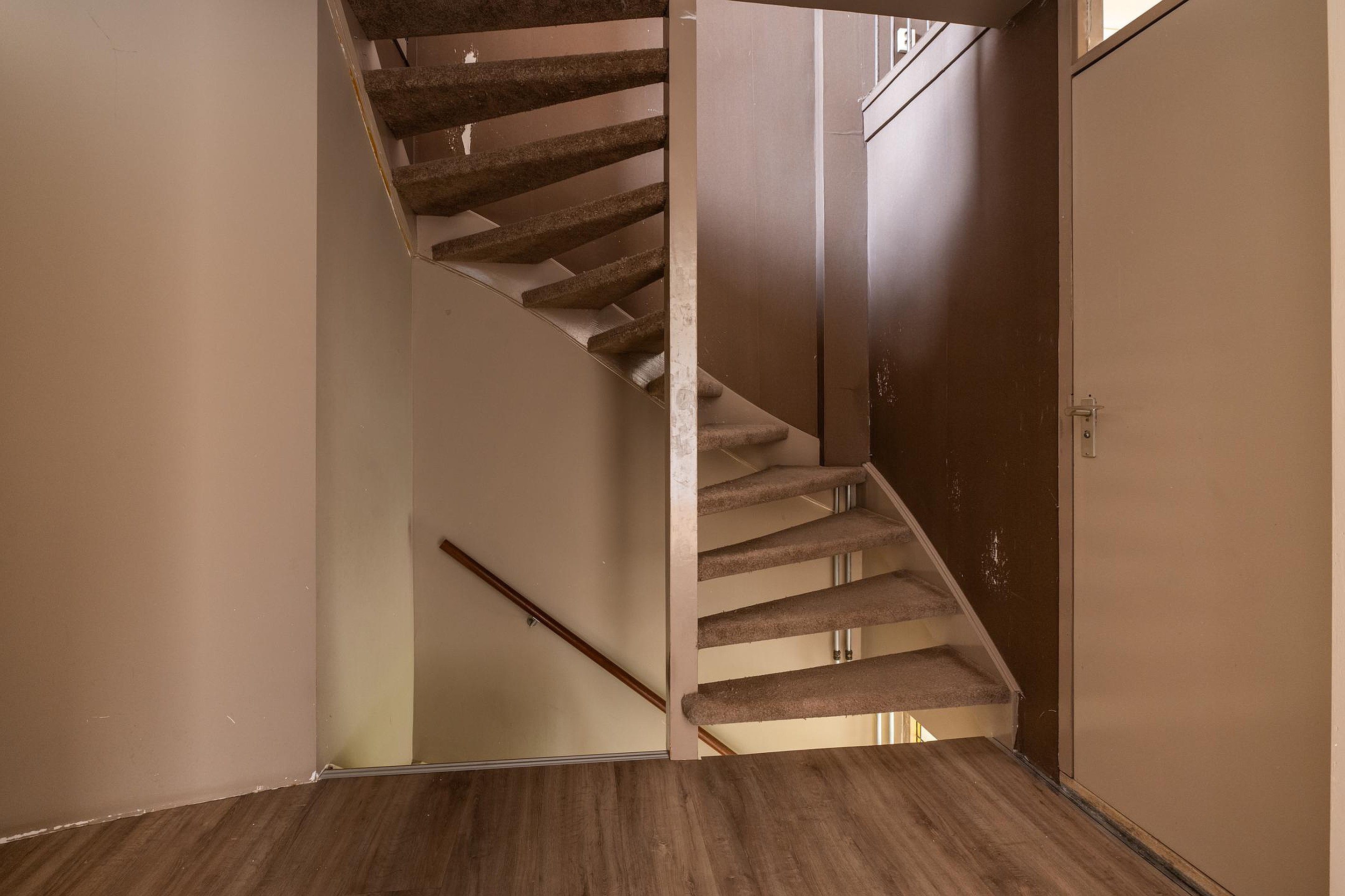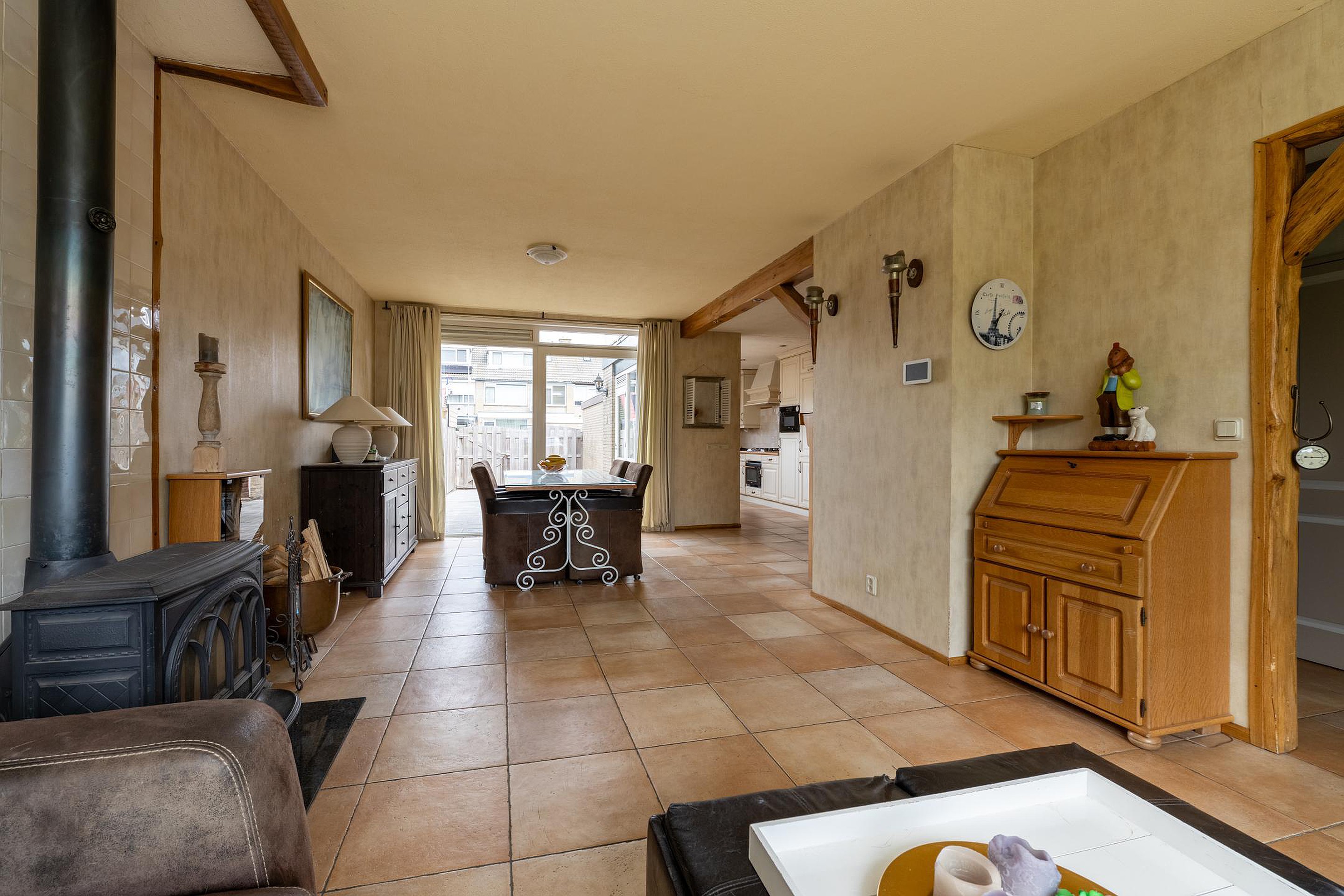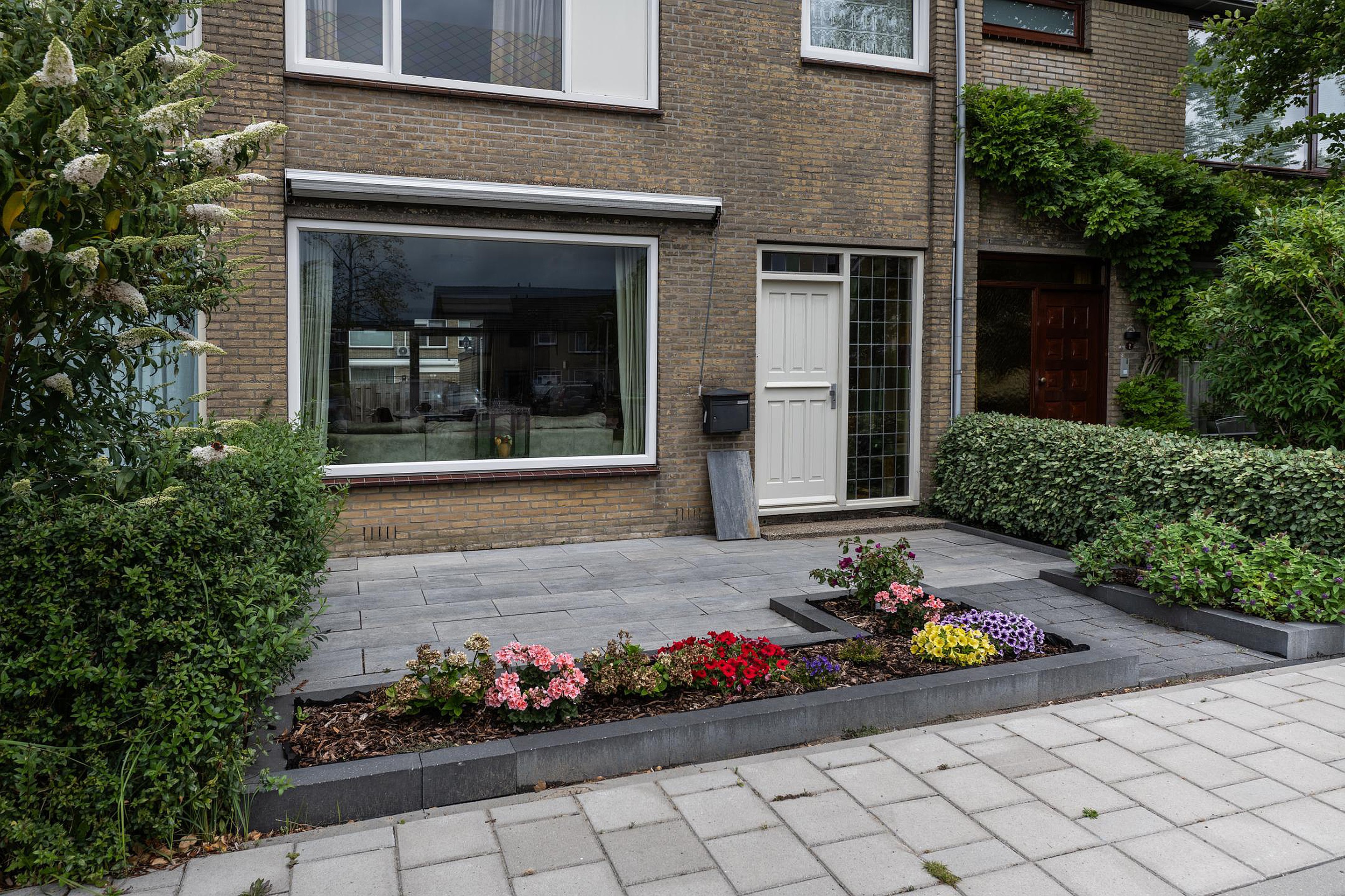 Begane grond U komt binnen in de af te sluiten entree, vervolgens betreedt u de hal met de trapopgang, trapkast, toiletruimte en de meterkast. Via deze hal komt u in de ruime woonkamer. Zoals hiervoor beschreven is de originele indeling gewijzigd, waardoor de originele keukenruimte nu ook bij de woonkamer gerekend kan worden. Aan de achterzijde van de woonkamer is een schuifpui aanwezig voor directe toegang tot de achtertuin. De keuken is in een hoekopstelling geplaatst en voorzien van diverse inbouwapparatuur, waaronder een vijfpits gaskookplaat met afzuigkap, een oven, magnetron en koelkast. Ook via de keuken heeft u middels de tuindeur toegang tot de achtertuin. De tuin is grotendeels voorzien van bestrating, er is een ruime berging aanwezig.