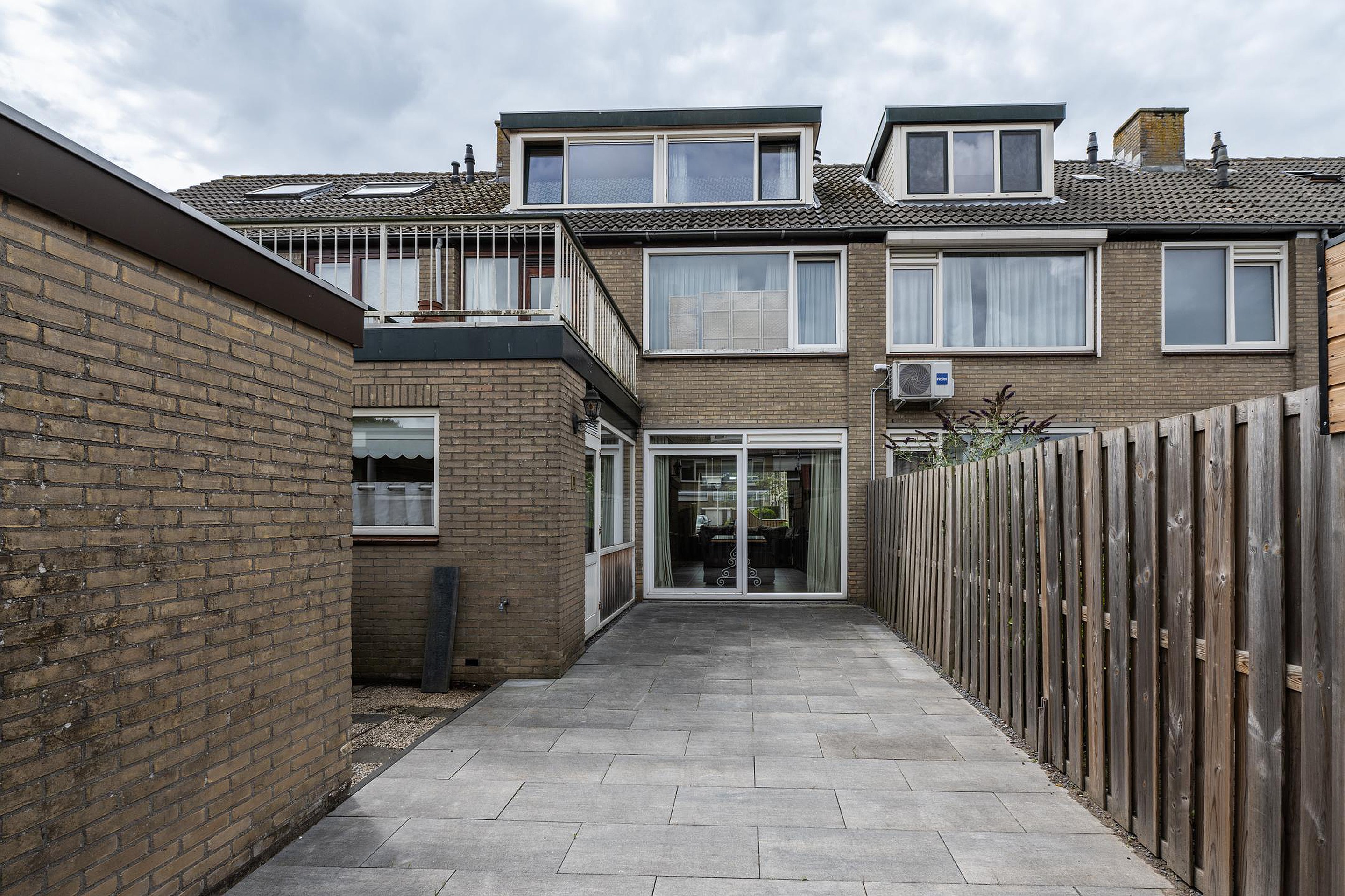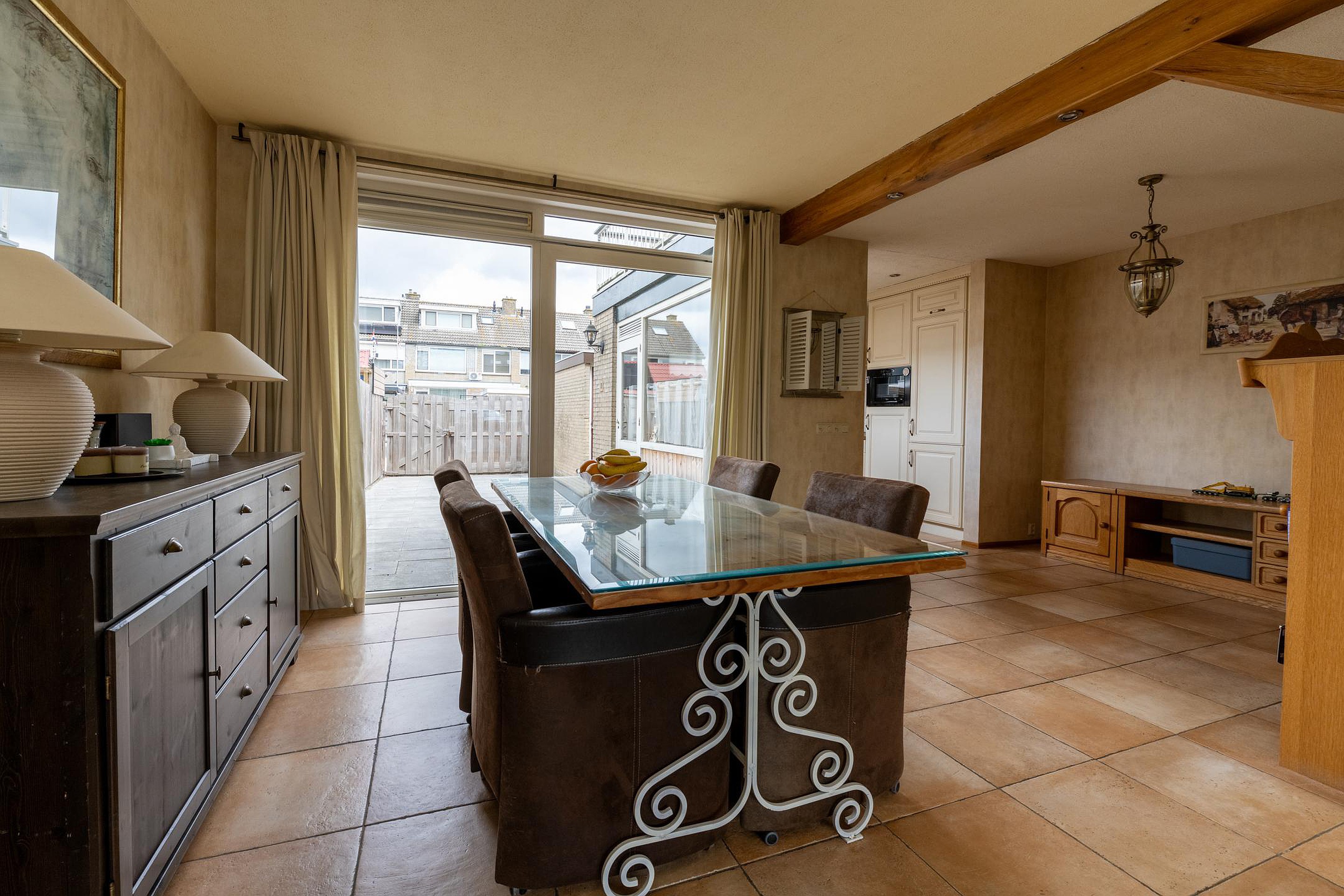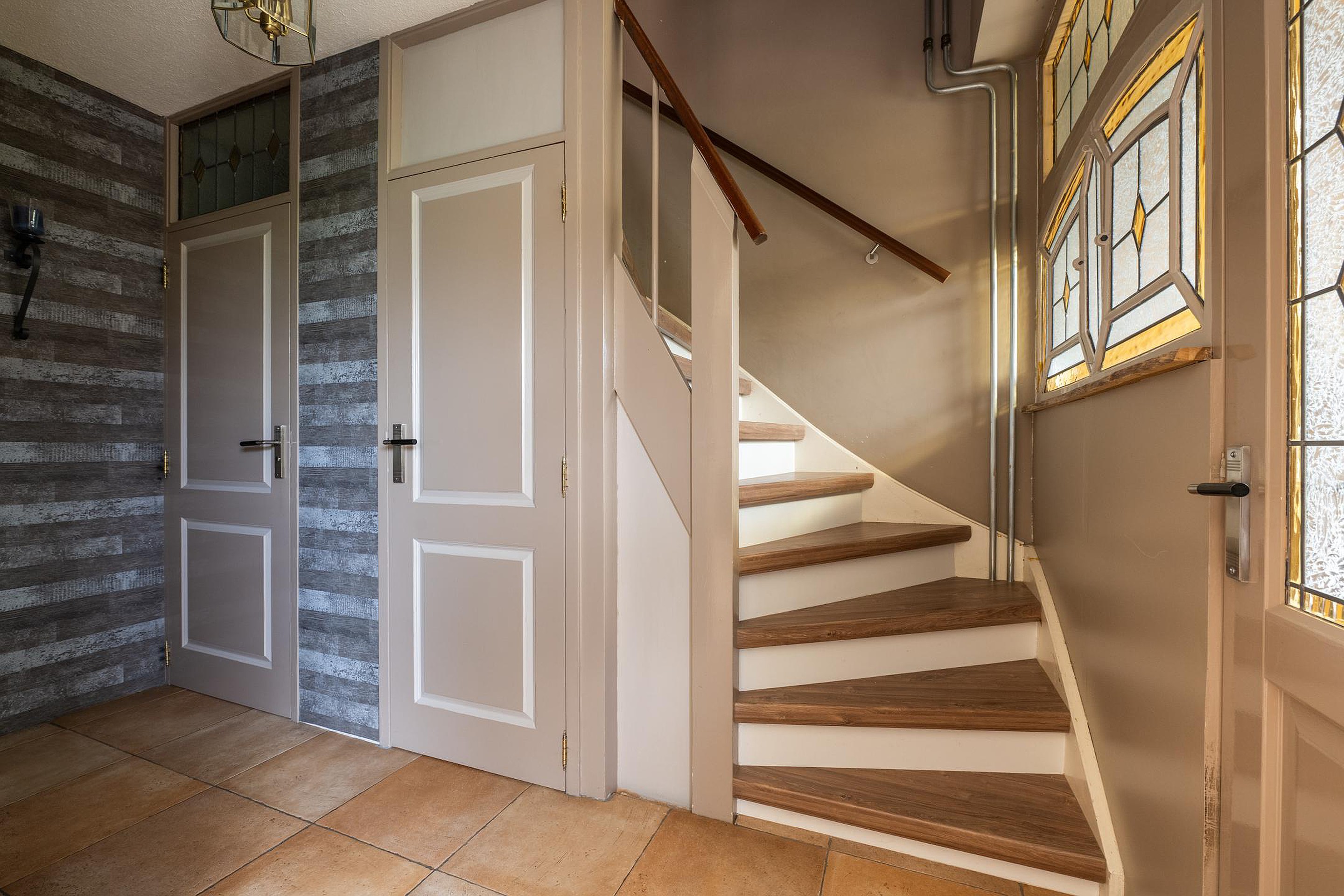 Begane grond U komt binnen in de af te sluiten entree, vervolgens betreedt u de hal met de trapopgang, trapkast, toiletruimte en de meterkast. Via deze hal komt u in de ruime woonkamer. Zoals hiervoor beschreven is de originele indeling gewijzigd, waardoor de originele keukenruimte nu ook bij de woonkamer gerekend kan worden. Aan de achterzijde van de woonkamer is een schuifpui aanwezig voor directe toegang tot de achtertuin. De keuken is in een hoekopstelling geplaatst en voorzien van diverse inbouwapparatuur, waaronder een vijfpits gaskookplaat met afzuigkap, een oven, magnetron en koelkast. Ook via de keuken heeft u middels de tuindeur toegang tot de achtertuin. De tuin is grotendeels voorzien van bestrating, er is een ruime berging aanwezig.