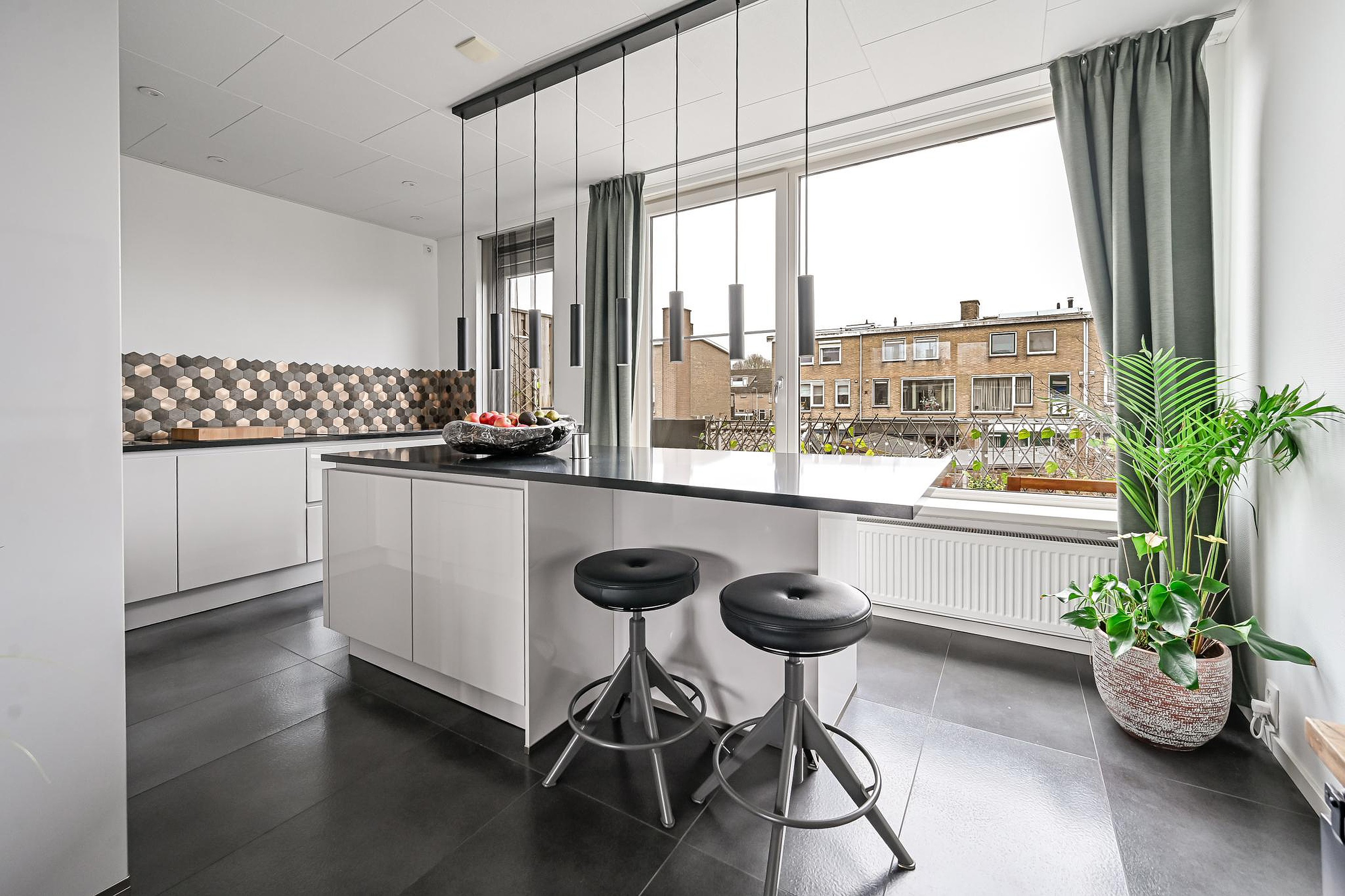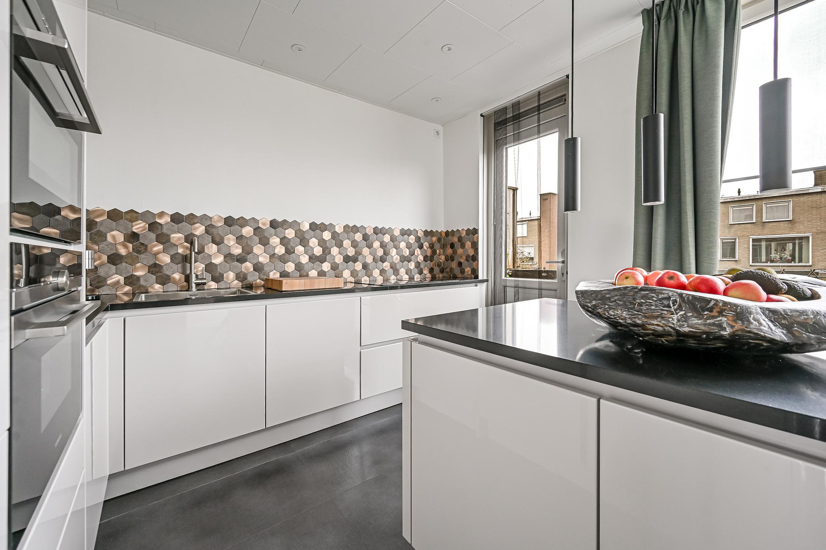 De moderne open keuken met kookeiland is uitgerust met diverse inbouwapparatuur en biedt volop werk- en opbergruimte. Vanuit de keuken heb je toegang tot het balkon, eveneens gelegen op het zuiden.