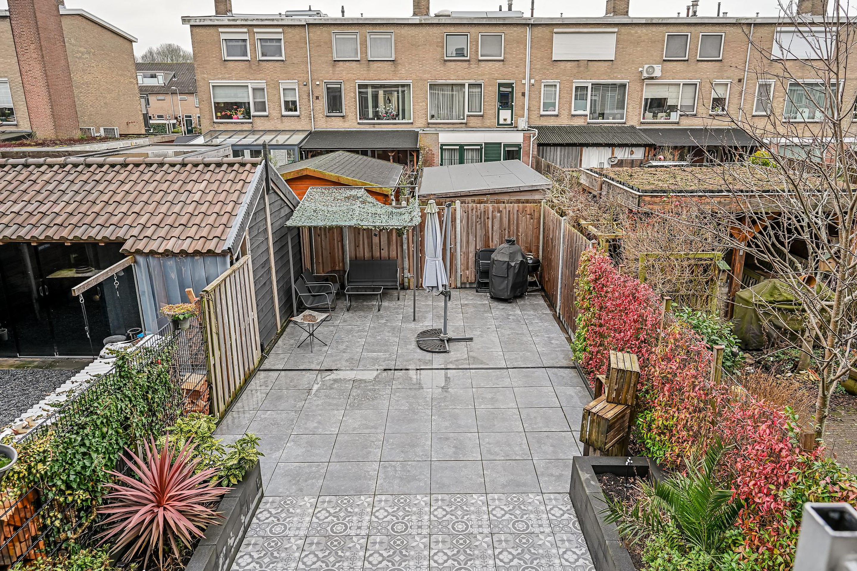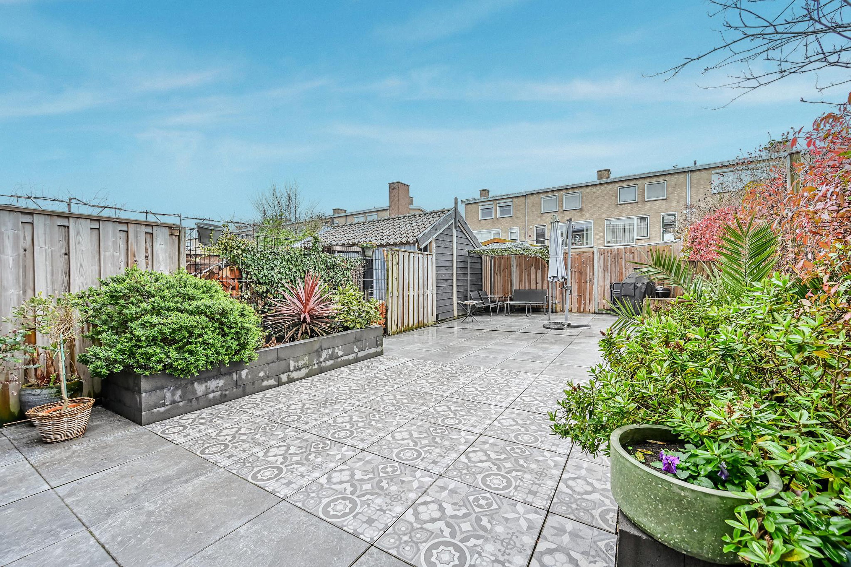 De achtertuin (2022) is netjes betegeld, gelegen op het zuiden en beschikt over een achterom. Hier geniet je de hele dag van de zon.