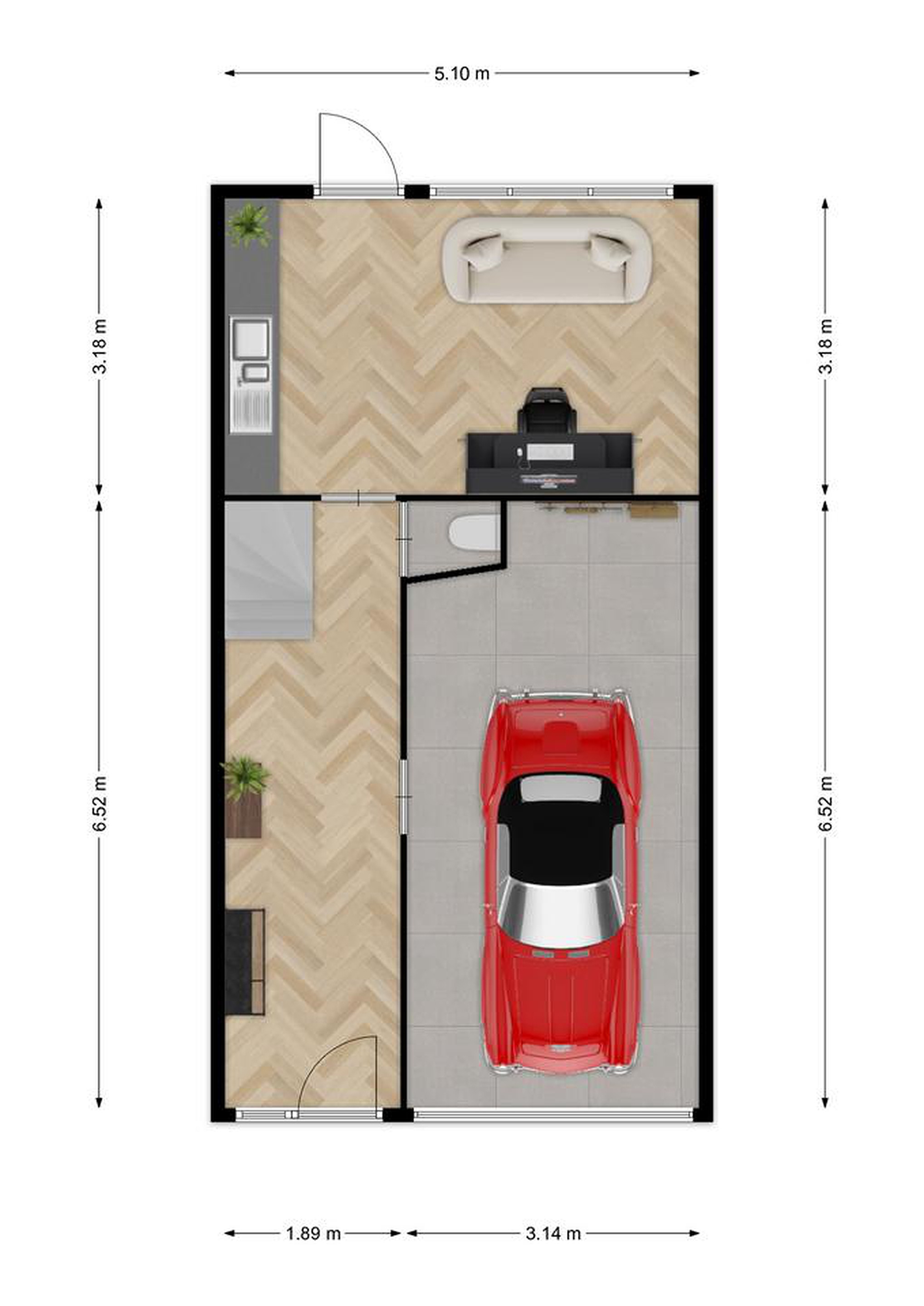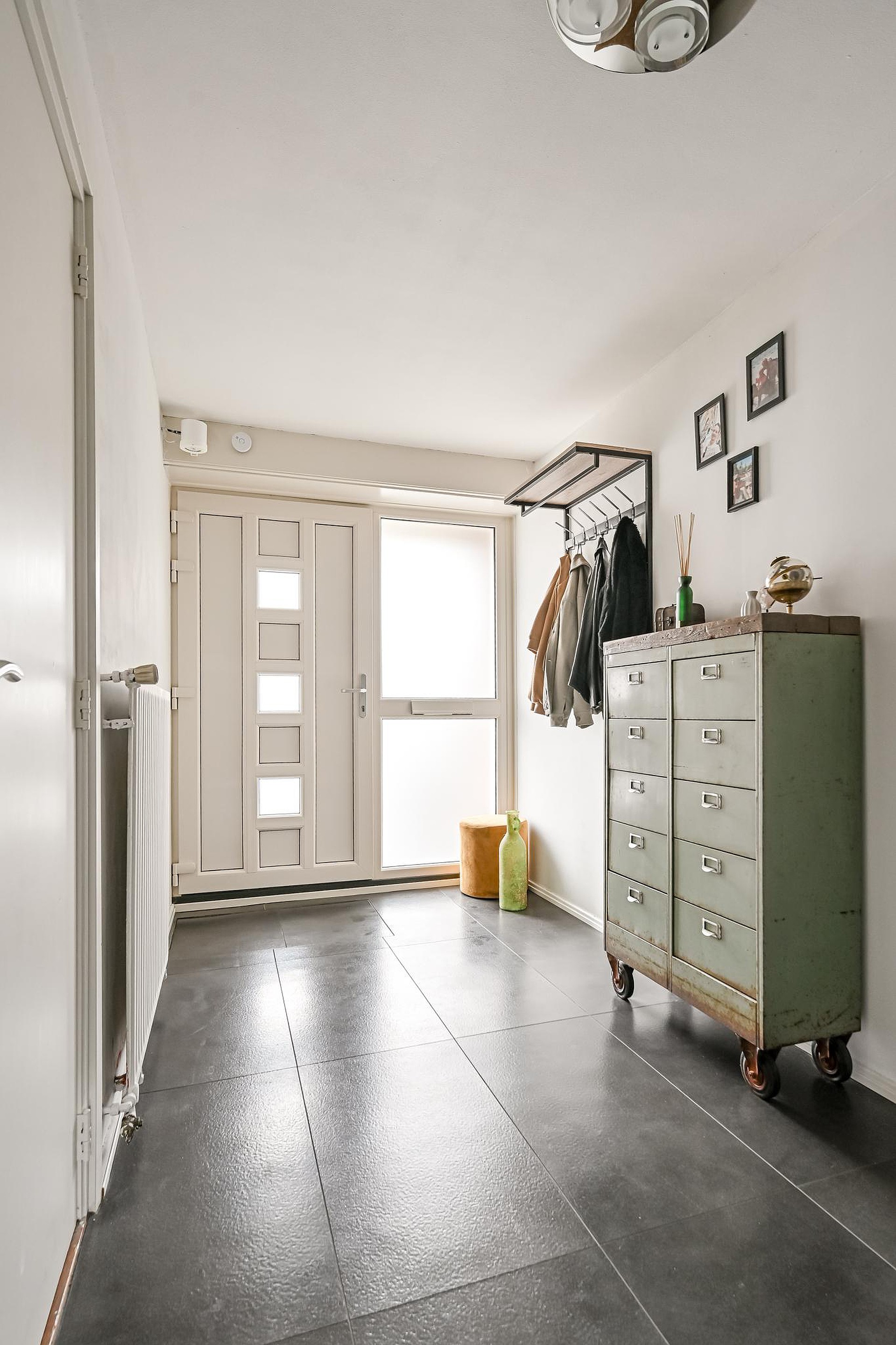 Via de verzorgde voortuin (2024) met eigen oprit bereik je de entree van de woning. In de hal bevinden zich het toilet en de toegang tot de garage (ca. 20 m2).