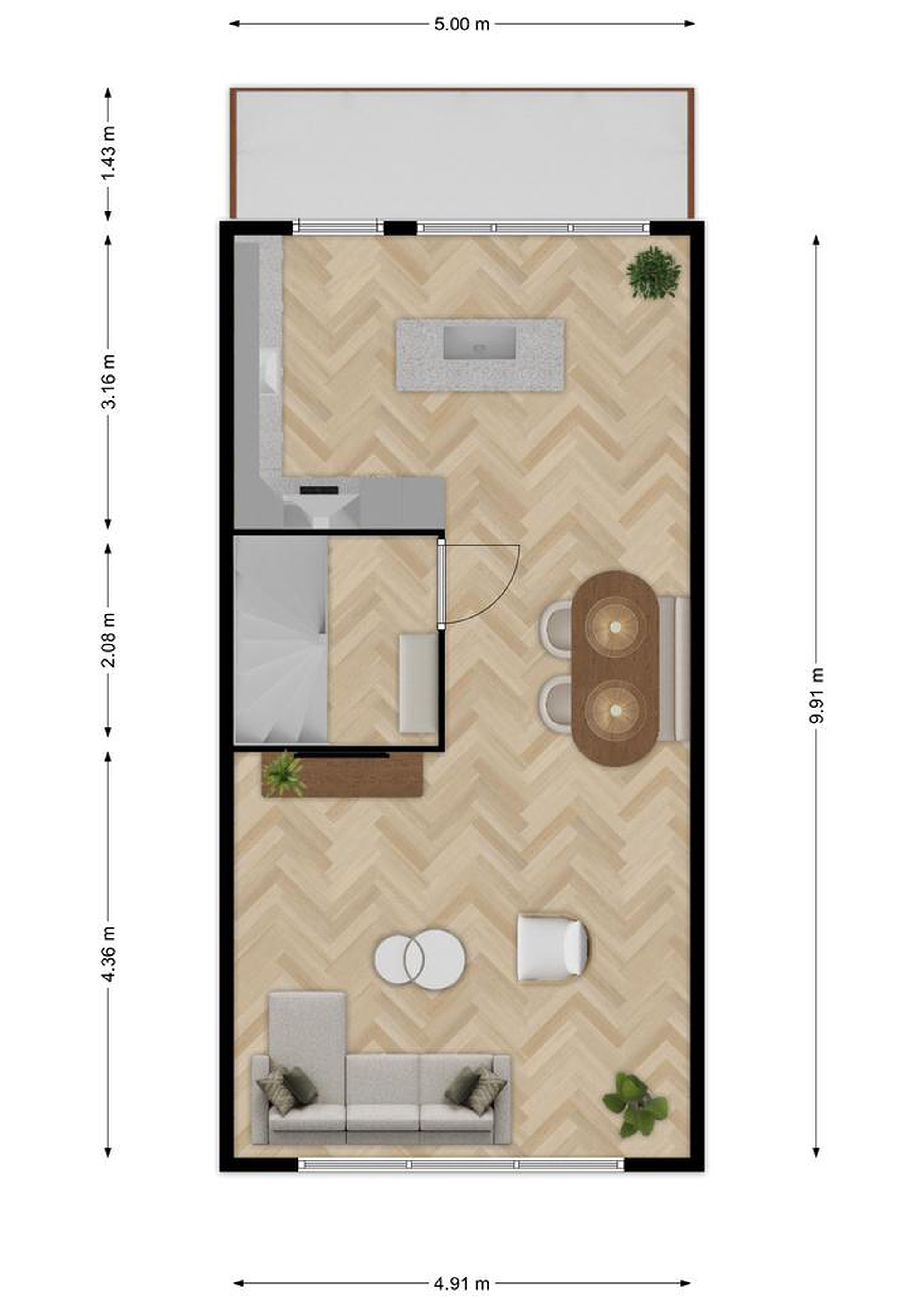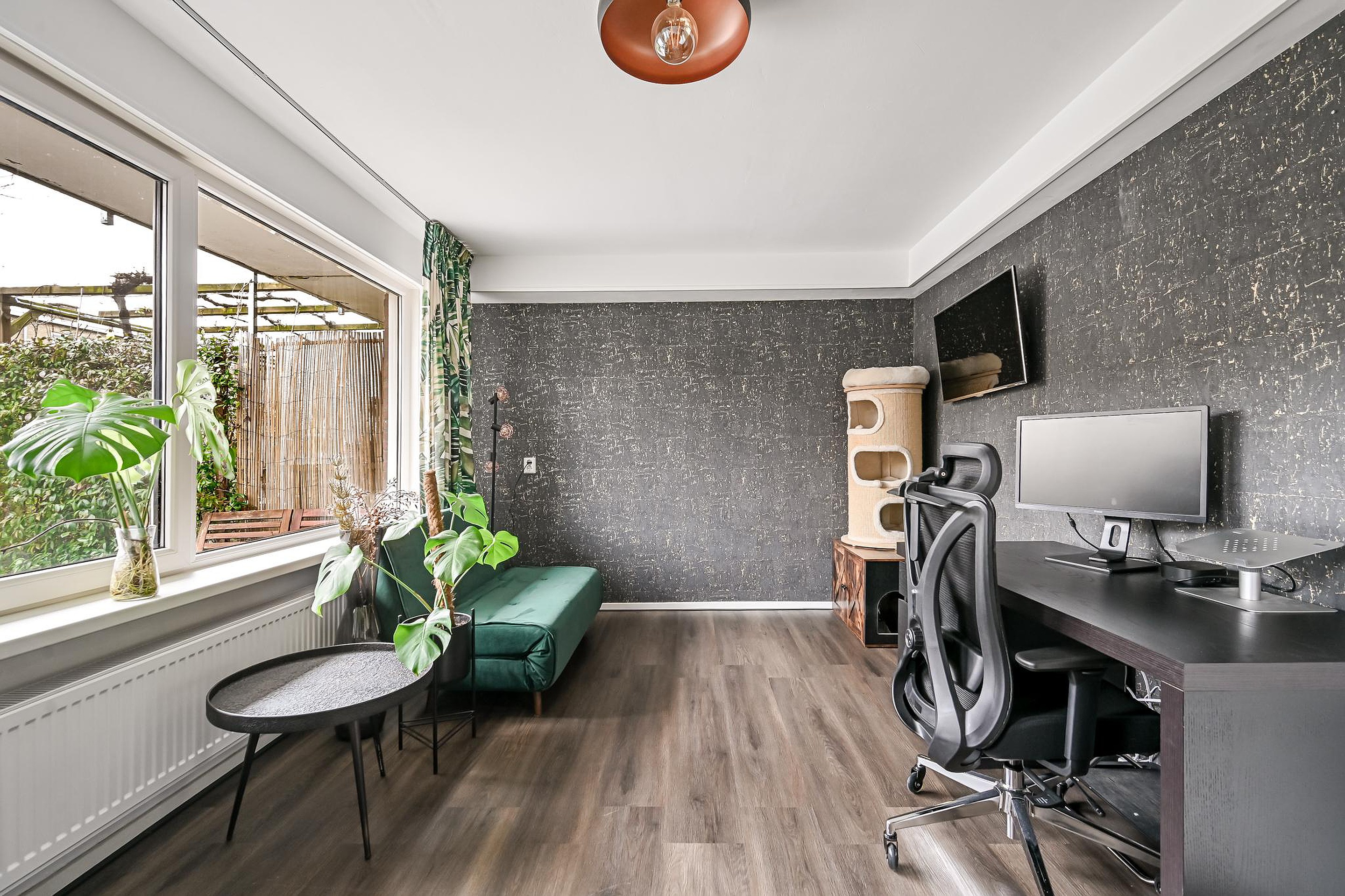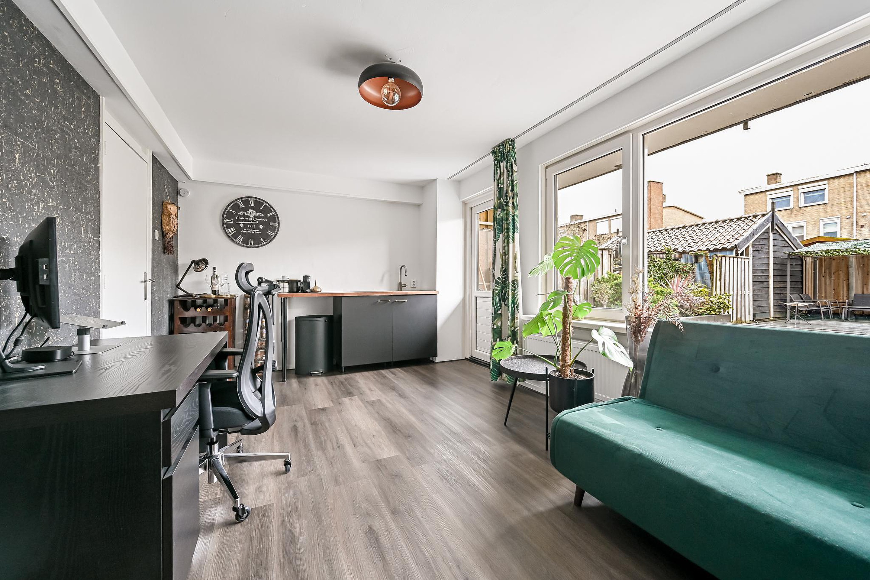 Daarnaast is er op deze verdieping een extra ruimte, momenteel ingericht als kantoor met keukenmeubel, ideaal als werkruimte aan huis, praktijkruimte of hobbykamer. Vanuit deze ruimte stap je direct de diepe achtertuin in.
