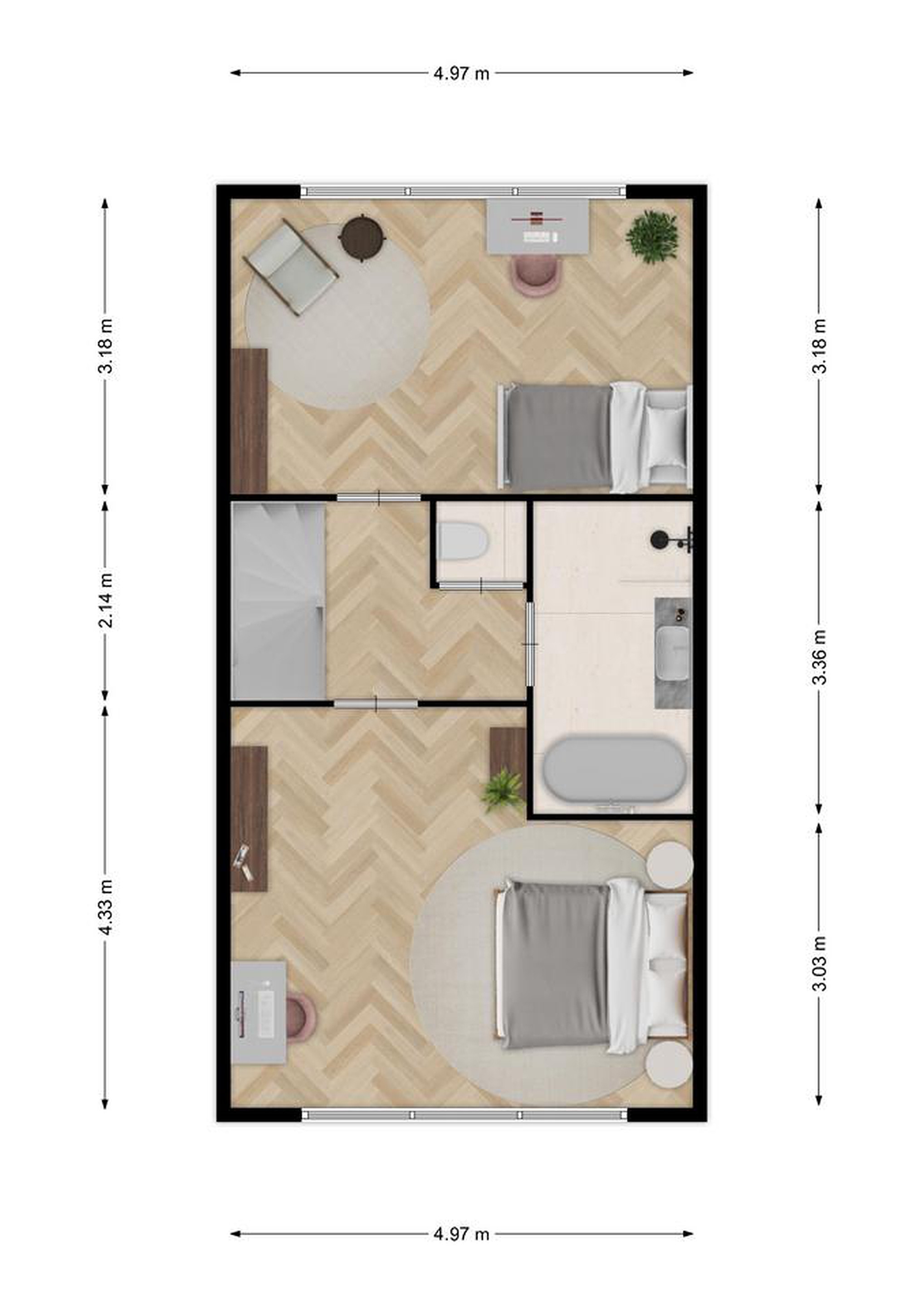 Op de bovenste verdieping bevinden zich twee ruime slaapkamers. Eén slaapkamer is voorzien van een airco en beide kamers beschikken over elektrische rolluiken.