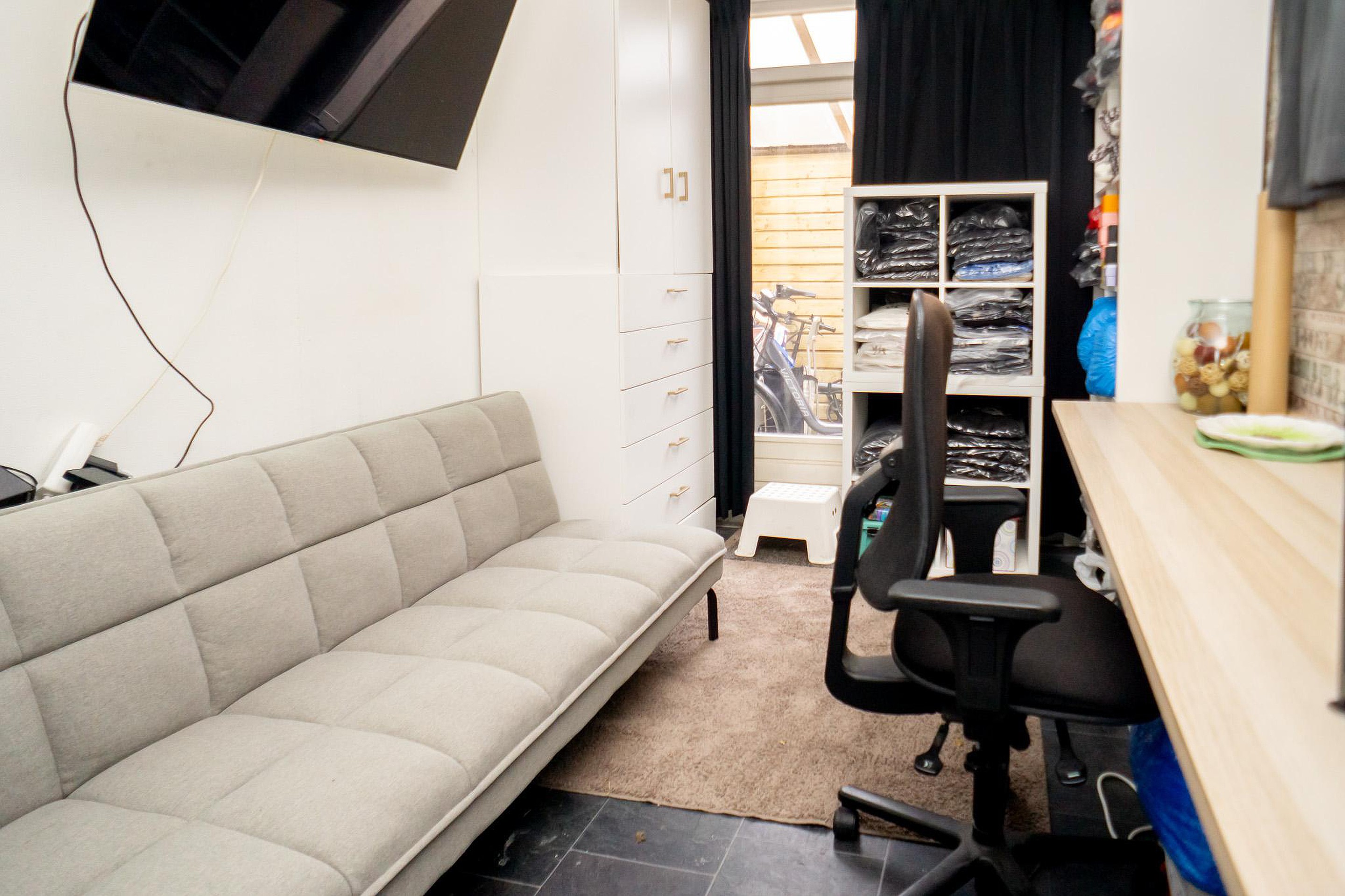 Vanuit de tuin heeft u toegang tot de aangebouwde studio, deze beschikt over een badkamer, een keuken en een woon/slaapkamer ideaal voor kangoeroe wonen of praktijk aan huis.