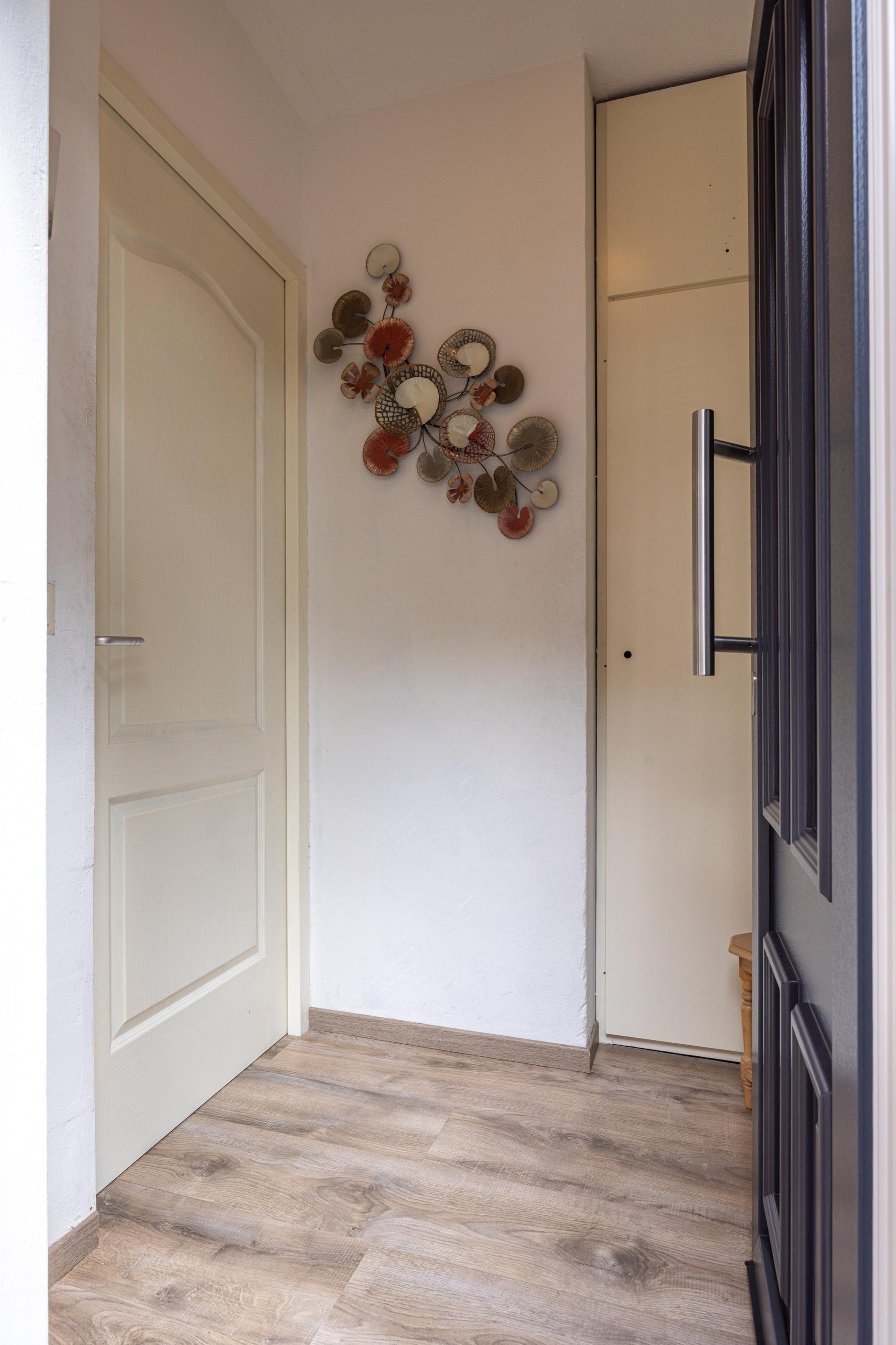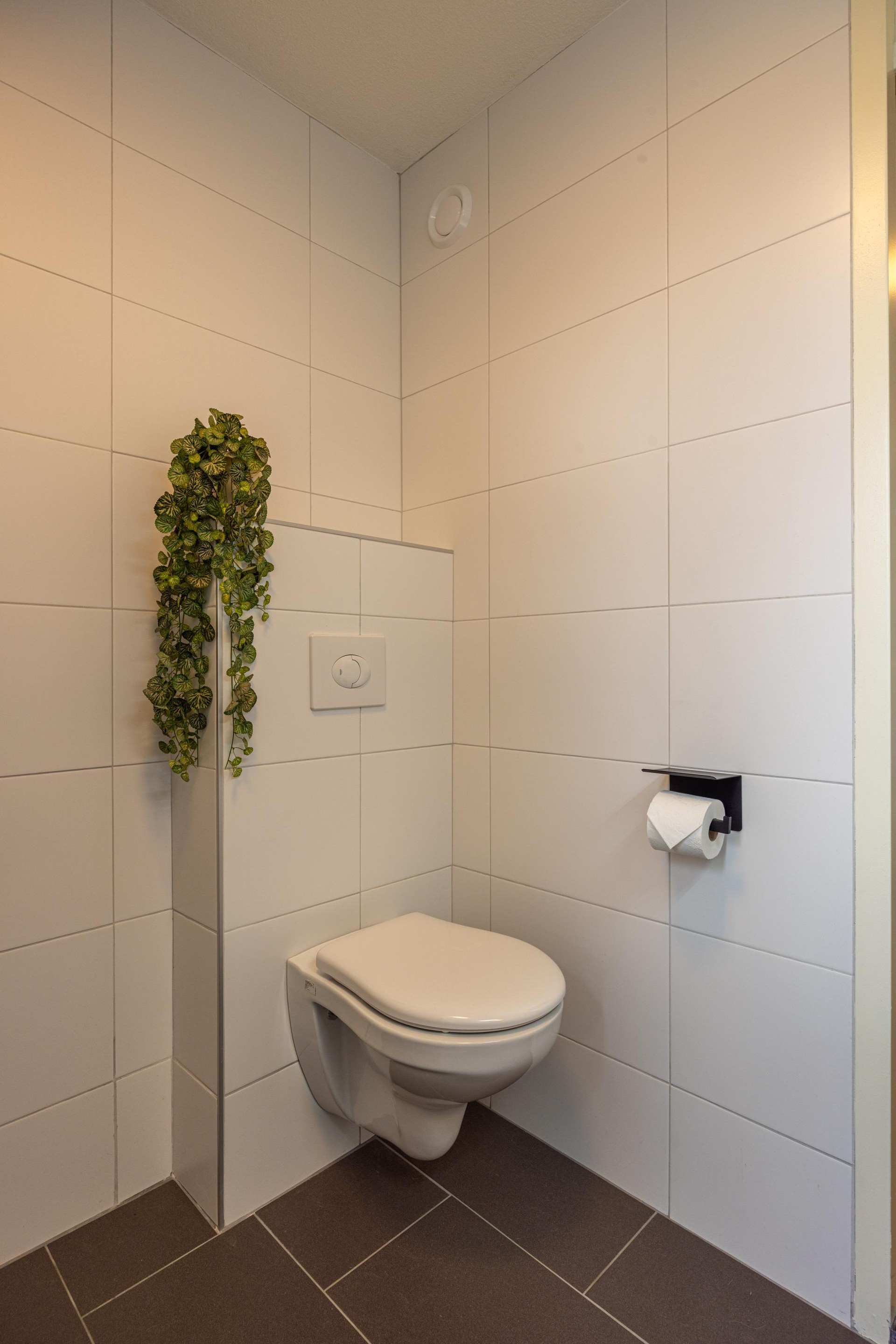 Begane grond Bij binnenkomst valt direct de onderhoudsvriendelijke voortuin op, gevolgd door een nette ontvangsthal met laminaatvloer, garderobe, meterkast en een toilet met fonteintje.