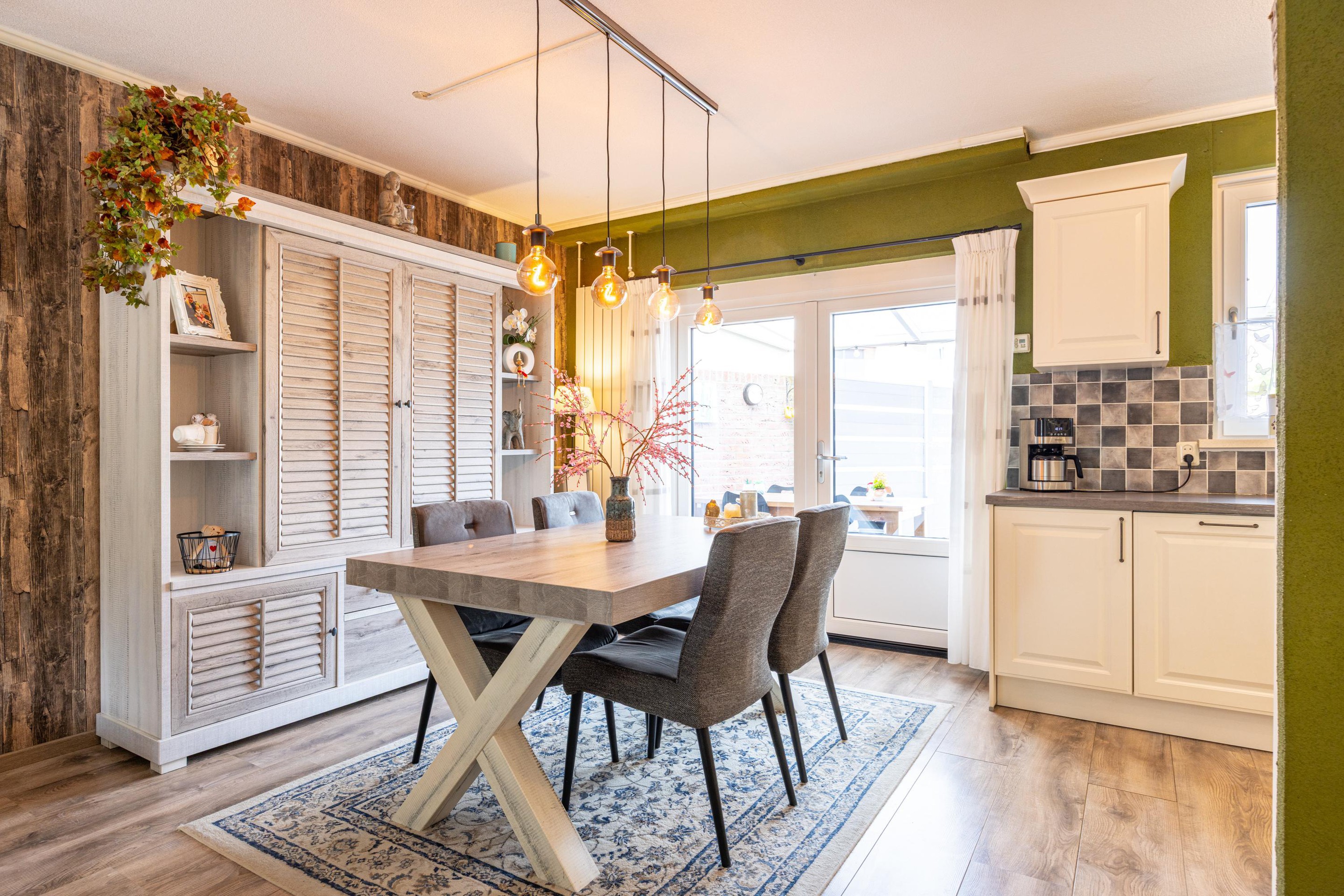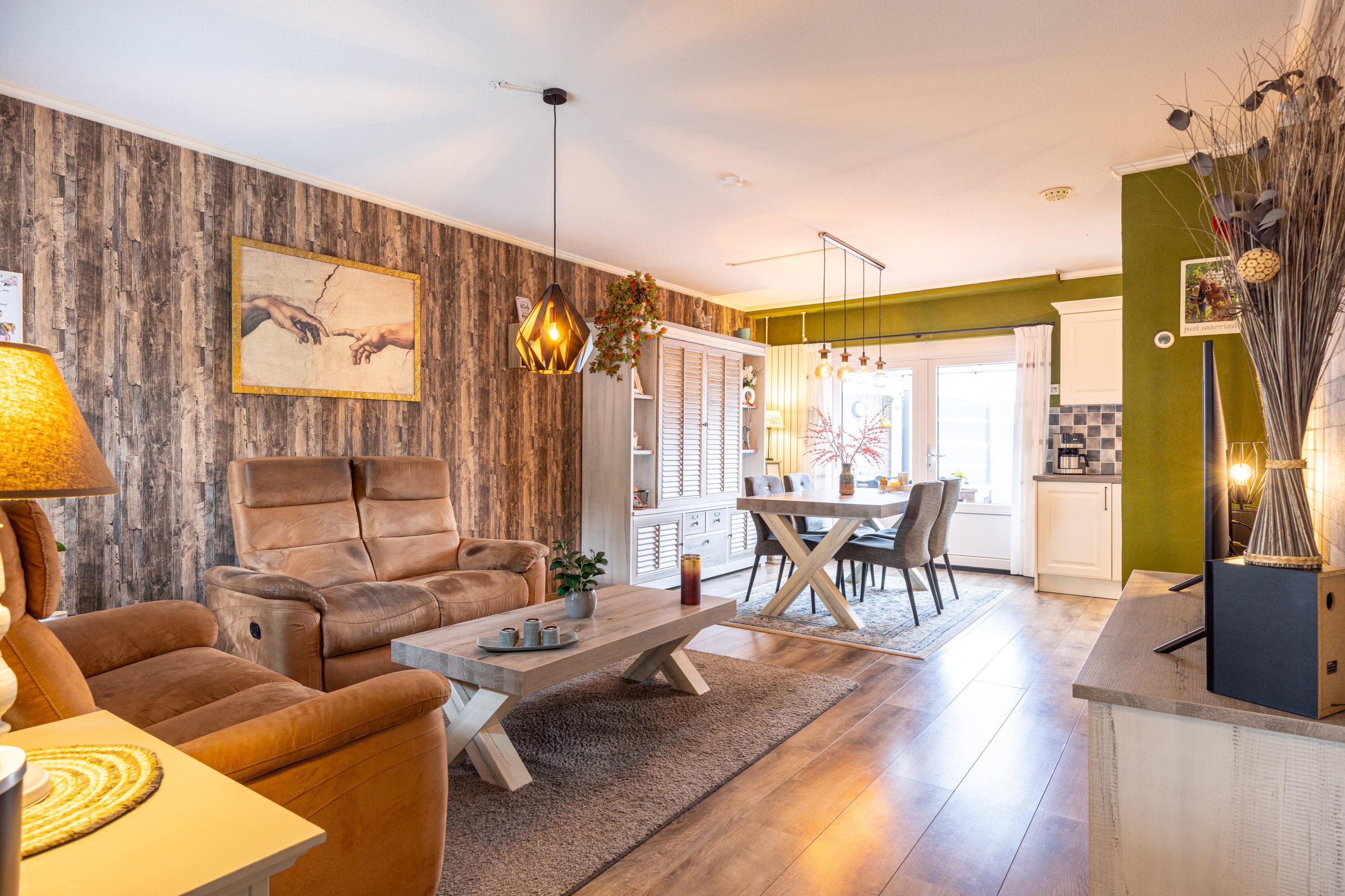 De doorzonwoonkamer is sfeervol afgewerkt, voorzien van een laminaatvloer en geniet van veel daglichtinval. Via de openslaande deuren bereikt u het overdekte terras in de achtertuin. De gesloten trapopgang naar de eerste verdieping zorgt voor extra rust in de woonkamer.