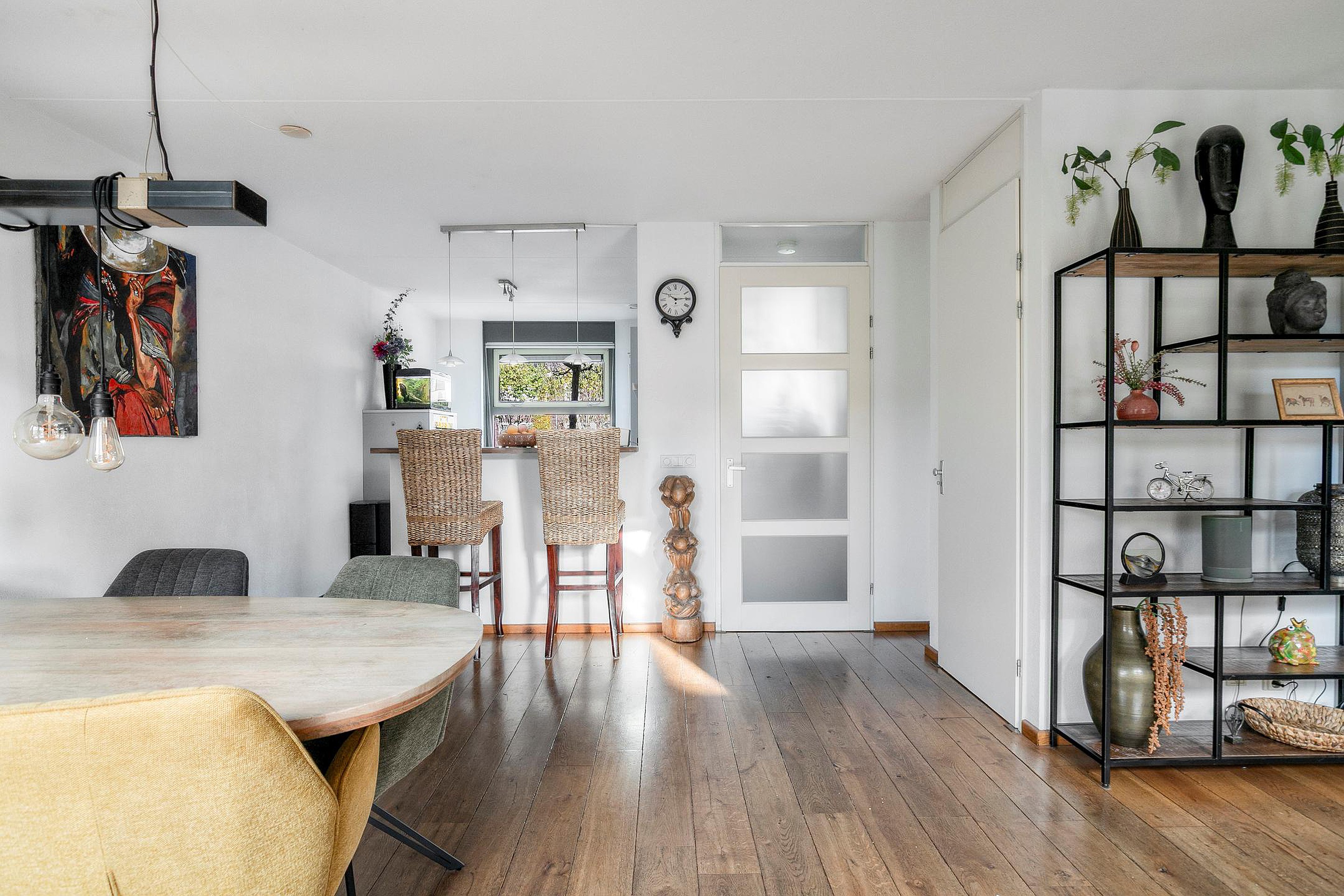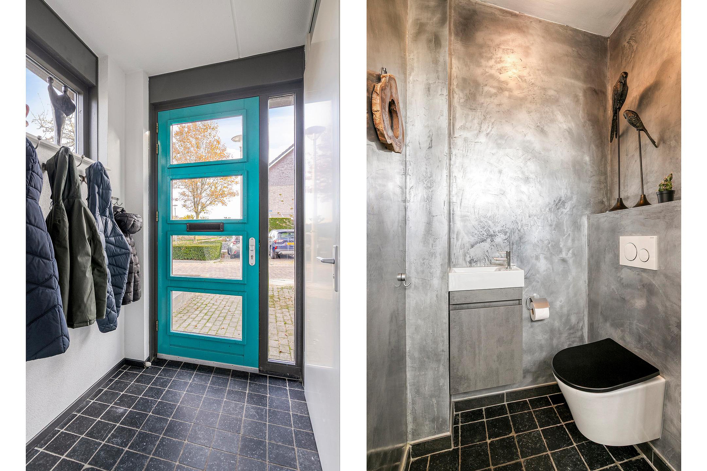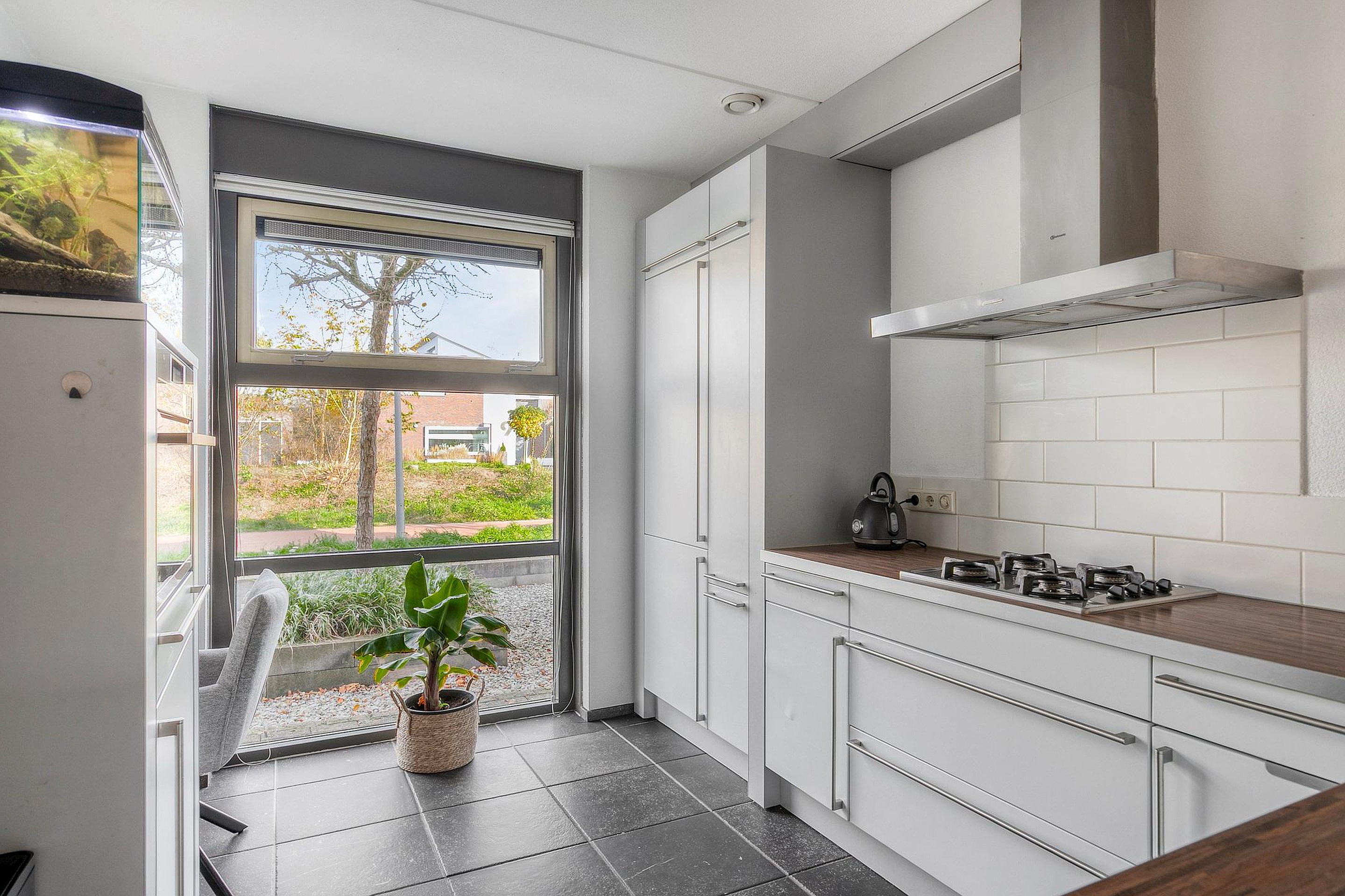 Begane grond De Elzenseloop 20 wordt betreden via de hal, waar zich zowel de garderobe, de meterkast, de trapopgang als de toiletruimte (met wandcloset en fonteintje) bevinden. De hal is afgewerkt met een antraciet tegelvloer (klein tegelformaat), gespacte wanden en een licht gespoten plafond. Vanuit de hal komt men in de woonkamer, die door de gerealiseerde zij-aanbouw een oppervlakte van zo’n 45m2 heeft -inclusief een handige provisiekast- en daarmee veel leefruimte biedt. De woonkamer is ingericht met een op de achtertuin georiënteerde (en daarmee middels dubbele tuindeuren direct mee in verbinding staande) eethoek en een comfortabele zithoek, die zich in de in 2010 gerealiseerde zij-aanbouw bevindt. De eethoek is afgewerkt met fraaie houten vloerdelen, licht gespacte wanden en een licht gespoten plafond, terwijl de zithoek is voorzien van een tegelvloer inclusief vloerverwarming, gespacte wanden en een stucwerk plafond. De vele raampartijen in de woonkamer zorgen er voor veel lichtinval, hetgeen deze verblijfsruimte extra aangenaam en gezellig maakt. De half open keuken is van de eethoek van de woonkamer gescheiden middels een speels bar-idee. De aanwezige raampartij (doorlopend tot op de grond) geeft er een mooi uitzicht op de levendige fietsstraat. Naast de nodige kast- en laderuimte is de keuken ingericht met diverse keukenapparatuur zoals een koelkast, vriezer, vaatwasser, gaskookplaat, afzuigkap en combi-oven. Verder is de keuken afgewerkt met een tegelvloer (groot tegelformaat), deels betegelde/deels gespacte wanden en een gespoten plafond. Aansluitend aan de zithoek bevindt zich de zowel praktische als zeer handige bijkeuken/droogloop, waar onder andere het witgoed in een grote schuifkast en een handige uitstort opgesteld staan. Ook in de bijkeuken ligt een tegelvloer inclusief vloerverwarming en via een loopdeur is vanuit de bijkeuken de heerlijke achtertuin bereikbaar.