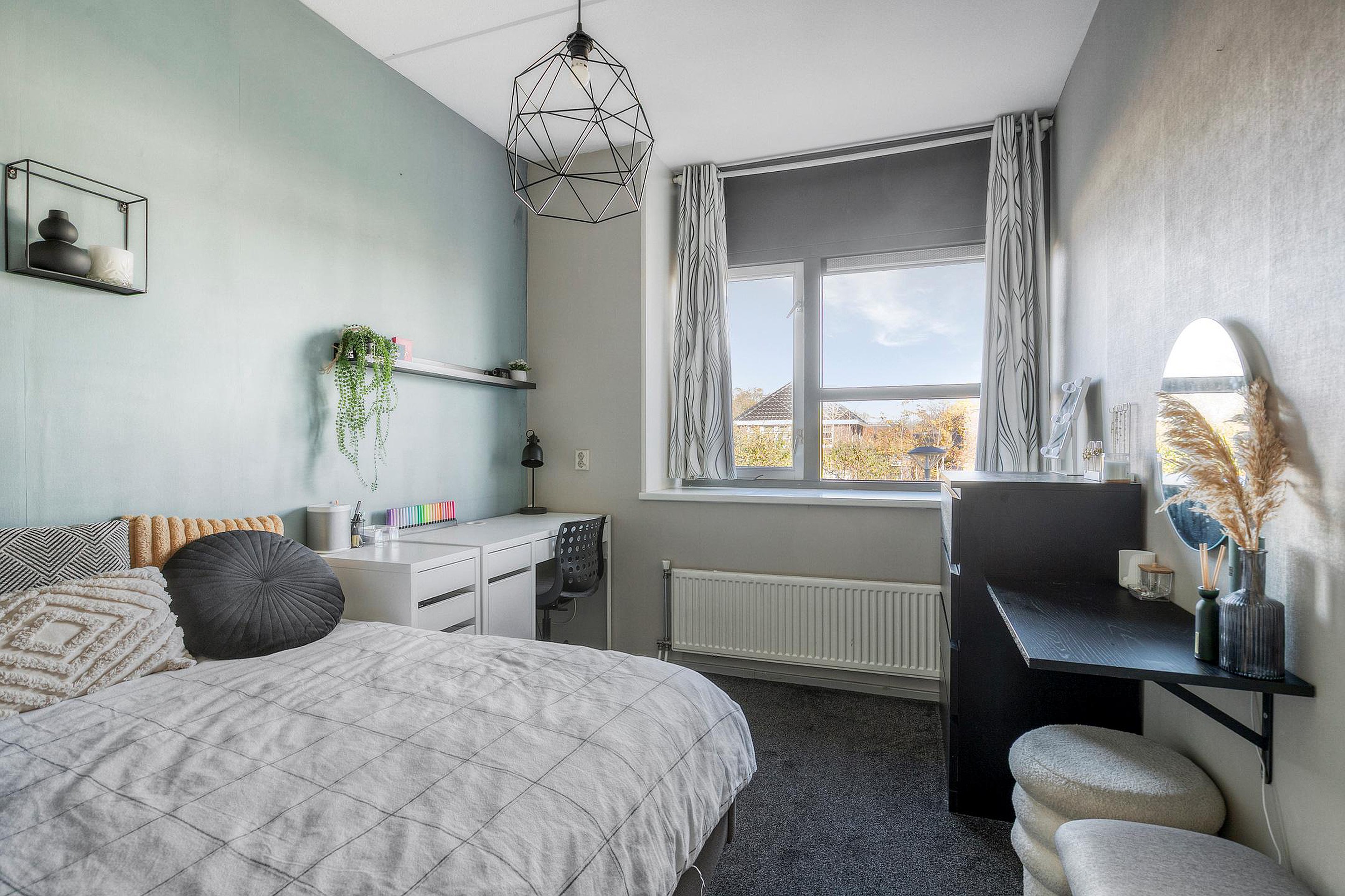 Tweede verdieping Vanaf de voorzolder van de 2e verdieping kunnen slaapkamers vier en vijf betreden worden. Daarnaast is vanuit de voorzolder middels een vlizotrap ook nog een zeer handige bergvliering/kleine 3e verdieping bereikbaar; ideaal voor het opslaan van bijvoorbeeld de reiskoffers en/of kerstspullen. Slaapkamer vier heeft een oppervlakte van circa 12,5m2 exclusief de bergruimte(n) achter de knieschotten en de cv-ruimte die vanuit deze slaapkamer toegankelijk is en waar de cv-combiketel (Nefit Trendline, 2015) en de zonneboiler (Agpo, 2004) opgesteld staan. (Slaap)kamer vijf is ingericht als werk- en gamekamer en beslaat ook zo’n 12,5m2, inclusief twee vaste kasten (waarvan één met de opstelplaats van de mv-unit).