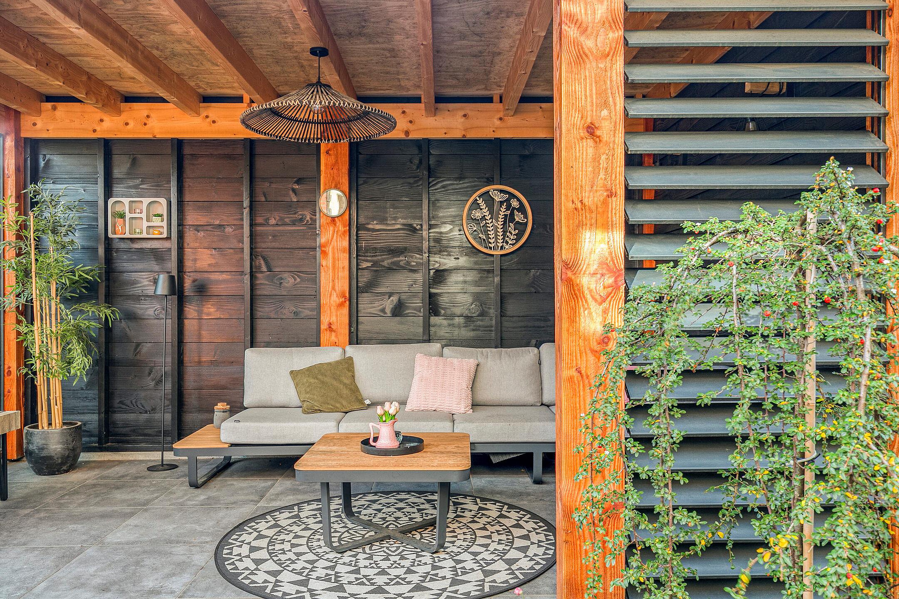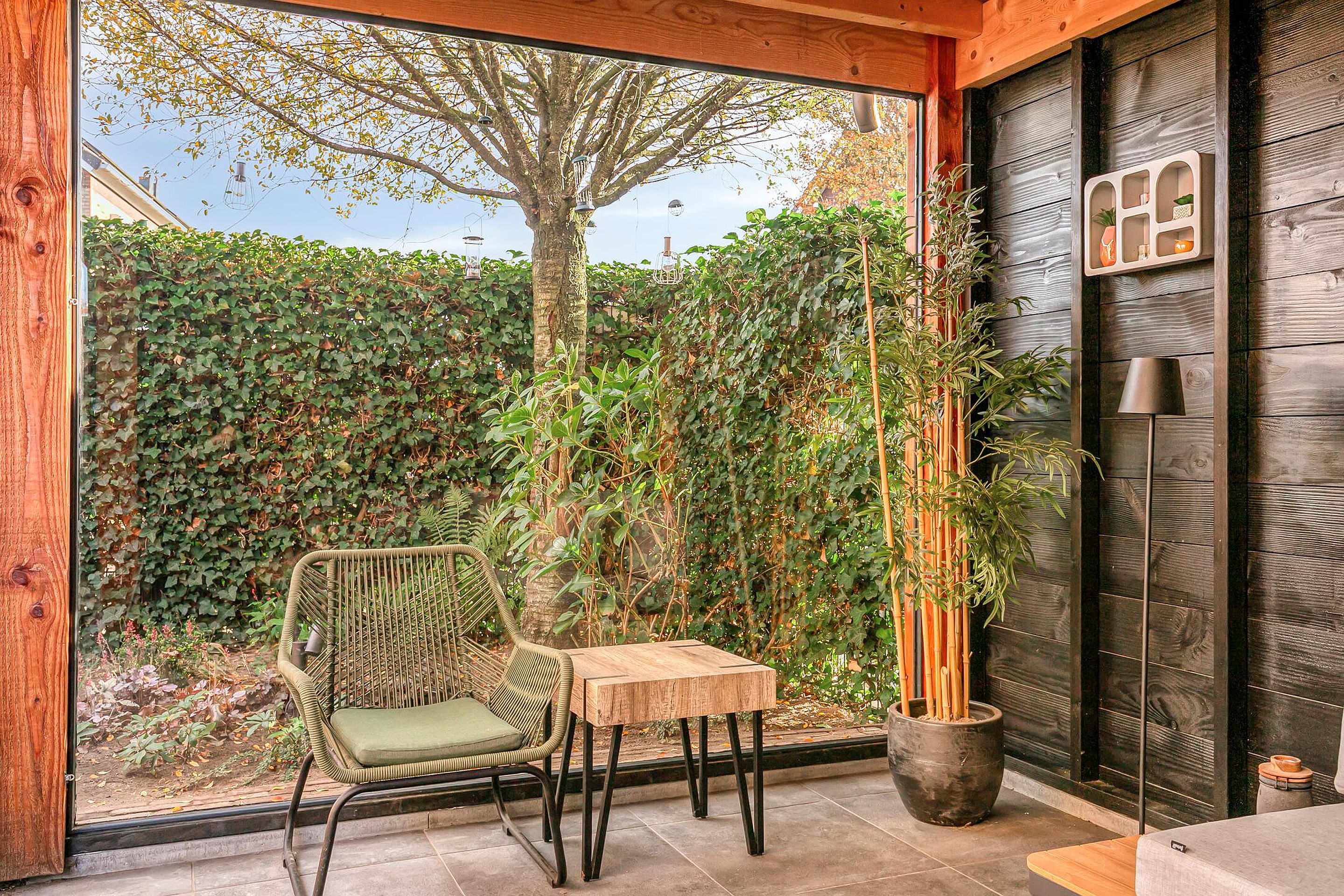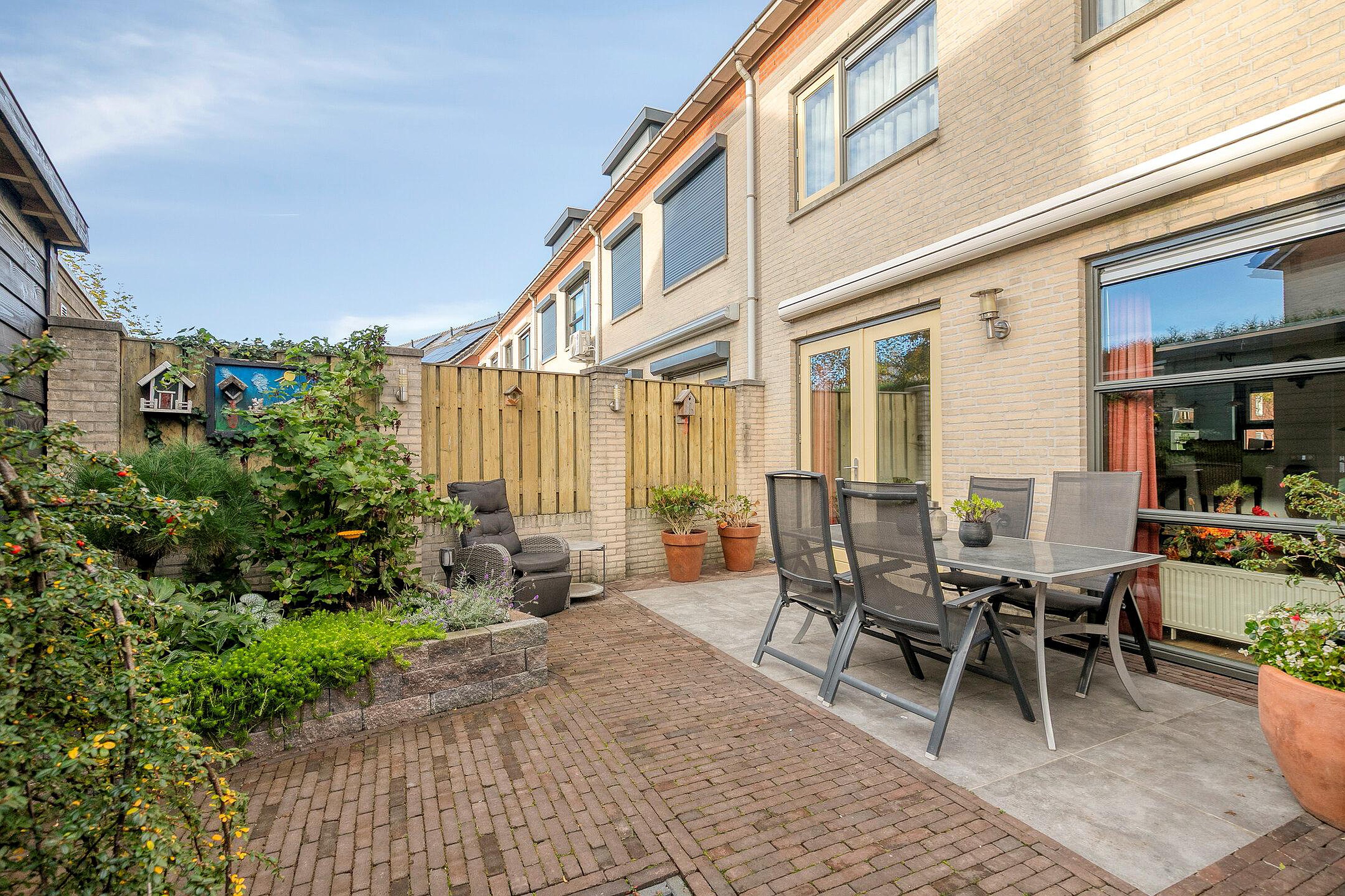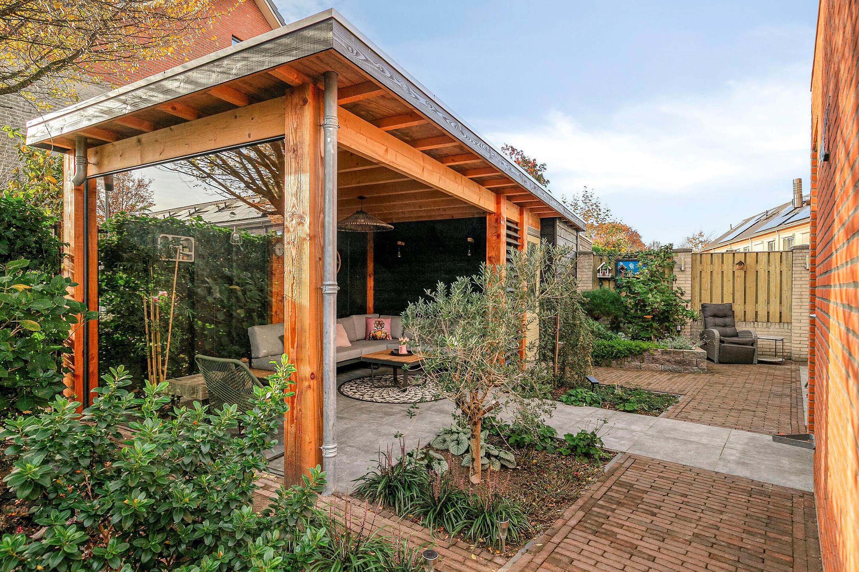 Tuin De onderhoudsvriendelijke achtertuin is in het voorjaar van 2024 compleet vernieuwd en heeft in totaal een oppervlakte van zo’n 80m2. Naast de fraaie sierklinkers en dito 60 x 60 terrastegels is de tuin afgewerkt met diverse borders met daarin een keur aan planten, struiken en boompjes. Ook een handig buitenkraantje en zelfs een schommel ontbreken niet! In 2024 zijn ook de fijne tuinberging van circa 10m2 en de sfeervolle overkapping van 14m2 -met robuuste verticale houten Douglas palen, vurenhouten balklaag, shutters en grote raampartij- gerealiseerd. In combinatie met de ligging op het zonnige zuiden biedt de achtertuin dus altijd wel een plekje om lekker in de zon of schaduw te zitten. De geheel omsloten en daarmee extra privacy-biedende achtertuin is zowel bereikbaar vanuit de woonkamer, de bijkeuken als een handige achterom.