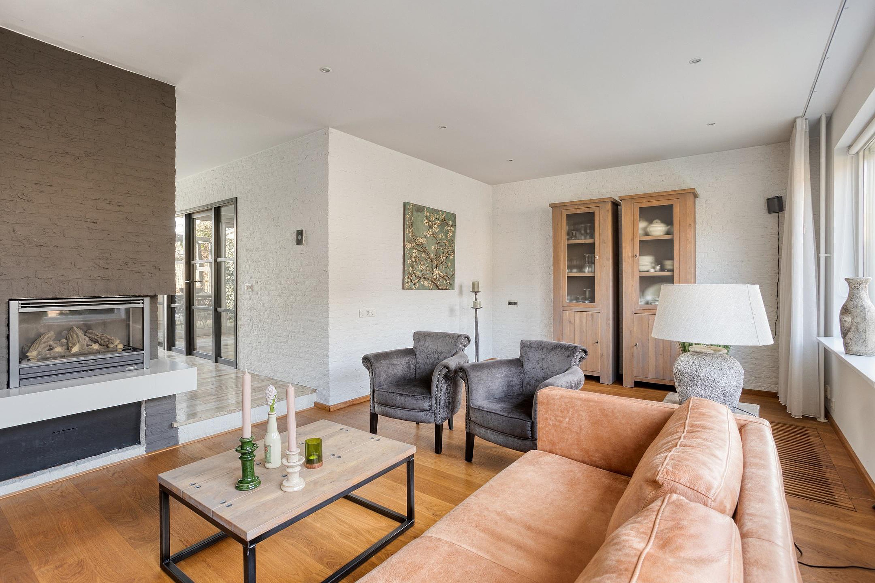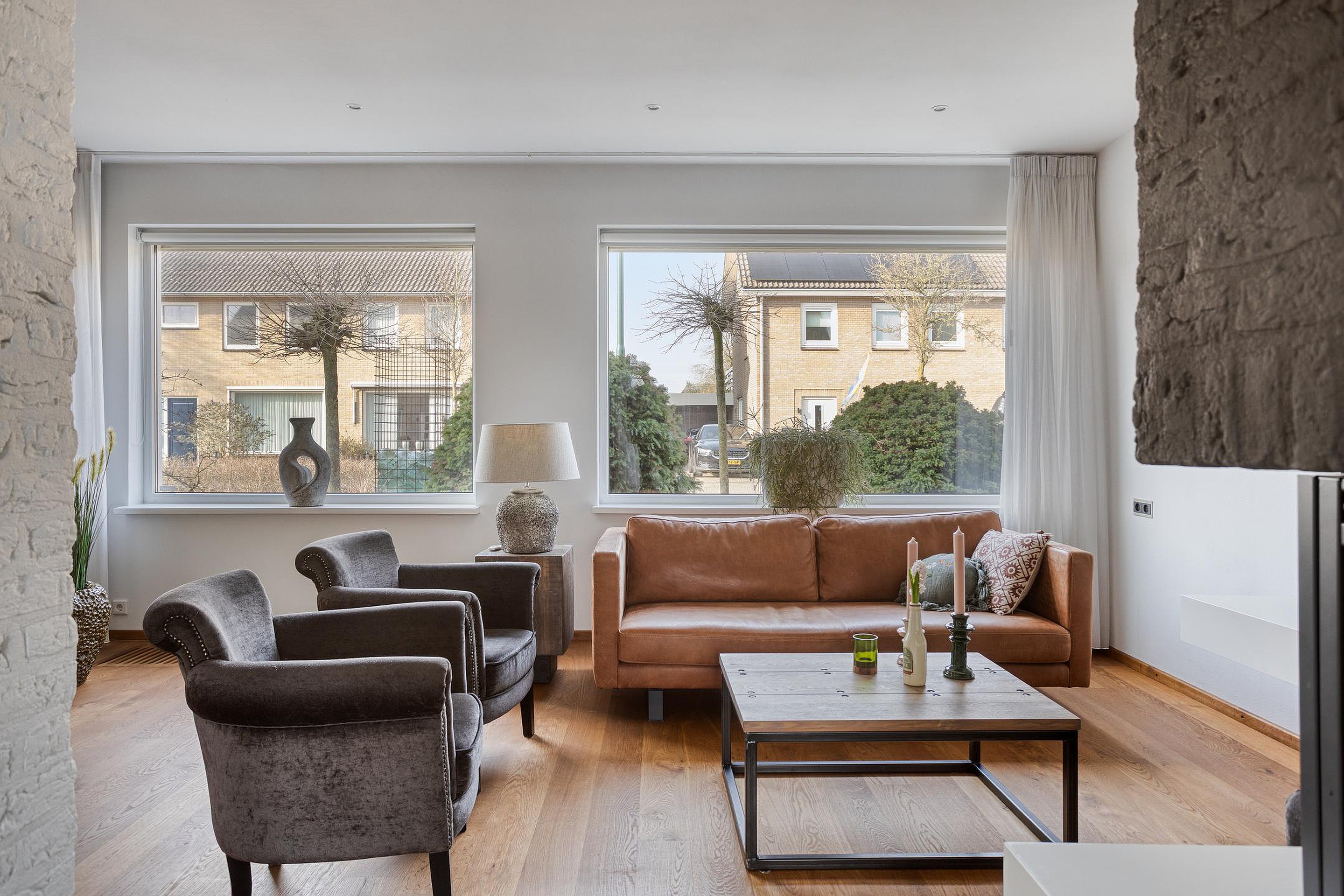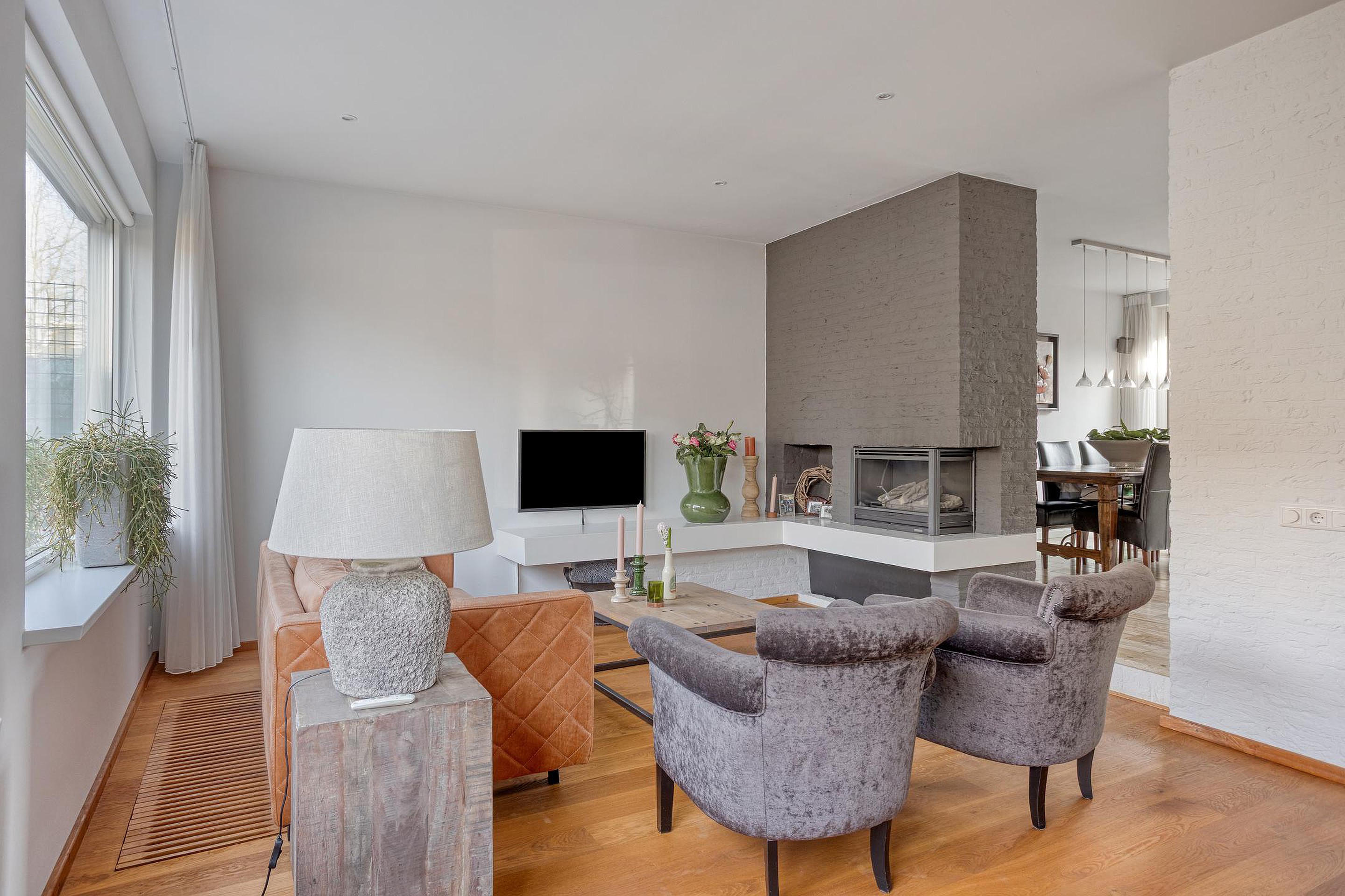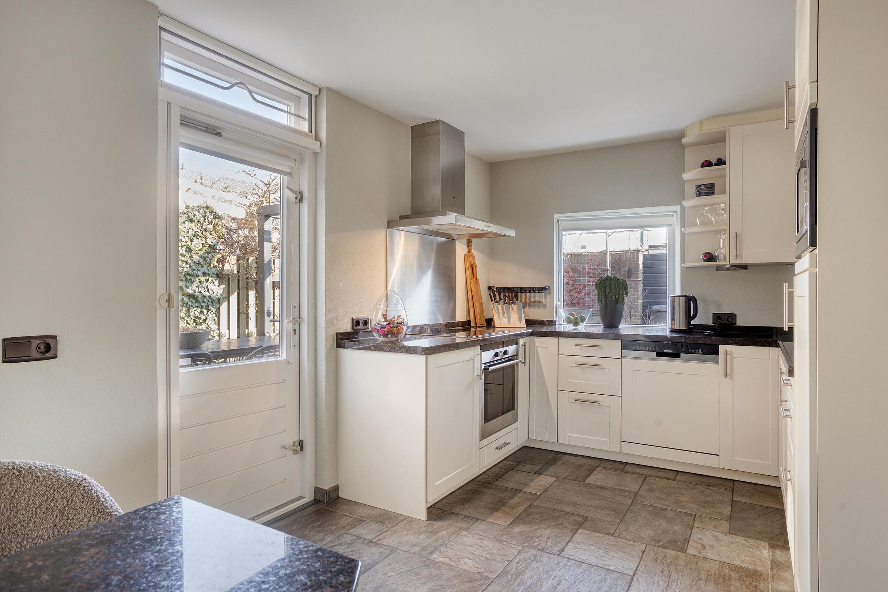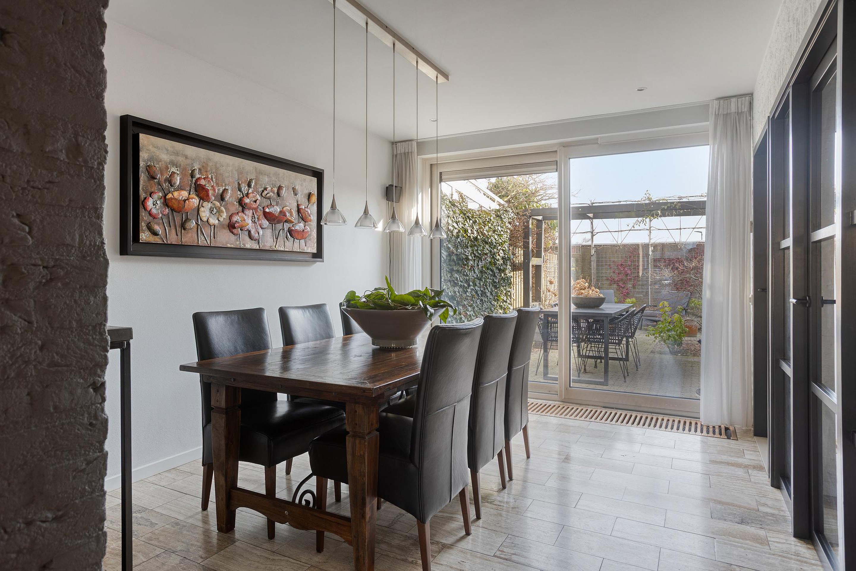 Begane grond De woning wordt (overdekt) betreden via de hal, waar zich de open trapopgang, de garderobe en de geheel betegelde toiletruimte (ingericht met een wandcloset en fonteintje) bevinden. De hal is ruim van opzet en afgewerkt met een fraaie travertin tegelvloer, licht geverfde schoonmetselwerk wanden en een stucwerk plafond. Vanuit de hal is het eetkamergedeelte van de woonkamer bereikbaar, die evenals de hal is afgewerkt met een travertin tegelvloer, gespacte/geverfde schoonmetselwerk wanden en stucwerk plafond (inclusief inbouwspots). Middels een schuifpui staat de eetkamer in directe verbinding met het zonneterras van de achtertuin, hetgeen voor een extra fijne tuinbeleving zorgt. Aan de voor-/straatzijde is de woonkamer ingericht met een verlaagde, comfortabele zithoek. De grote raampartijen zorgen er in combinatie met de warme houten vloer, de licht afgewerkte wanden, het stucwerk plafond (eveneens met inbouwspots) en de op maat gemaakte gashaard voor een sfeervolle, zeer aangename verblijfsruimte. De gesloten keuken is zowel vanuit de hal als het eetkamergedeelte bereikbaar. Naast een keurige tegelvloer, gespoten/gestucte wanden en stucwerk plafond is de keuken ingericht met een U-vormig keukenblok inclusief granieten werkblad en gewenste keukenapparatuur zoals een vaatwasser, keramische kookplaat, afzuigkap, koelkast, vriezer, combimagnetron en combioven. Een via de garage aangesloten boiler zorgt er snel voor warm water. Vanuit de keuken zijn zowel de achtertuin als garage bereikbaar. De verwarmde garage is afgewerkt met een antraciet tegelvloer en beschikt o.a. over een extra keukenblok (inclusief 2e koelkast), terwijl de vaste kasten extra bergruimte bieden. Ook bevindt zich in de garage de in 2026 gemoderniseerde meterkast. Via een loopdeur achterin de garage kan de achtertuin betreden worden.