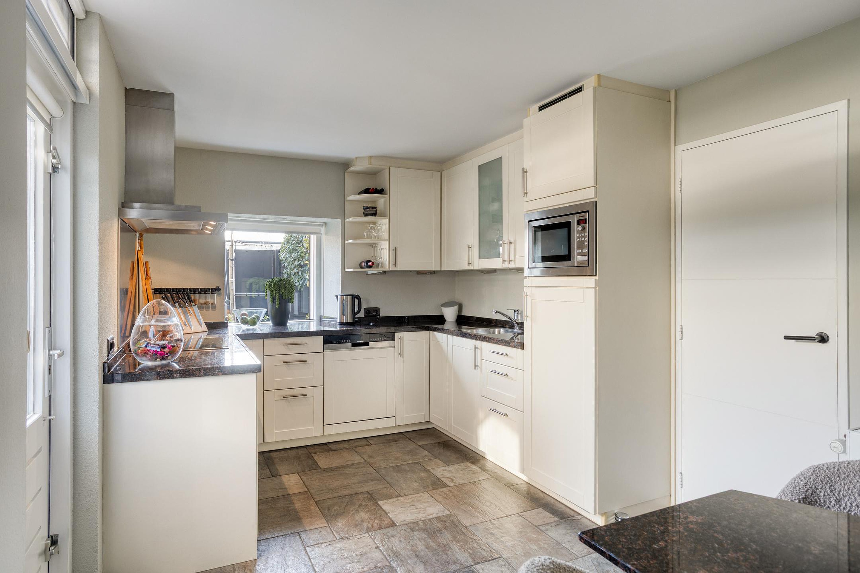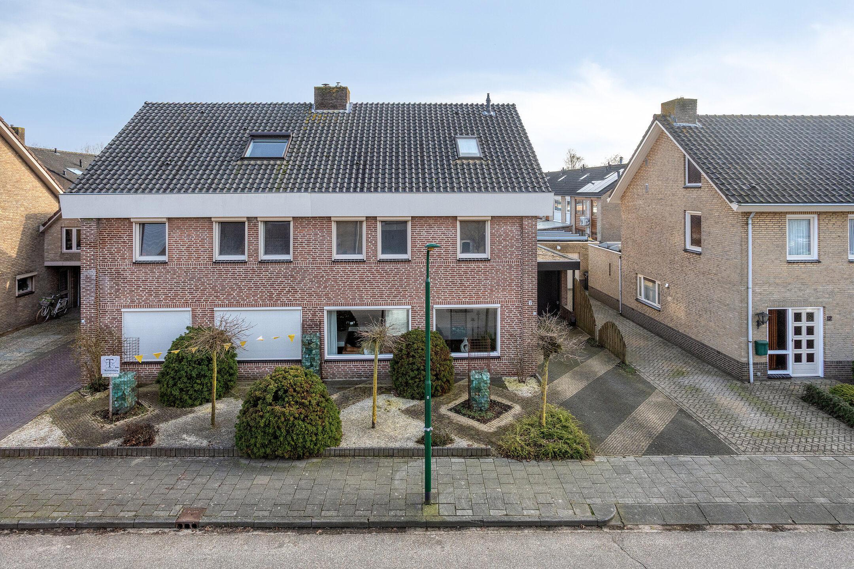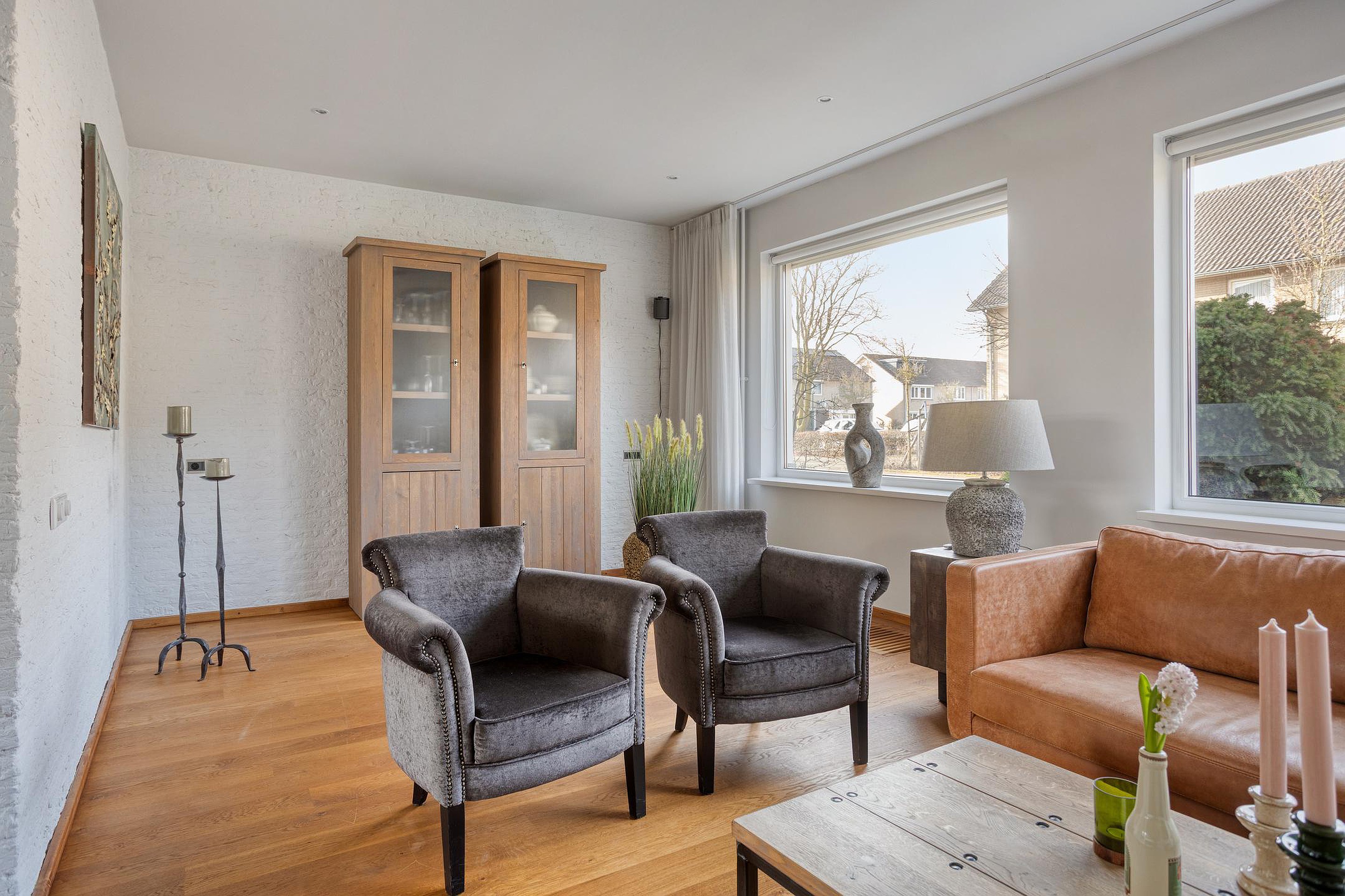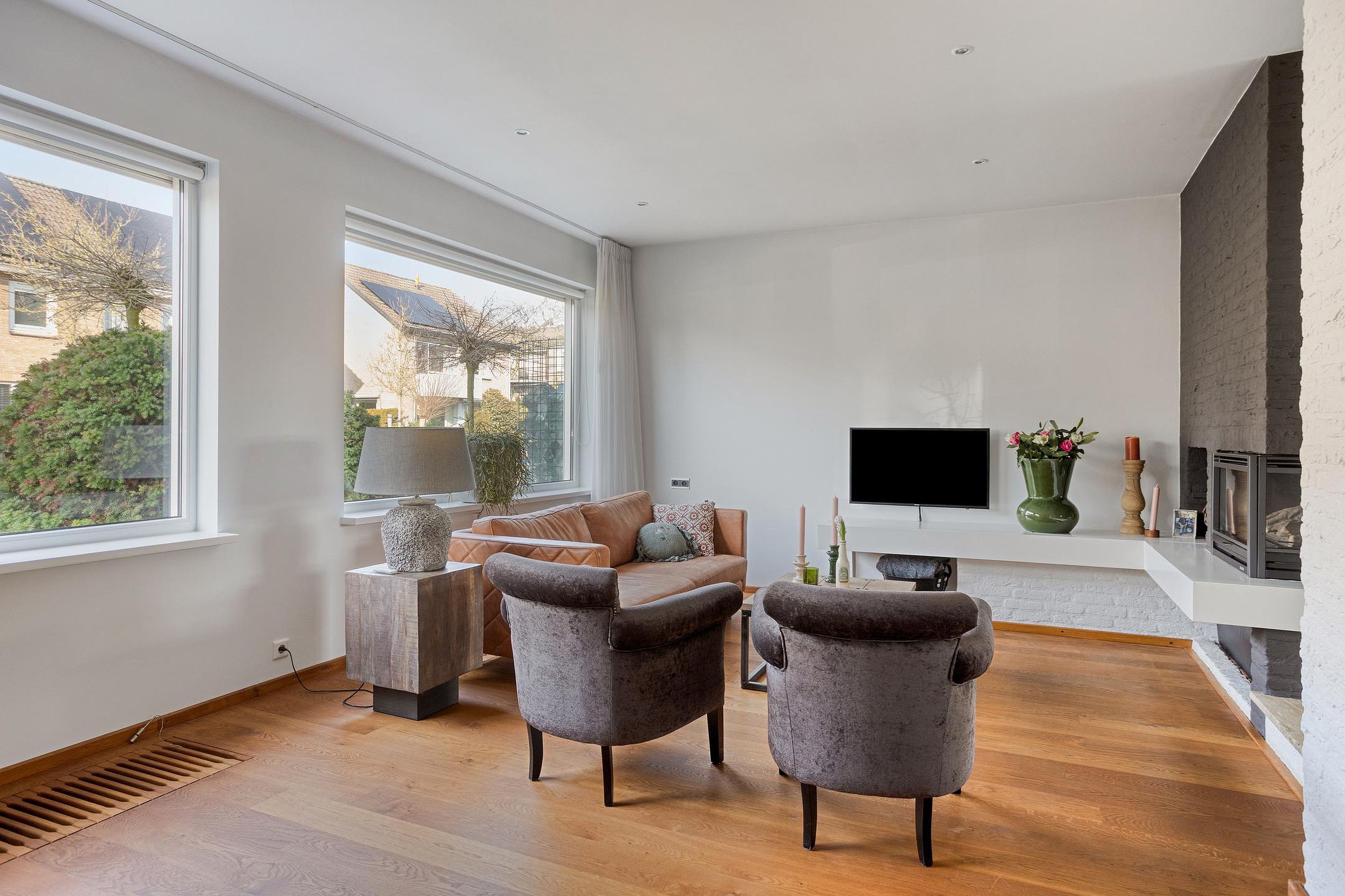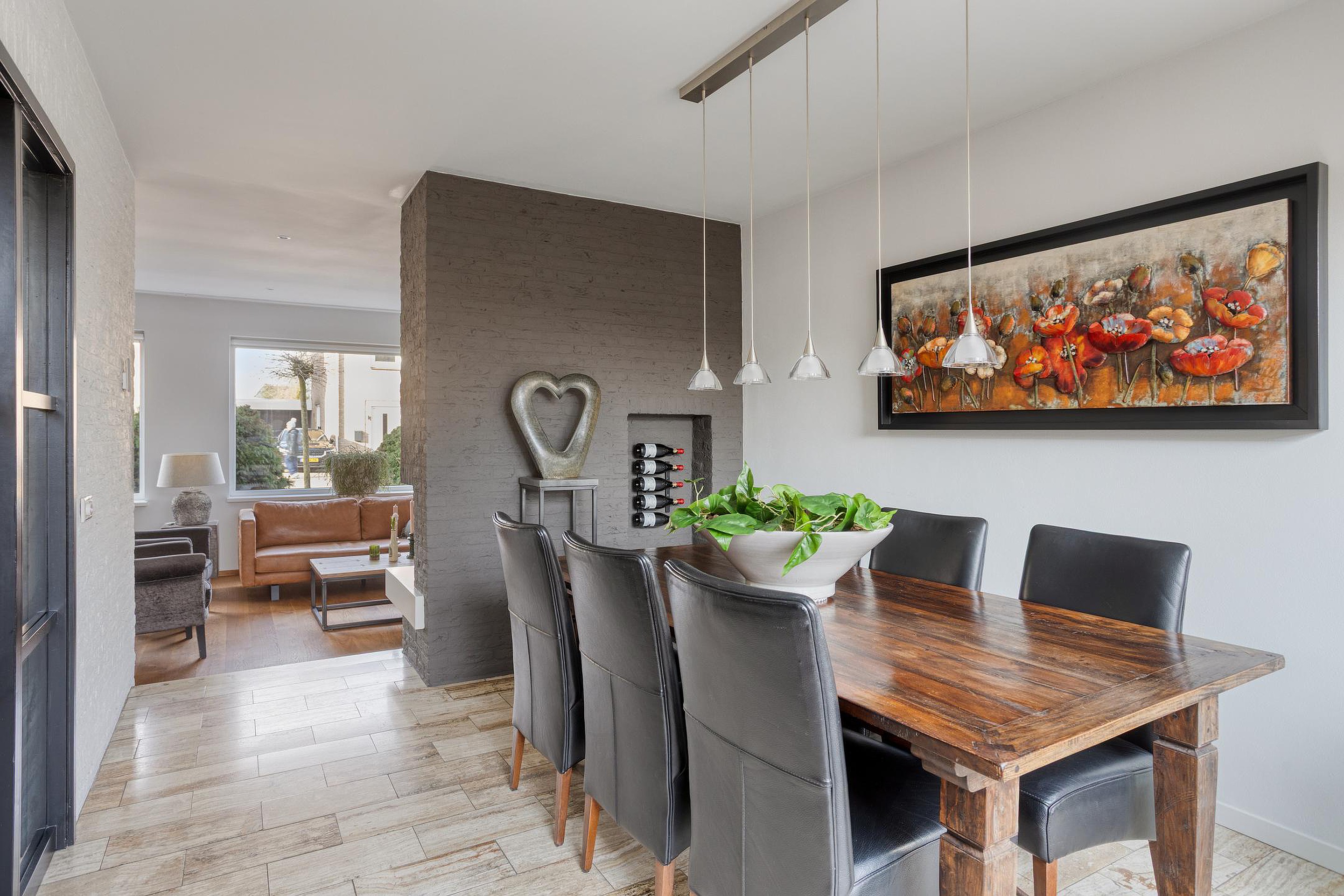 Begane grond De woning wordt (overdekt) betreden via de hal, waar zich de open trapopgang, de garderobe en de geheel betegelde toiletruimte (ingericht met een wandcloset en fonteintje) bevinden. De hal is ruim van opzet en afgewerkt met een fraaie travertin tegelvloer, licht geverfde schoonmetselwerk wanden en een stucwerk plafond. Vanuit de hal is het eetkamergedeelte van de woonkamer bereikbaar, die evenals de hal is afgewerkt met een travertin tegelvloer, gespacte/geverfde schoonmetselwerk wanden en stucwerk plafond (inclusief inbouwspots). Middels een schuifpui staat de eetkamer in directe verbinding met het zonneterras van de achtertuin, hetgeen voor een extra fijne tuinbeleving zorgt. Aan de voor-/straatzijde is de woonkamer ingericht met een verlaagde, comfortabele zithoek. De grote raampartijen zorgen er in combinatie met de warme houten vloer, de licht afgewerkte wanden, het stucwerk plafond (eveneens met inbouwspots) en de op maat gemaakte gashaard voor een sfeervolle, zeer aangename verblijfsruimte. De gesloten keuken is zowel vanuit de hal als het eetkamergedeelte bereikbaar. Naast een keurige tegelvloer, gespoten/gestucte wanden en stucwerk plafond is de keuken ingericht met een U-vormig keukenblok inclusief granieten werkblad en gewenste keukenapparatuur zoals een vaatwasser, keramische kookplaat, afzuigkap, koelkast, vriezer, combimagnetron en combioven. Een via de garage aangesloten boiler zorgt er snel voor warm water. Vanuit de keuken zijn zowel de achtertuin als garage bereikbaar. De verwarmde garage is afgewerkt met een antraciet tegelvloer en beschikt o.a. over een extra keukenblok (inclusief 2e koelkast), terwijl de vaste kasten extra bergruimte bieden. Ook bevindt zich in de garage de in 2026 gemoderniseerde meterkast. Via een loopdeur achterin de garage kan de achtertuin betreden worden.