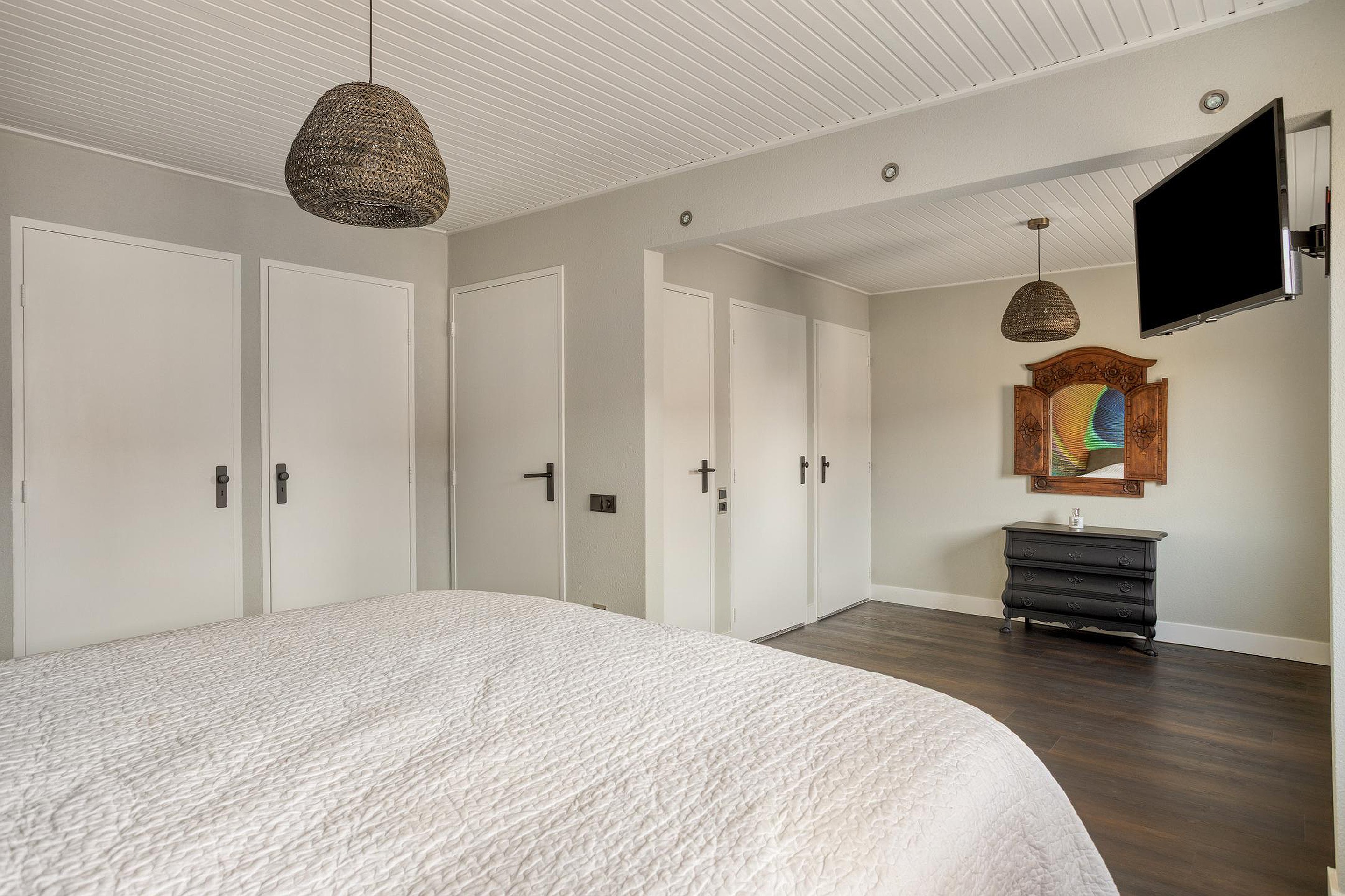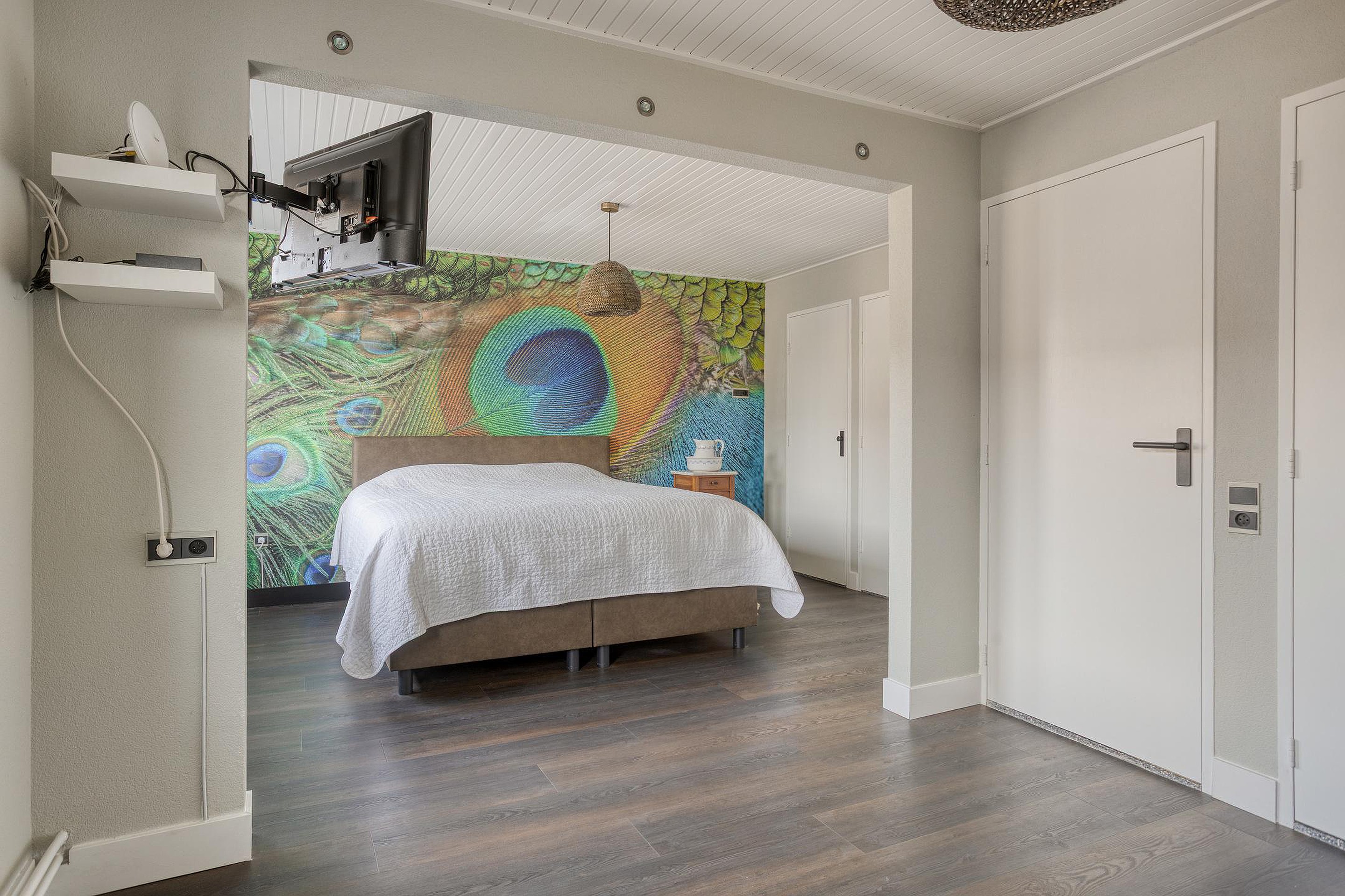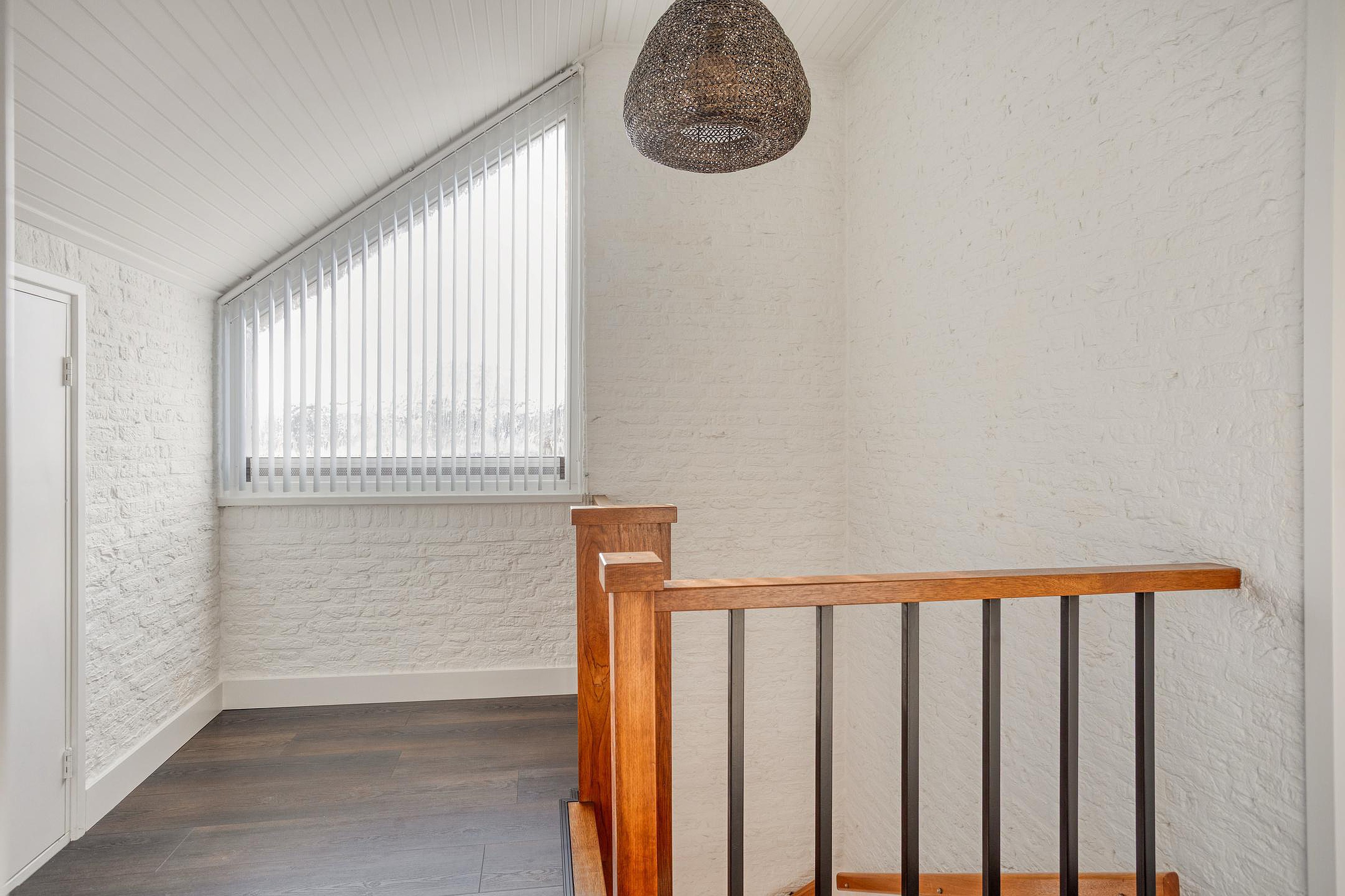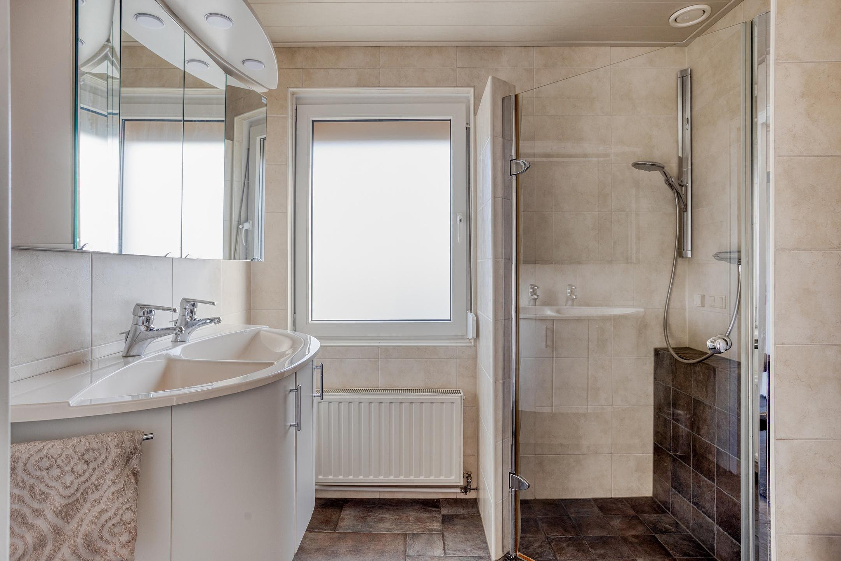 Op de eerste verdieping bevinden zich naast de overloop twee (zeer) ruime slaapkamers en de badkamer. De overloop is evenals de slaapkamers afgewerkt met een pvc-vloer (2023), hoge witte hardhouten plinten, lichte wanden (in dit geval schoonmetselwerk en op de slaapkamers stucwerk en behang) en een gewit schrootjesplafond. Ook een groot raamkozijn voor extra daglichttoetreding ontbreekt niet. De deuren naar de diverse vertrekken alsook de deuren van de vaste kasten zijn licht en strak afgewerkt en voorzien van nieuw, donker deurbeslag. De twee slaapkamers hebben een oppervlakte van respectievelijk 22m2 en 12m2 en zijn dus beide voorzien van praktische vaste kasten. Indien gewenst kan de grote slaapkamer van 22m2 eenvoudig opgesplitst worden in de twee oorspronkelijke slaapkamers van ca. 13m2 en 9m2. De keurige, geheel betegelde badkamer (inclusief aangename elektrische vloerverwarming) is ingericht met een wandcloset, drempelloze inloopdouche inclusief glazen deur en een dubbele wastafel met meubel. Het aanwezige raam zorgt ook hier voor fijne daglichttoetreding en zorgt daarnaast voor een extra ventilatiemogelijkheid.