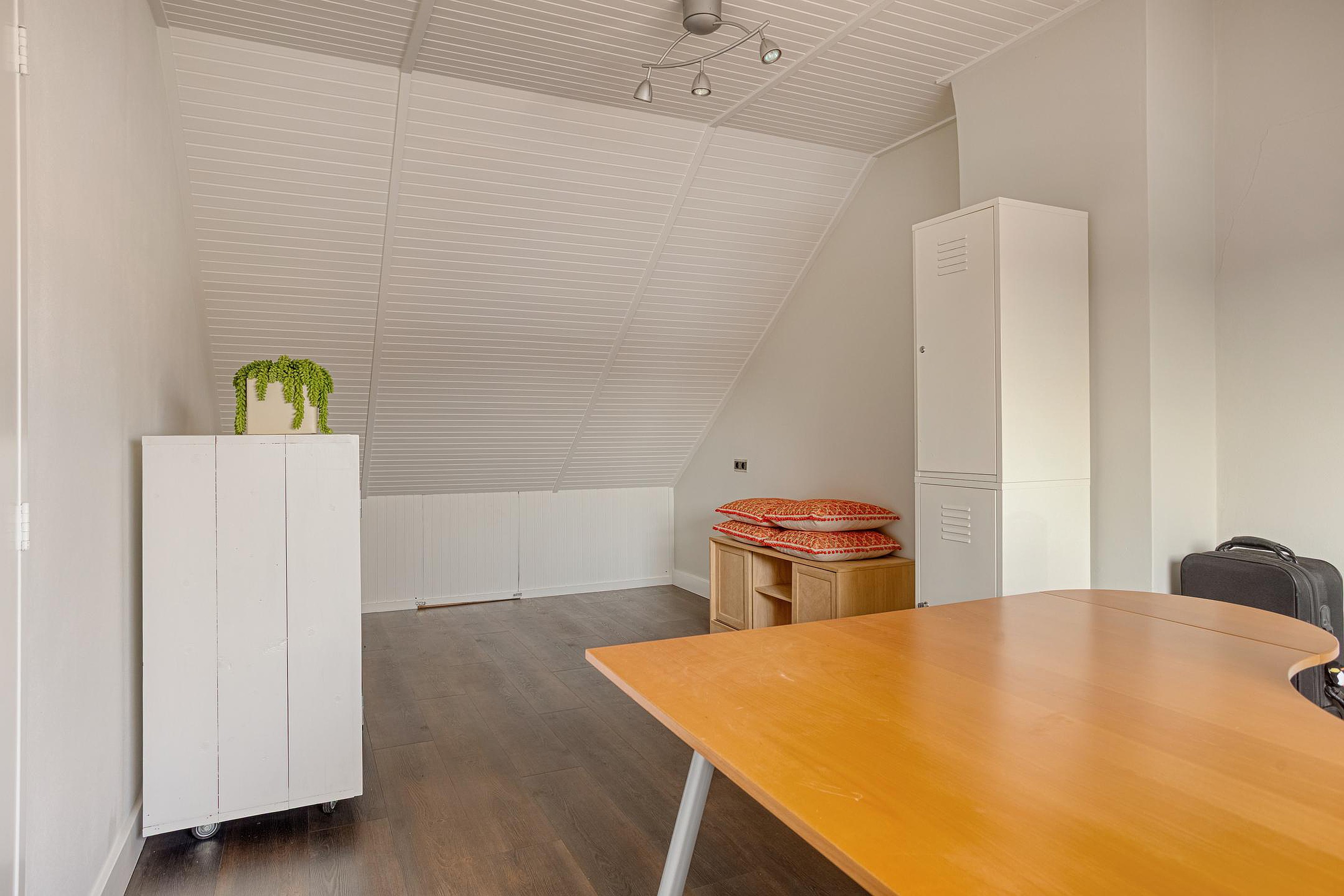 Tweede verdieping Via een vaste open trap komt men uit op de ruime voorzolder (en ook weer voorzien van een fijne raampartij), waar zich achter het knieschot alvast de nodige extra bergruimte bevindt. De voorzolder is afgewerkt met een pvc-vloer (2023) inclusief hoge hardhouten plinten, licht geverfde schoonmetselwerk wanden en een gewit schrotenplafond. De slaap-/werkkamer is met zo’n 15m2 (exclusief de bergruimte achter de knieschotten) lekker ruim van opzet en op dezelfde keurige wijze afgewerkt als de voorzolder. De tweede kamer op deze verdieping (ca. 6m2) is ingericht als was-/strijkruimte. Ook staat hier de cv-combiketel (Nefit Trendline, 2023) opgesteld.