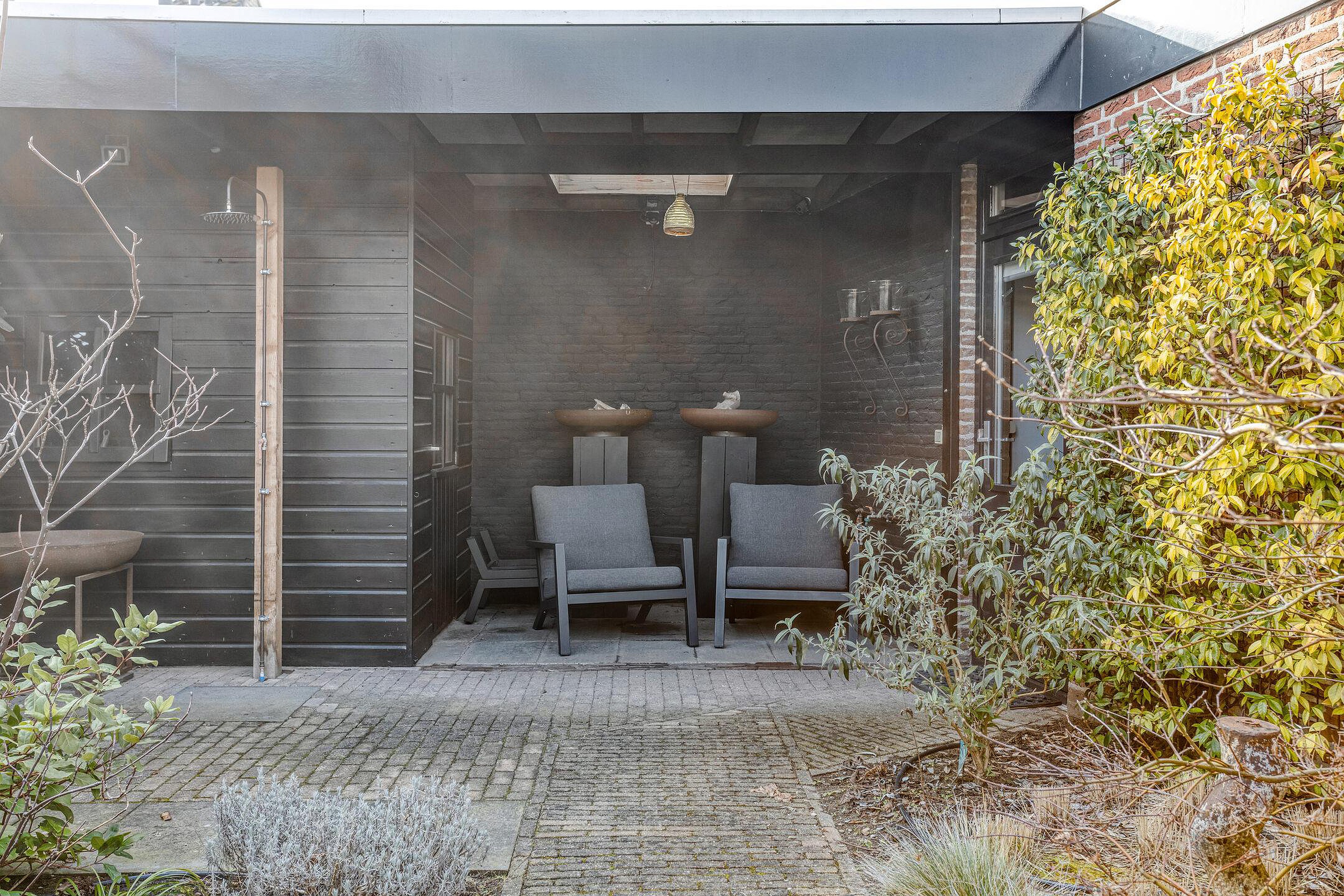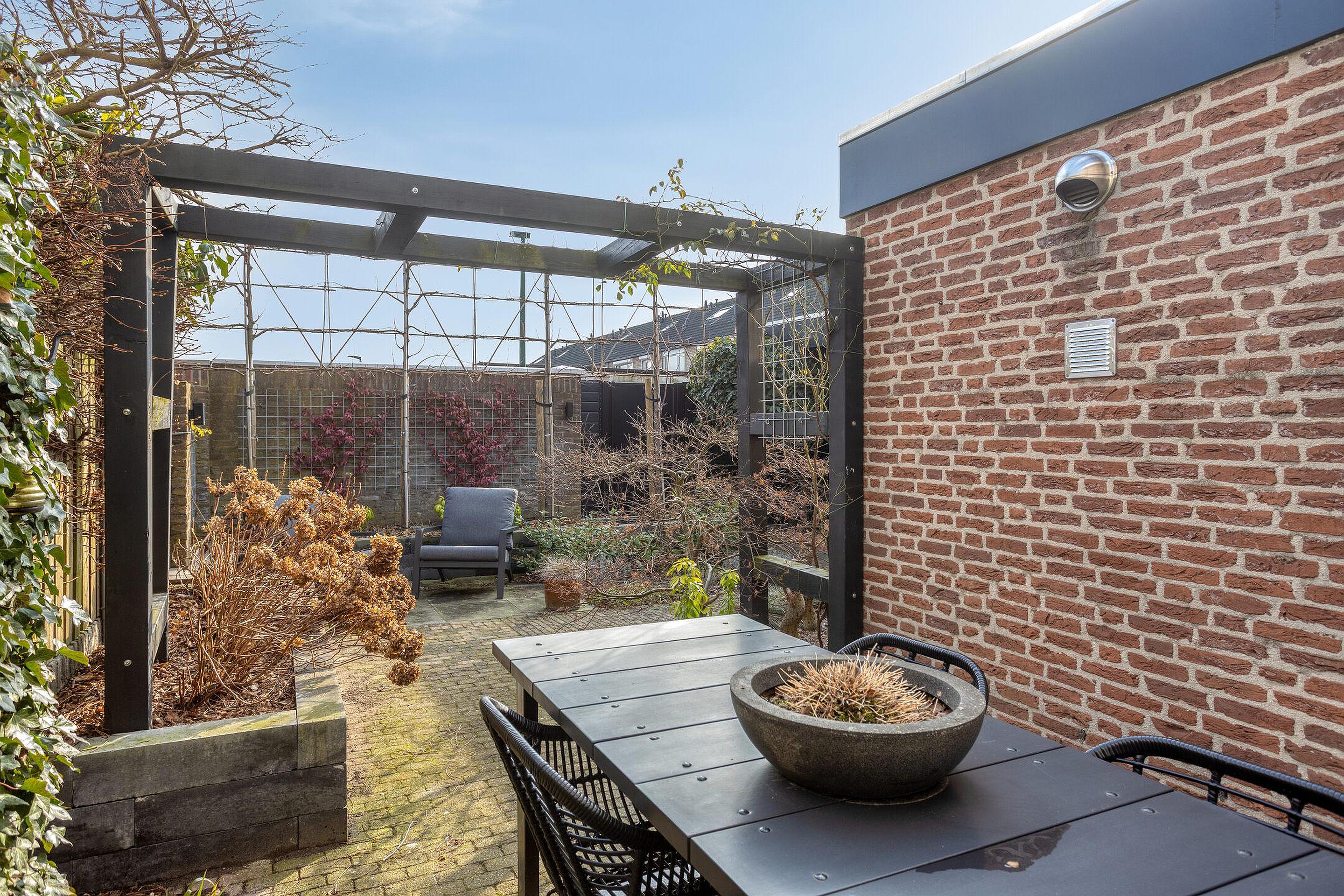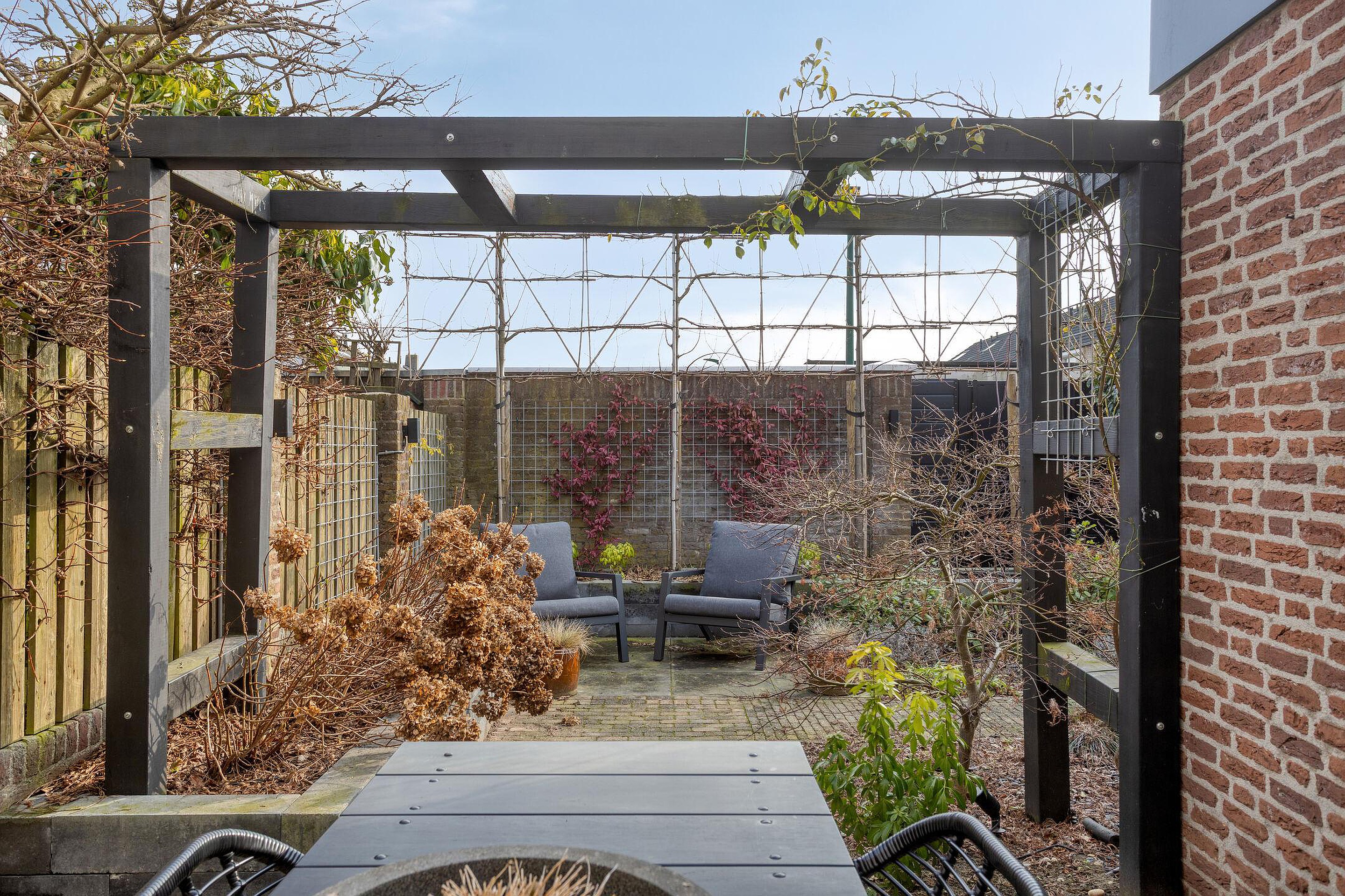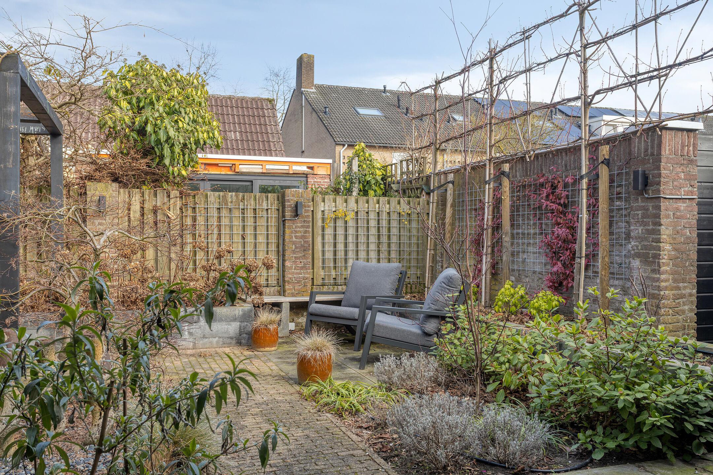 Tuin De in 2023 aangelegde achtertuin is gelegen op het zonnige zuidoosten en biedt dankzij deze gunstige ligging zowel zon- als schaduwplekken. De tuin is onderhoudsvriendelijk aangelegd met onder andere een praktische tuinberging (ca. 6m2 en in 2021 aan de buitenzijde nog geschilderd), een overkapping (ca. 12m2) met lichtkoepel, een zonneterras met zonneluifel en diverse borders met een keur aan bloemen, planten en bomen (waaronder fraaie lei-linden). De looppoort en schutting aan de achterzijde van het perceel zijn in 2021 nog vernieuwd.