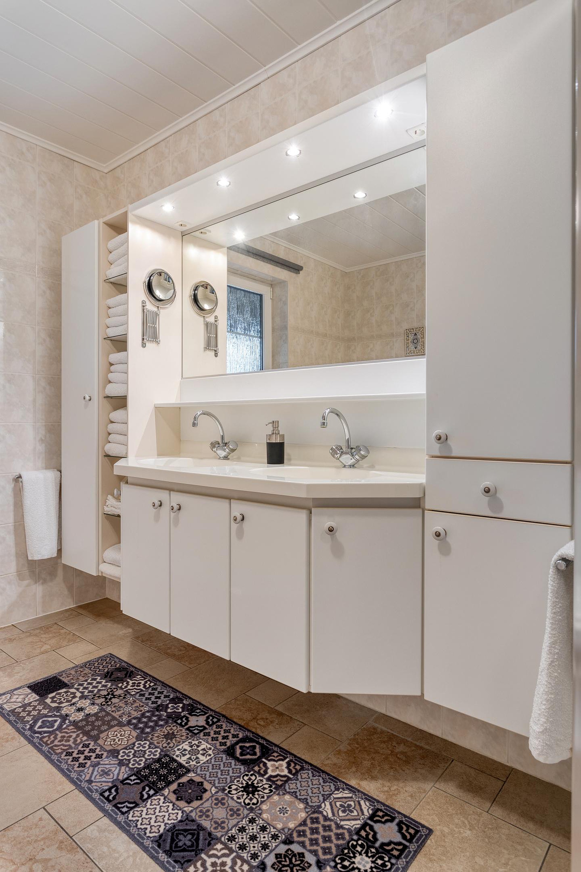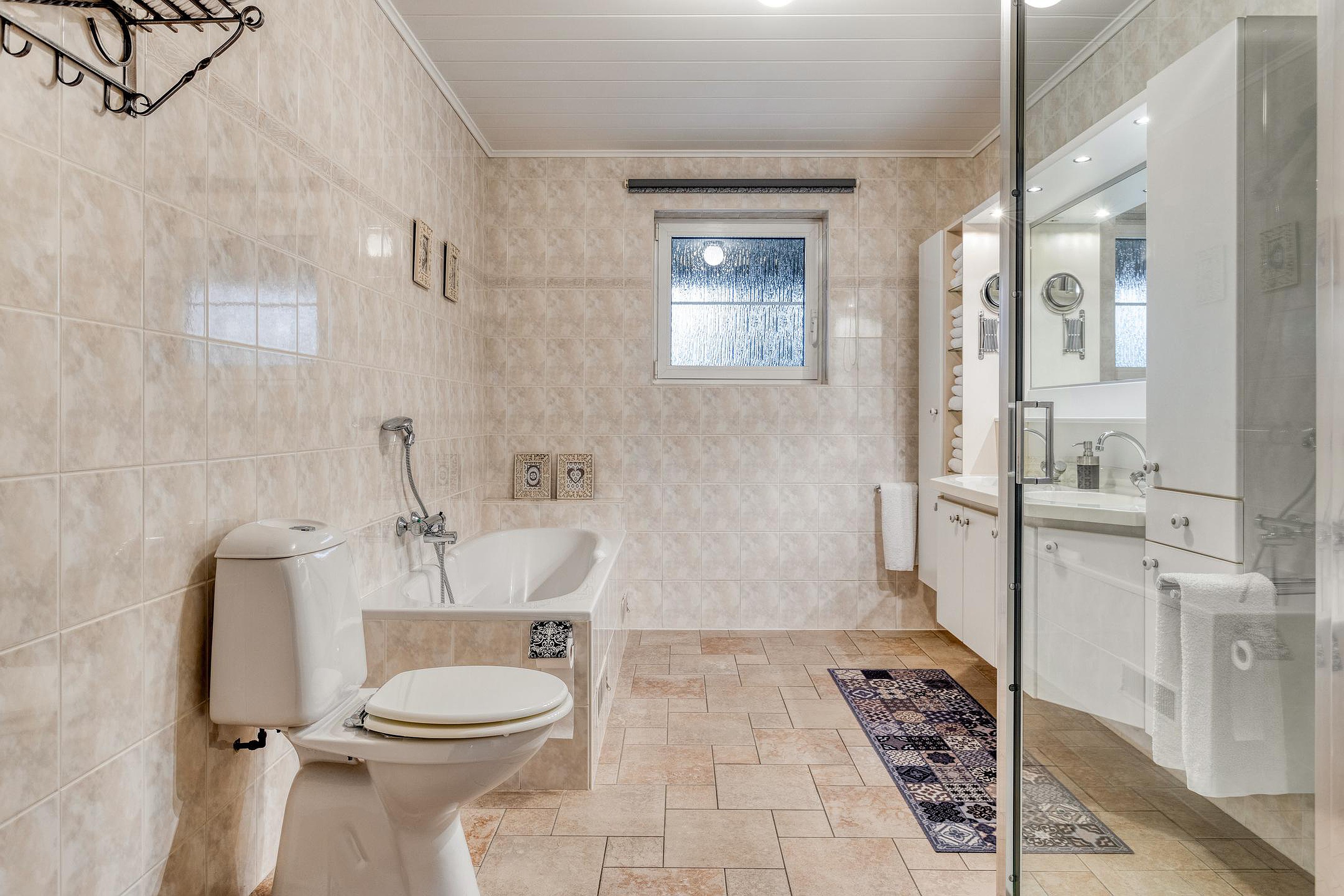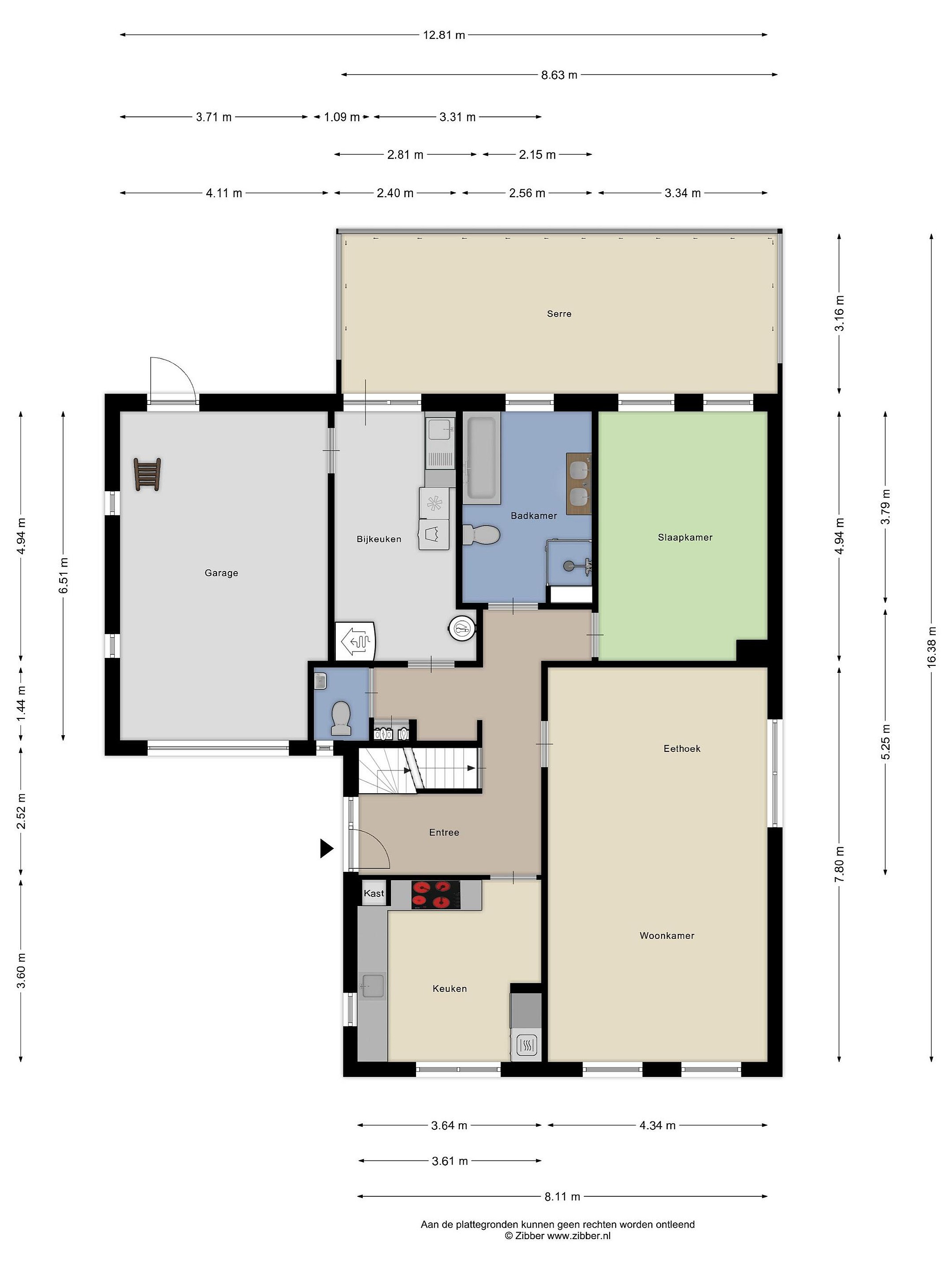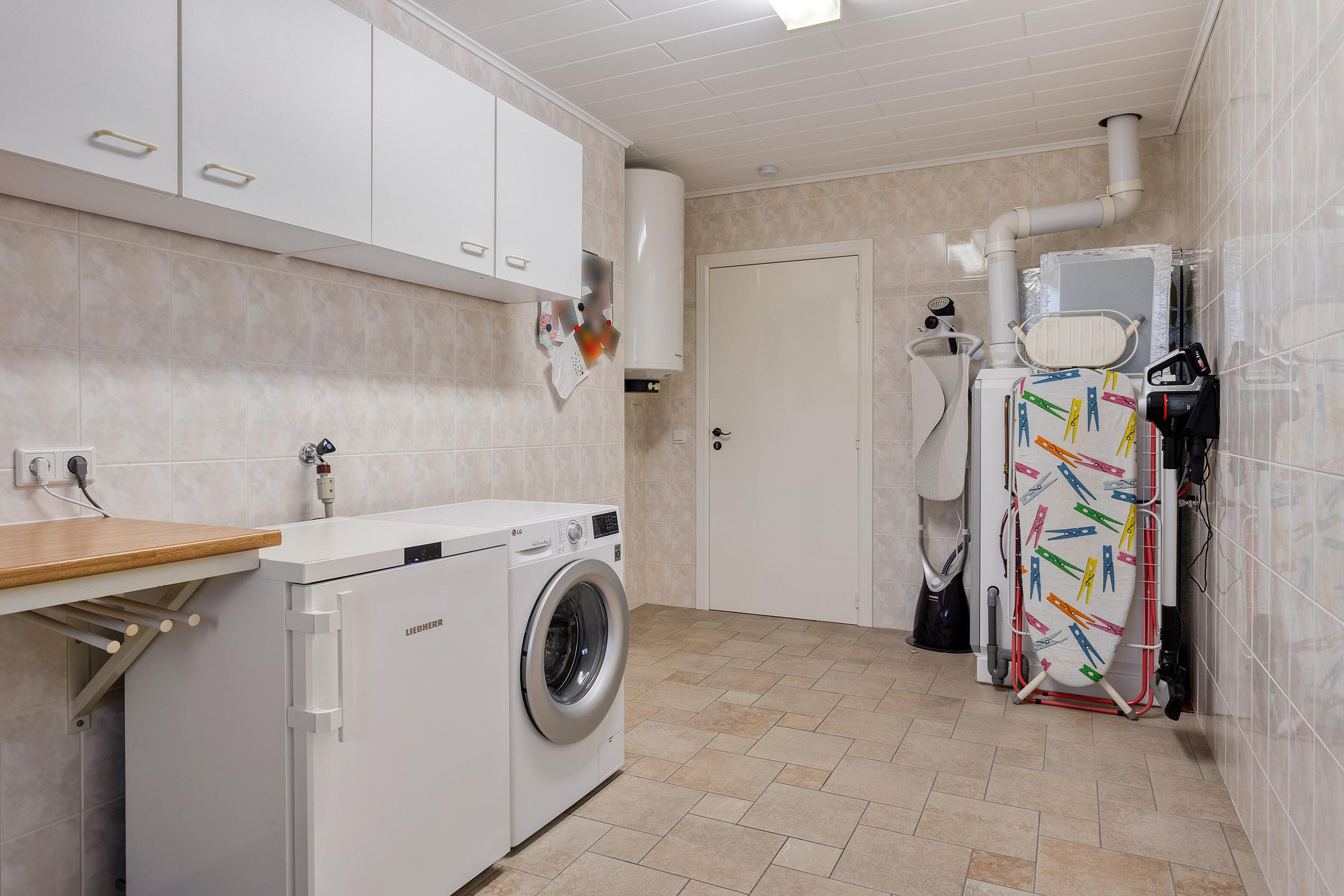 Aan de achterzijde is de bijkeuken (12m2) met aansluitingen voor wasmachine en droger, de verwarmingsketel (Brink 2018) en de boiler. Hier is ook de doorgang naar de garage (26m2) en naar de tuinkamer/serre (27m2). De badkamer bevindt zich aan de achterzijde van de woning en is voorzien van een ligbad, dubbel wastafelmeubel, douchecabine en toilet. Naast de badkamer is de slaapkamer (16.5m2).