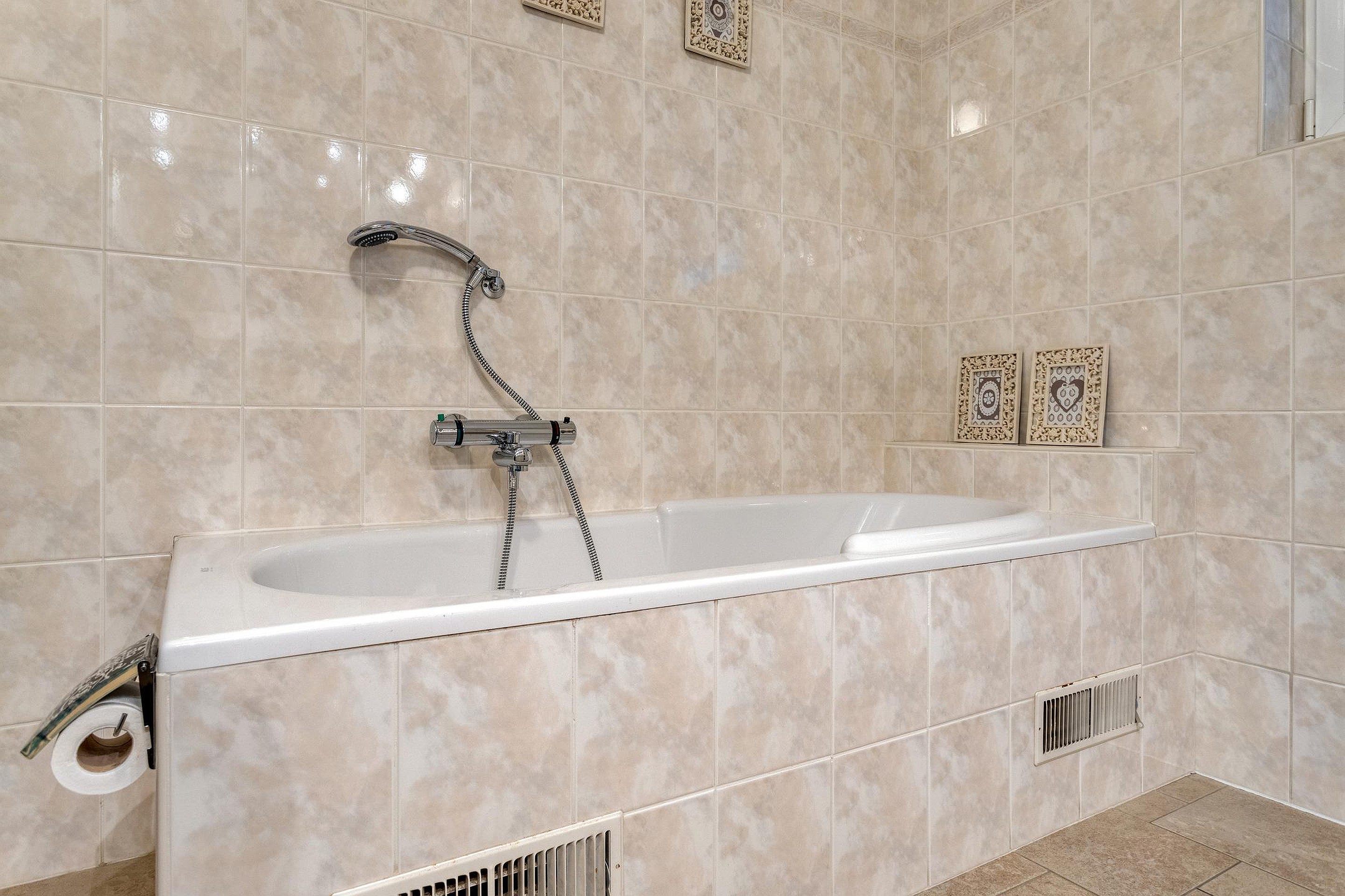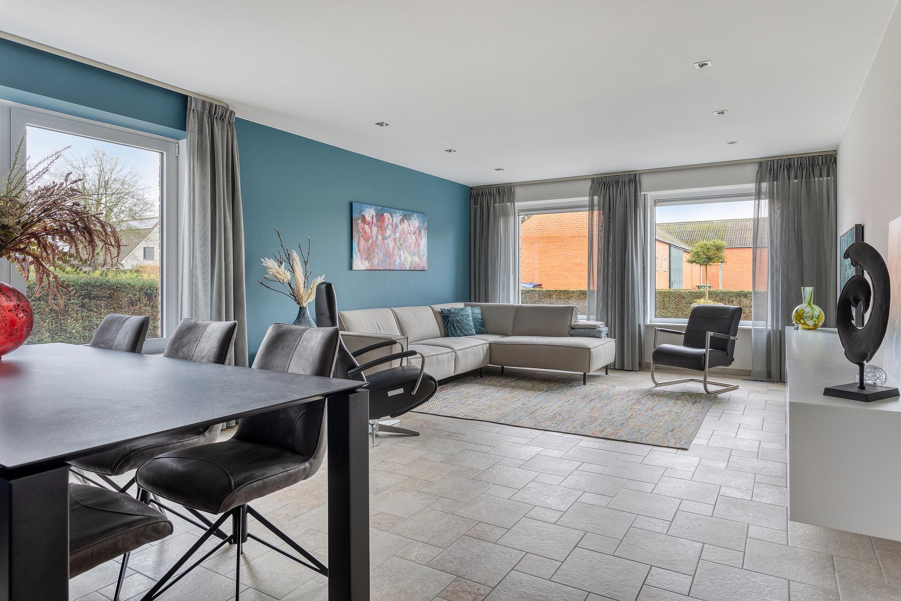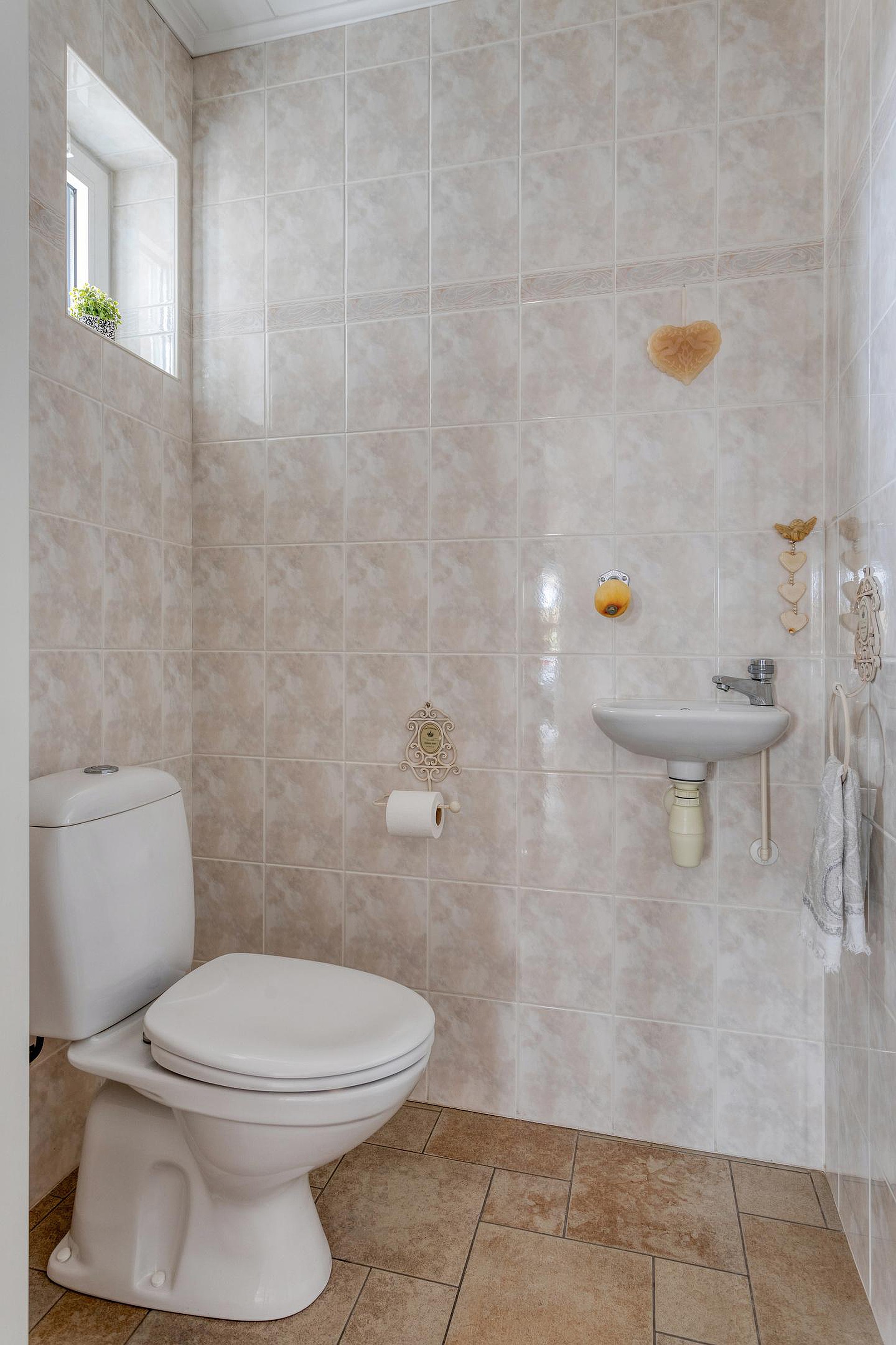 Nette tegelvloer op de begane grond, laminaatvloer op verdieping.