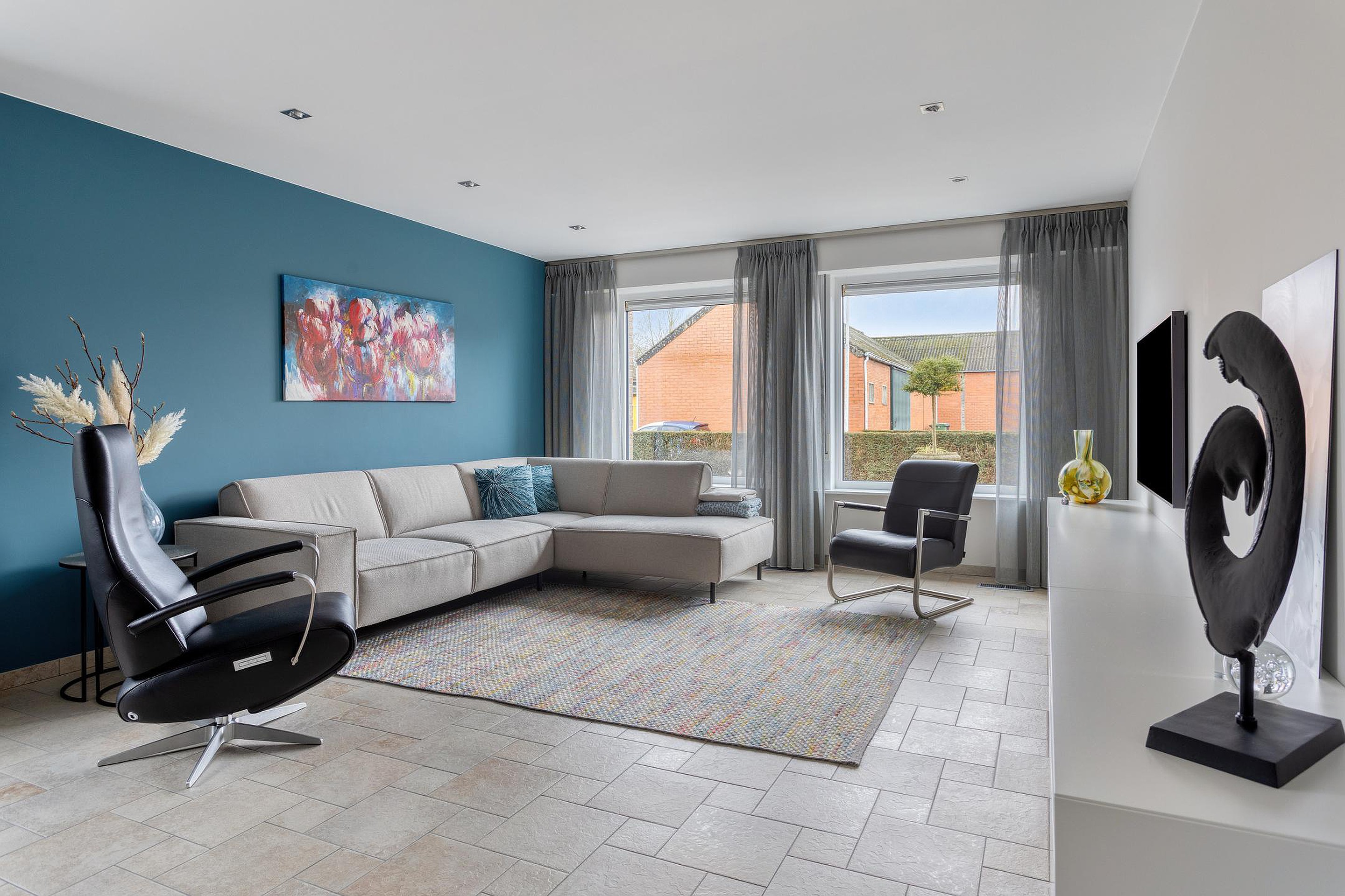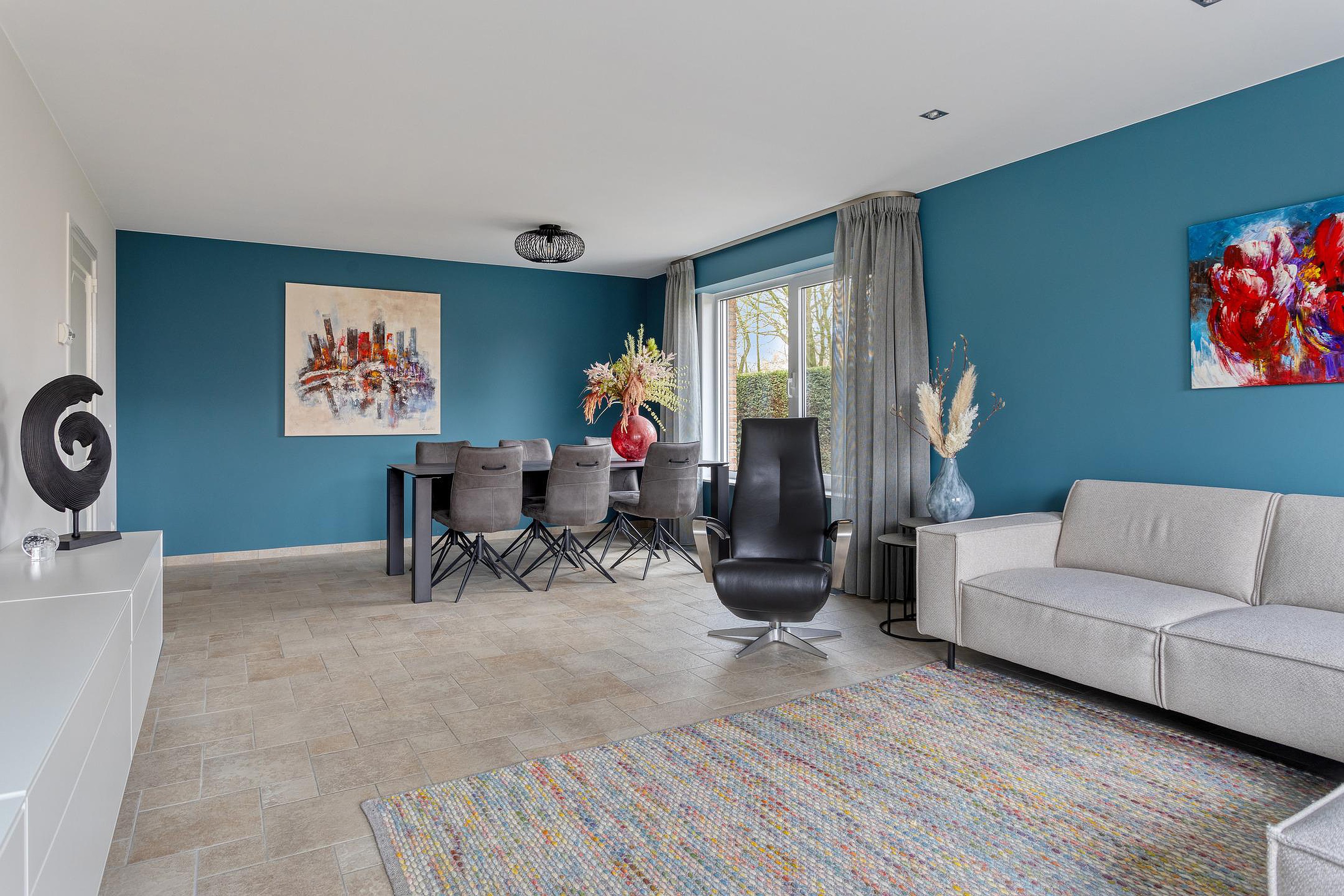 Ruime hal, toilet, meterkast (2018), kelderkast, trap naar de eerste verdieping en aan de voorzijde de keuken (13m2) en ruime woonkamer (34m2).