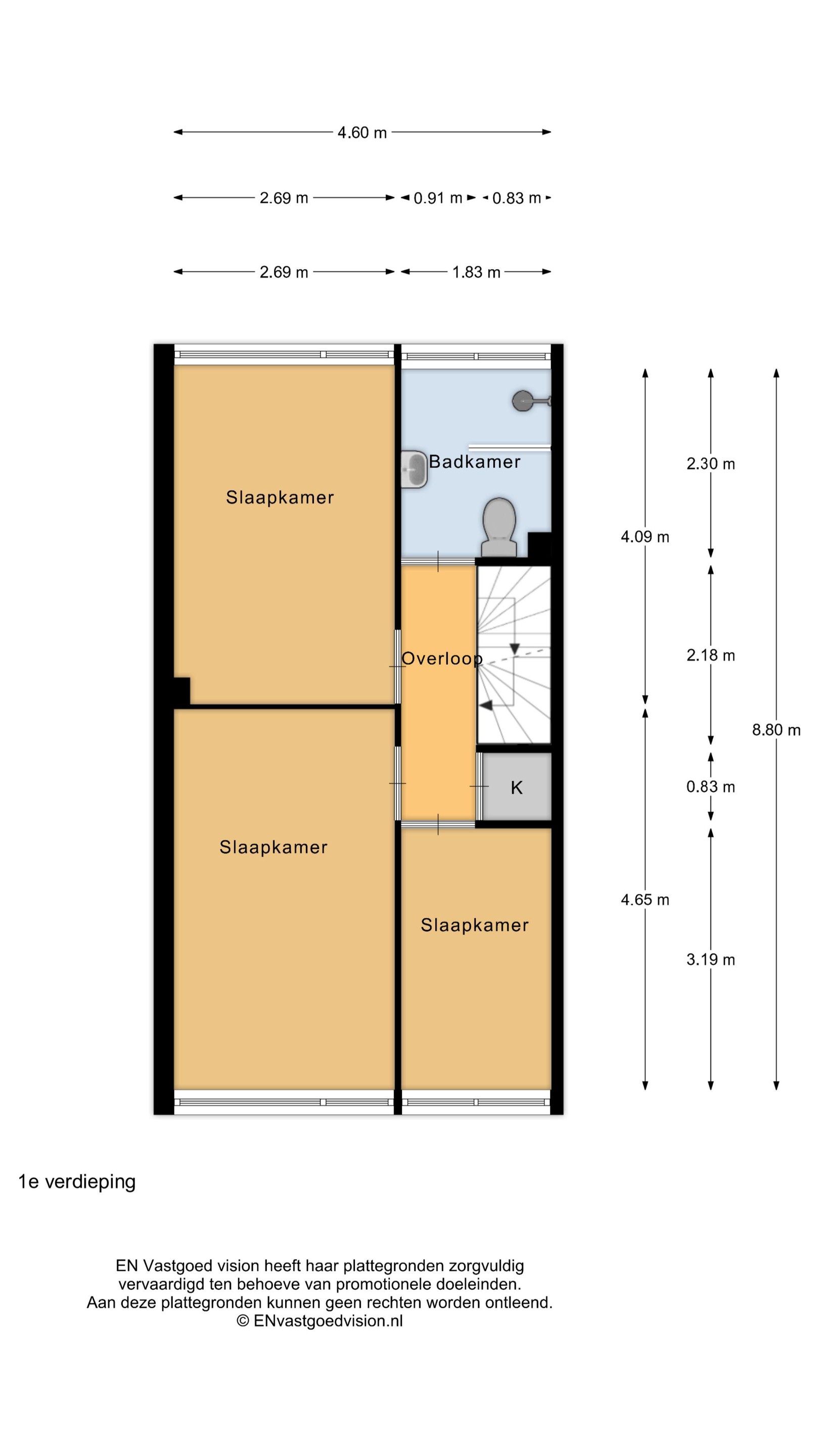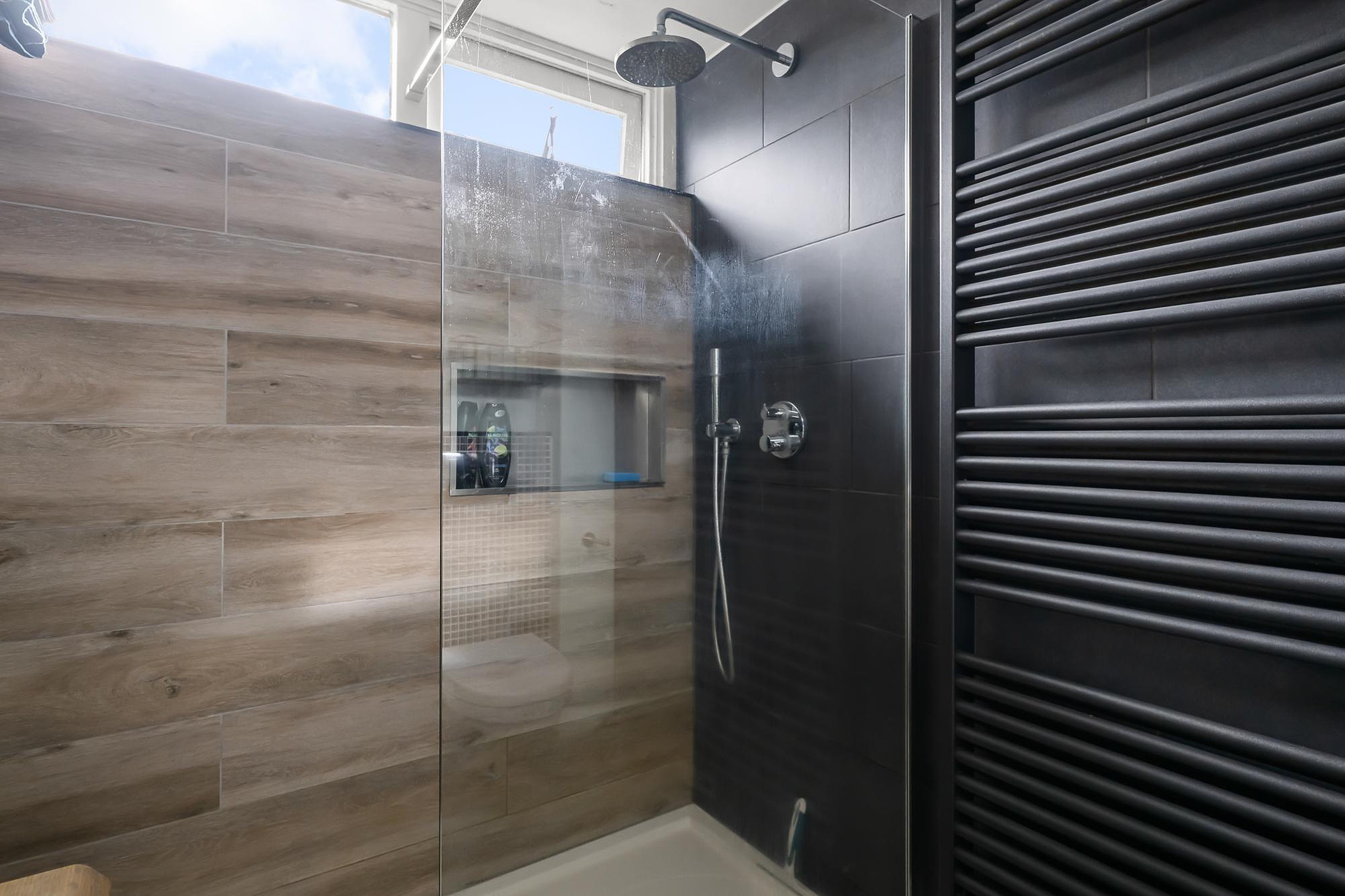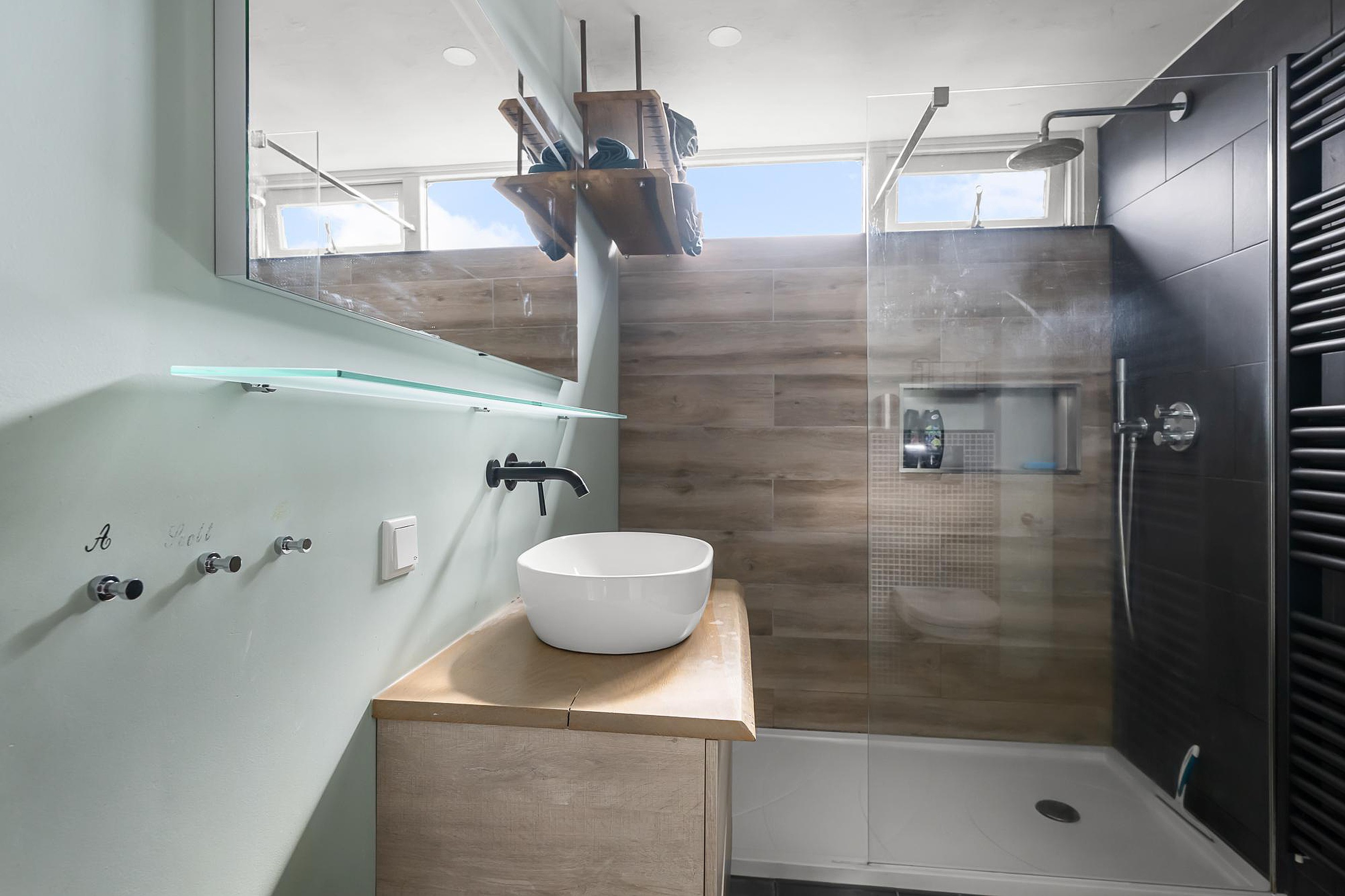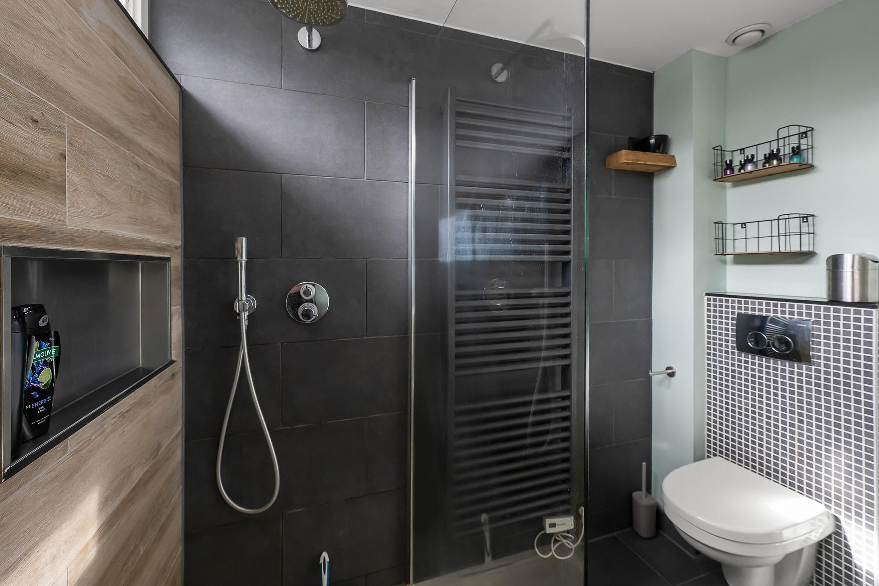 De trap naar de eerste verdieping is netjes afgewerkt en leidt naar een verdieping die eveneens volledig gestuuct is en voorzien van een fraaie vloer met hoge plinten. Hier bevinden zich drie goed bemeten slaapkamers en een moderne badkamer met inloopdouche, toilet en een stijlvol wastafelmeubel.