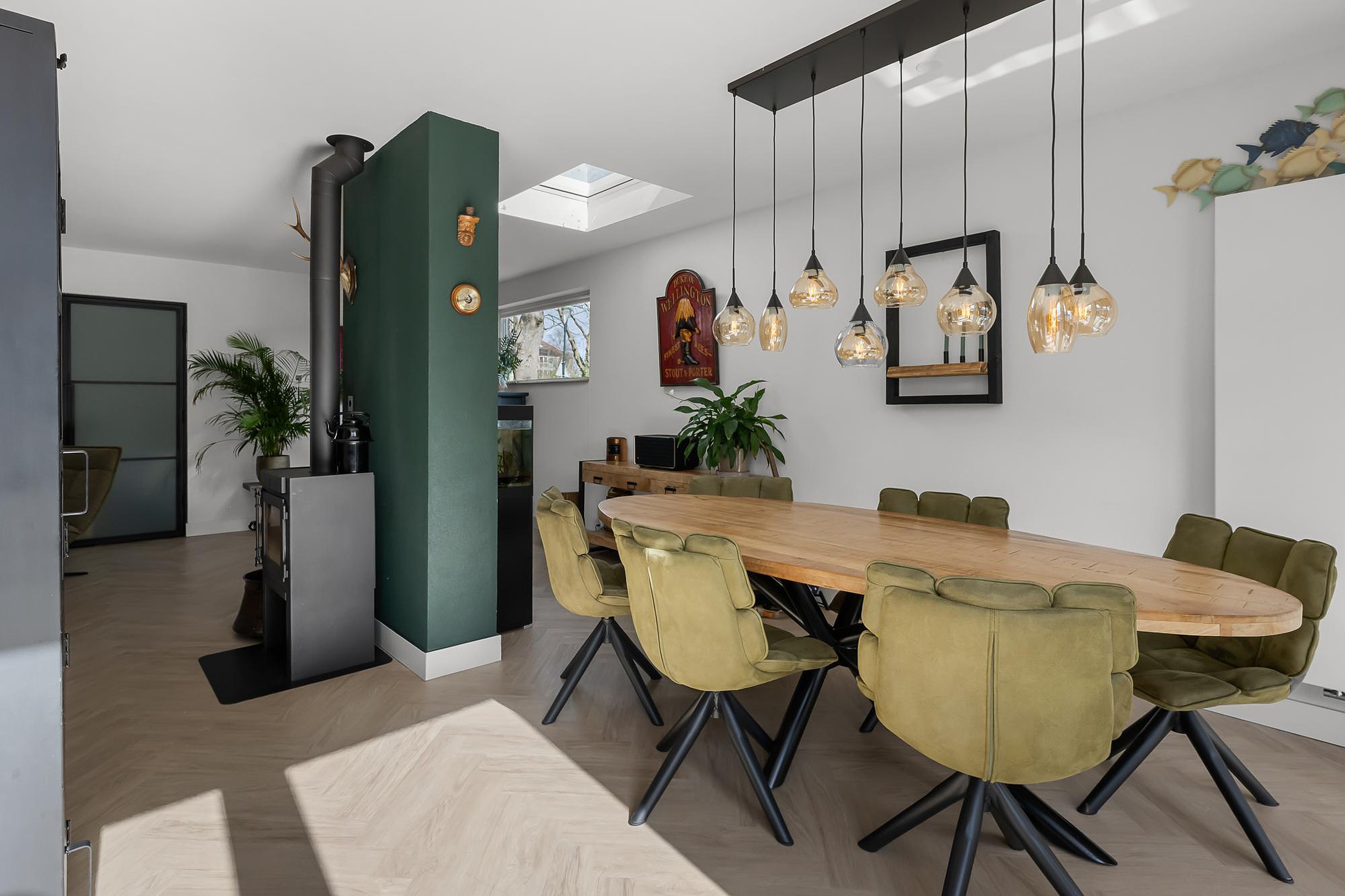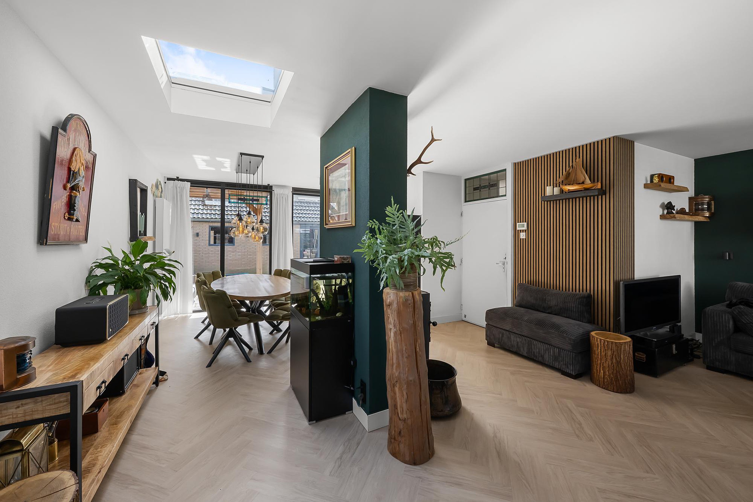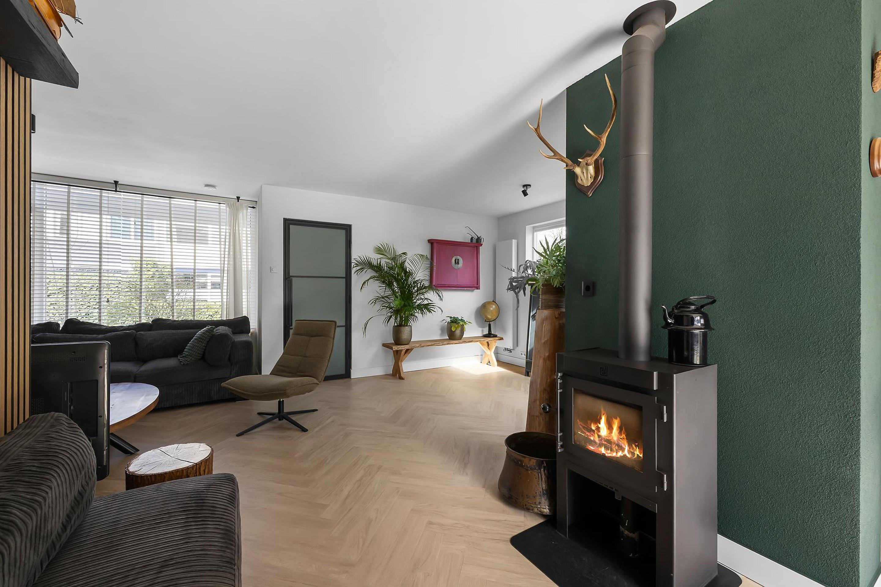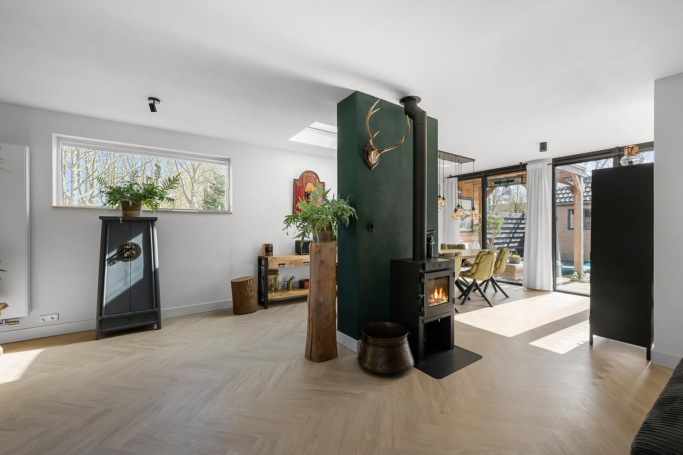 Bij binnenkomst valt direct de hoogwaardige afwerking op. De gehele benedenverdieping is strak gestuuct en voorzien van een keurige pvc visgraatvloer die zorgt voor een warme en moderne uitstraling. De royale woonkamer is heerlijk licht dankzij de grote raampartijen en de lichtkoepel, wat zorgt voor een aangename en open sfeer. De houtkachel maakt het geheel extra sfeervol en comfortabel.