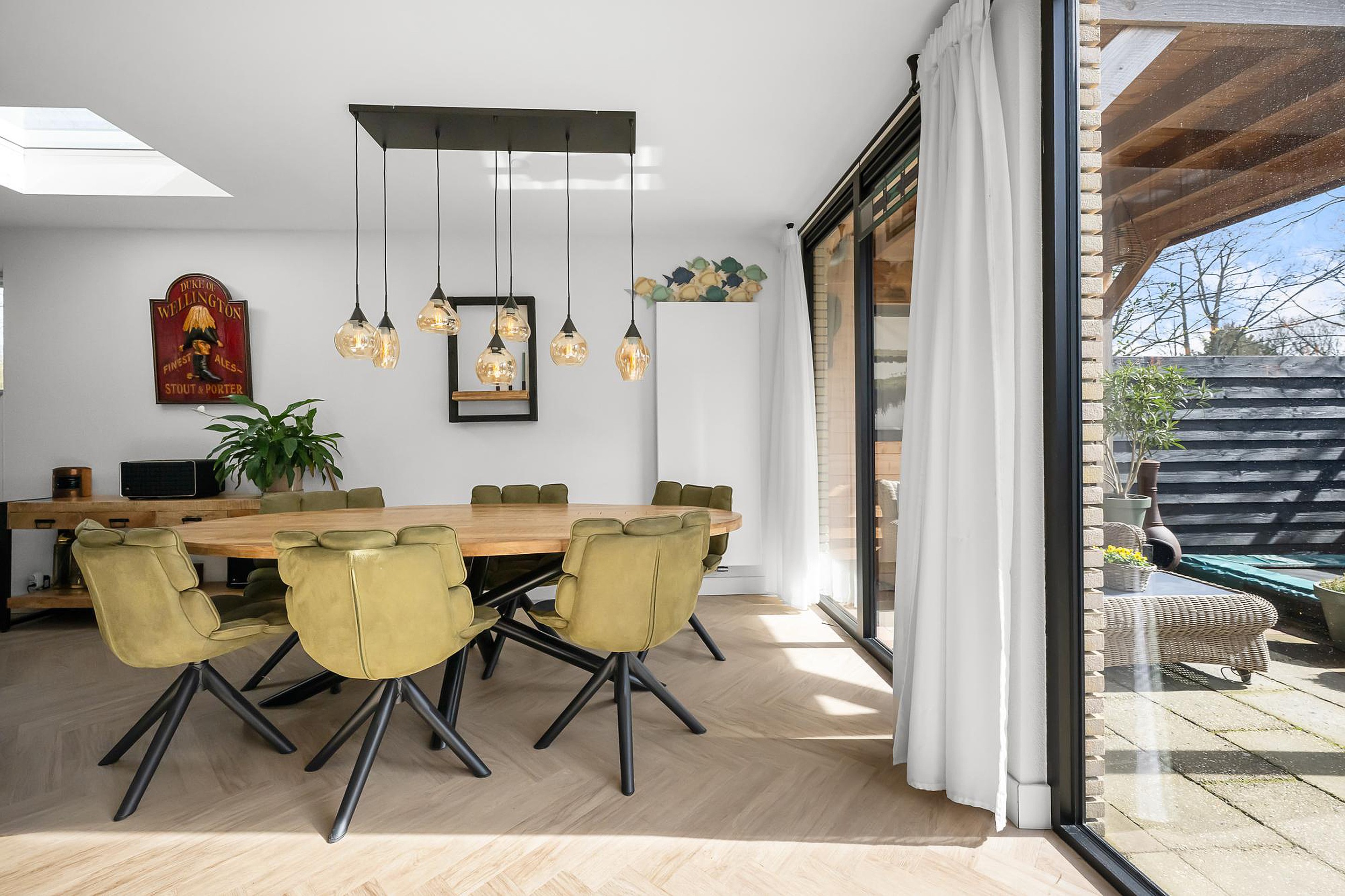 De moderne open keuken is van alle gemakken voorzien en beschikt over diverse inbouwapparatuur. Via de openslaande deuren bereik je de fraai aangelegde achtertuin. De tuin is gelegen op het zuiden, waardoor je de hele dag van de zon kunt genieten, en beschikt over een overkapping, een heerlijke plek om zowel in de zomer als in het voor- en najaar comfortabel buiten te zitten. Binnen en buiten lopen hierdoor naadloos in elkaar over, ideaal voor gezellige avonden en lange zomerse dagen.