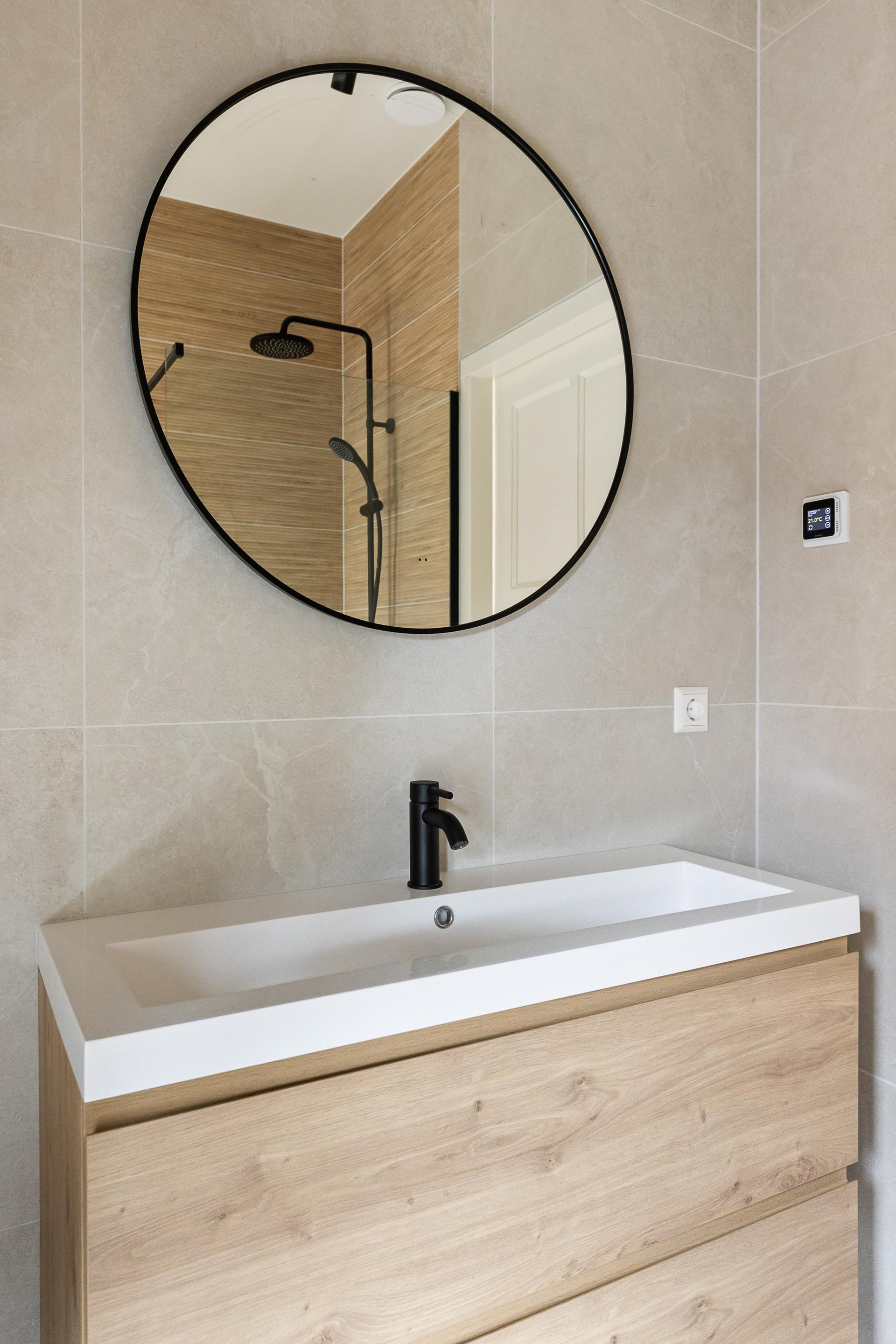Eerste verdieping overloop met houten vloerdelen en sfeervolle toiletruimte. Tweede badkamer voorzien van elektrische vloerverwarming, luxe inloopdouche met hand- en regendouche en een wastafel met meubel. 3 Slaapkamers (ca. 16 m2, ca. 10 m2 en ca. 11 m2) waarvan de kamer aan de voorzijde is voorzien van vaste kastruimte en houten vloerdelen en één kamer is voorzien van een pvc vloer met wasmachine- en drogeraansluiting en opstelling van de warmtepomp. Deze laatste kamer zou dienst kunnen doen als logeerkamer, kantoor en-/of kledingkamer. Vanuit deze kamer is er ook toegang tot het platte dak.