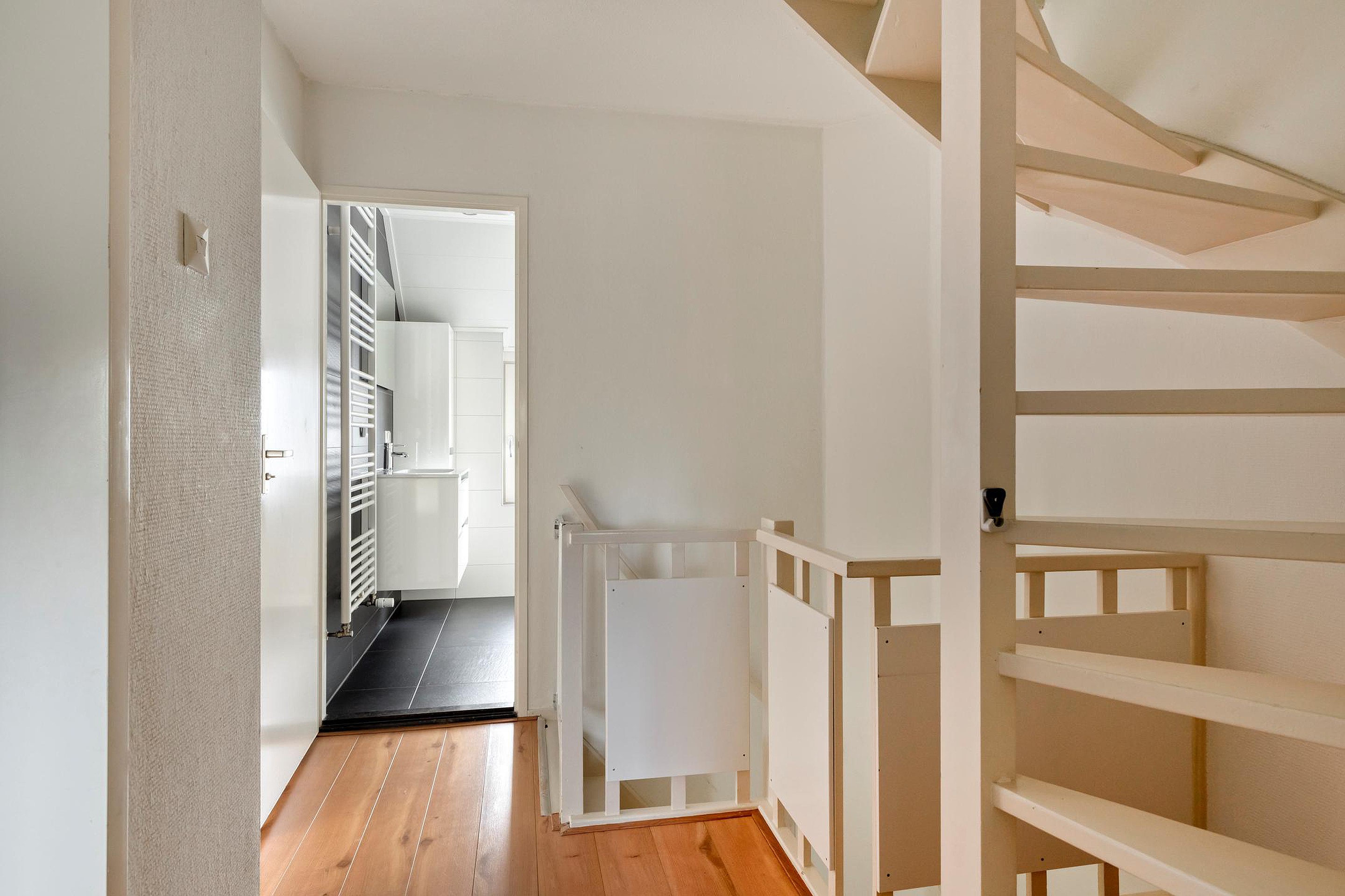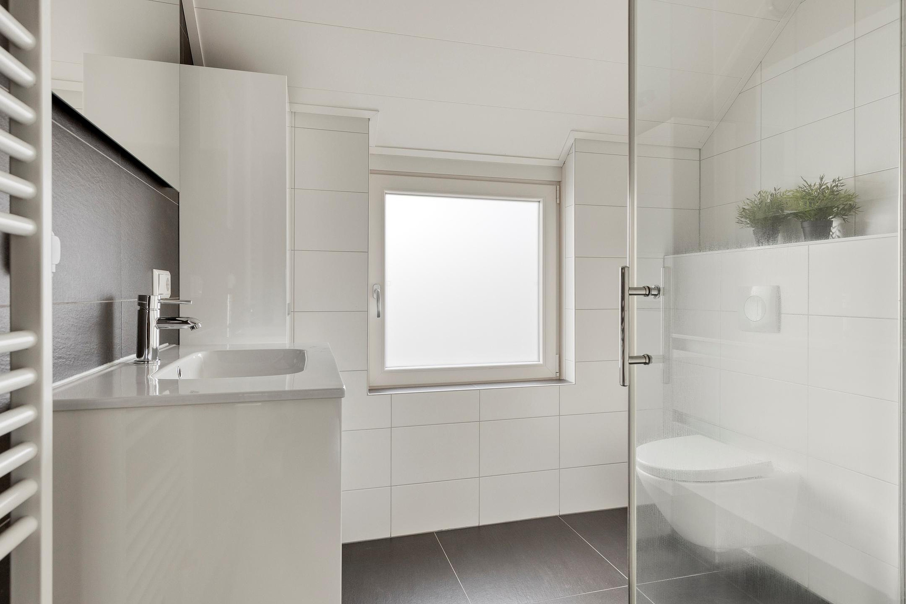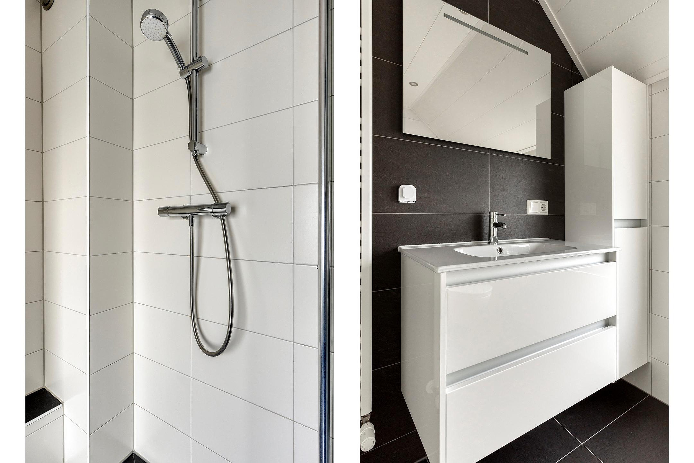 Vanuit de hal, via de trapopgang, bereikt u de overloop met toegang tot drie comfortabele slaapkamers met volle stahoogte, laminaatvloer én een in 2016 vernieuwde badkamer met douche, 2e toilet, wastafelmeubel en handdoeken radiator.