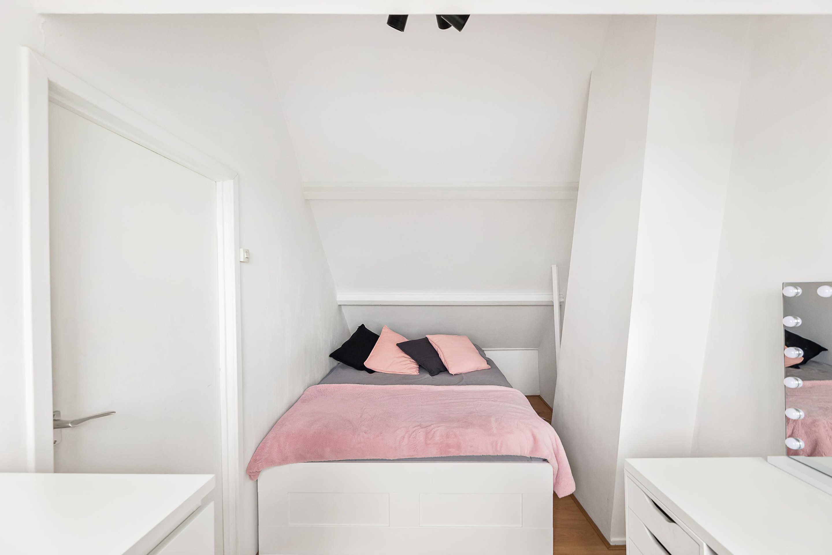 Eerste verdieping ruime overloop met wasmeubel (momenteel niet aangesloten) er zijn drie slaapkamers aanwezig (2 kamers van ca. 10 m2 en de middelste slaapkamer is ca. 7 m2). Deze slaapkamers zijn compact van formaat, maar functioneel.