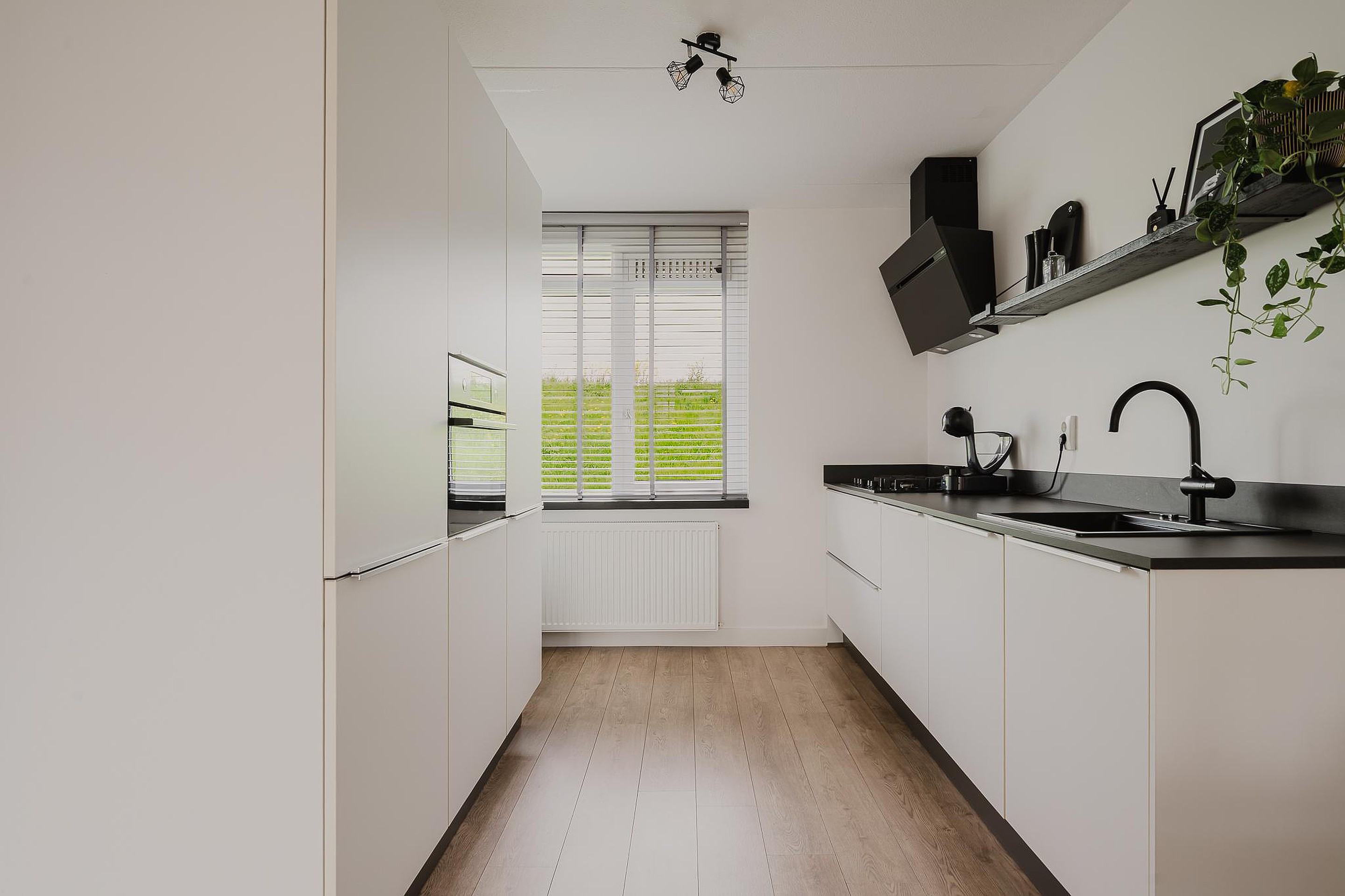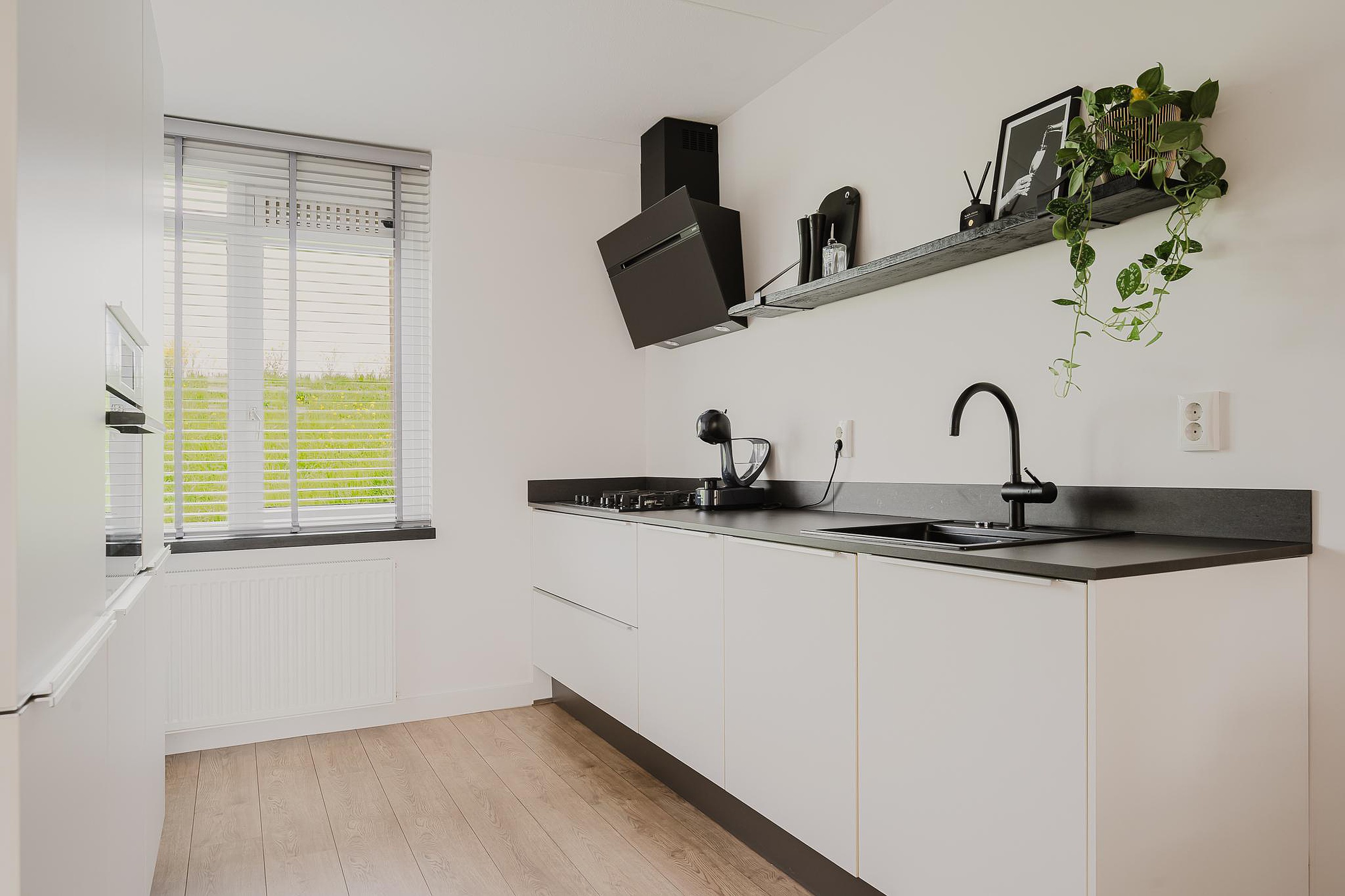 Aan de voorzijde van de woning bevindt zich de open keuken. Vanuit hier heb je een vrij en groen uitzicht op de dijk. De keuken is voorzien van inbouwapparatuur en voldoende kastruimte.