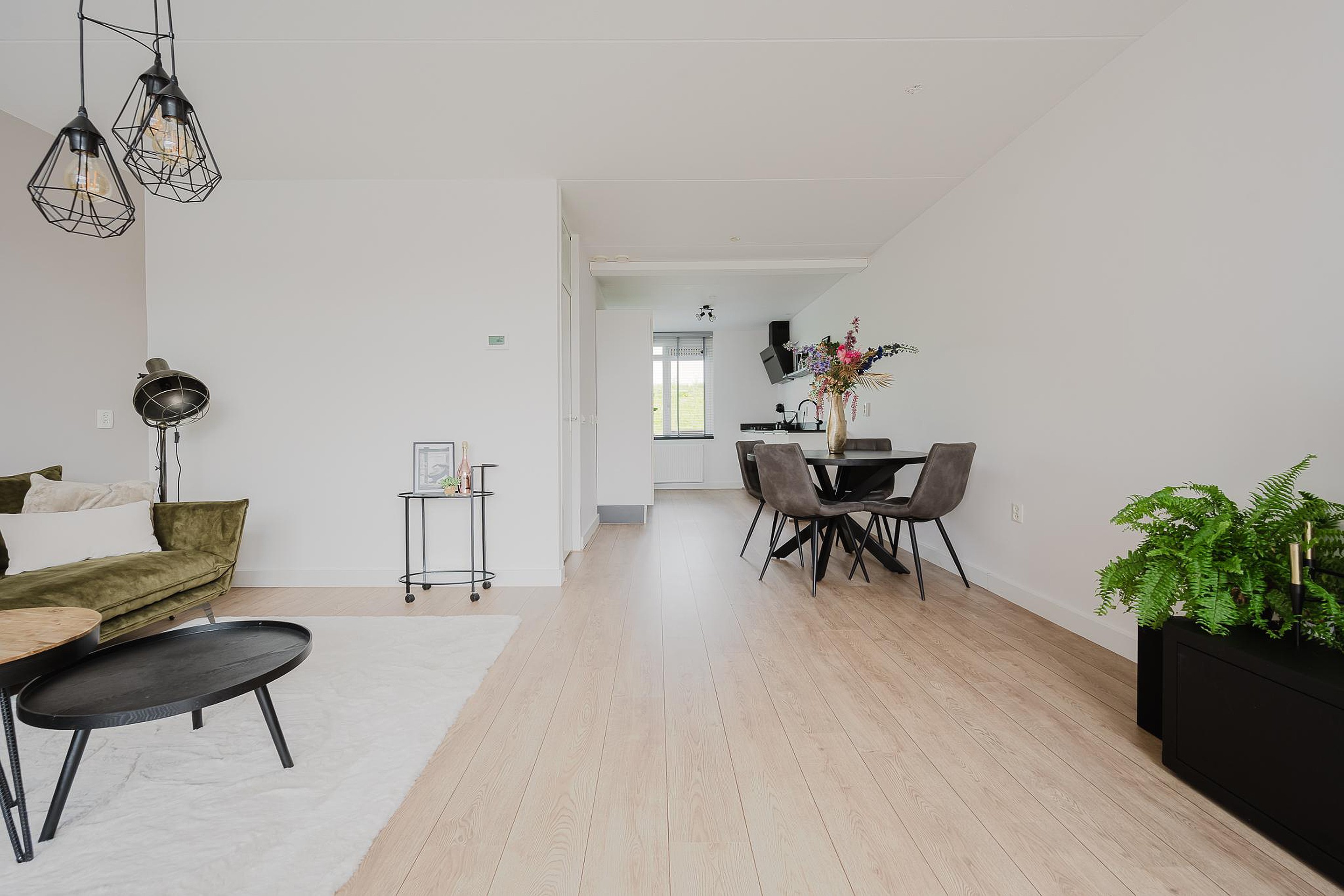 Vanuit de hal stap je de woonkamer binnen. De woonkamer is ruim en strak afgewerkt met een doorgelegde laminaatvloer en gestucte wanden. Vanuit hier heb je direct toegang tot de achtertuin.
