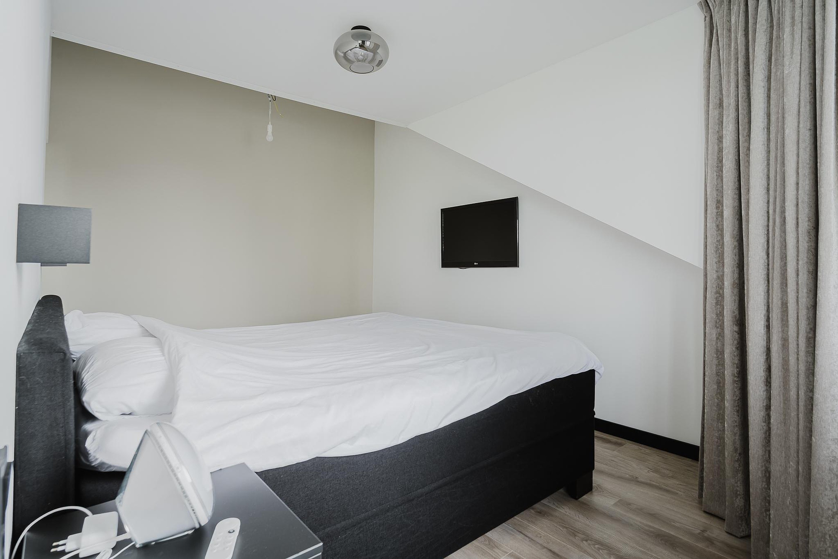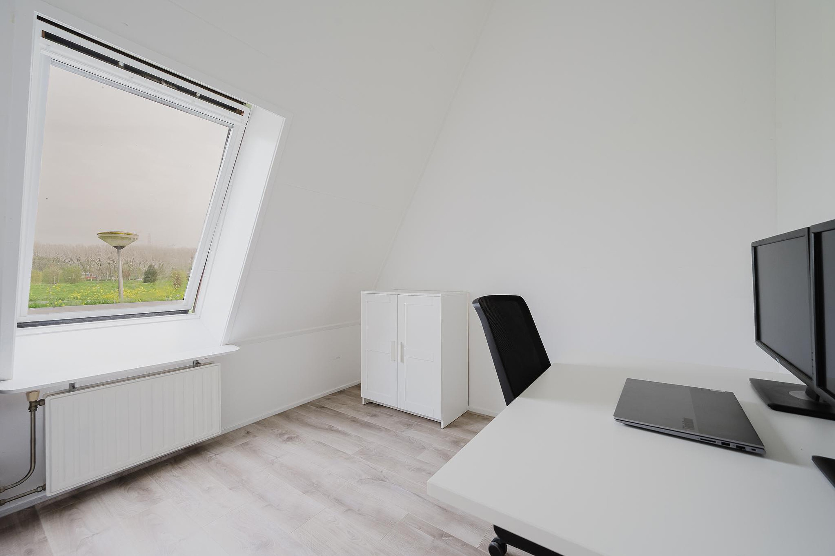 Aan de voorzijde vind je de eerste slaapkamer, voorzien van een groot dakraam en een prachtig vrij uitzicht.